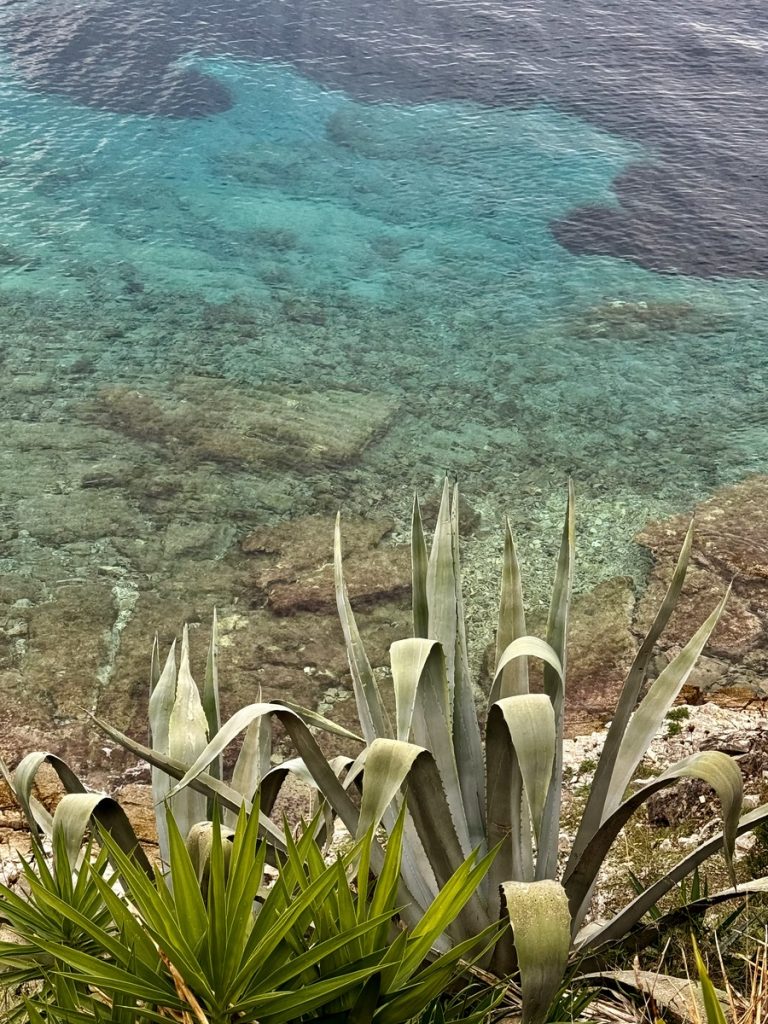 Auch der Wanderweg zur Bucht ist noch fast verwaist und wir genießen nach halber Strecke den Ausblick auf die beiden Buchten, bevor wir hinuntersteigen. Unten angekommen, hält uns nichts in unseren Klamotten. Wir steigen in die Badeanzüge und schwimmen hinaus ins „Aquarium“. Unter uns nur sandiger Meeresboden und kleine blaue Fische – herrlich! Im Anschluss suchen wir uns ein ruhiges Plätzchen am sich schnell füllenden Strand für unser Picknick, bevor wir den Aufstieg in Angriff nehmen. Nun wird es voller und voller. Es kommen uns mehrere Touristen in Flipflops oder Adiletten entgegen – na viel Spaß! Der Weg ist ziemlich steinig und durch den Regen der letzten Tage auch rutschig.