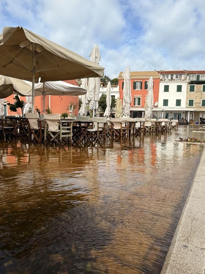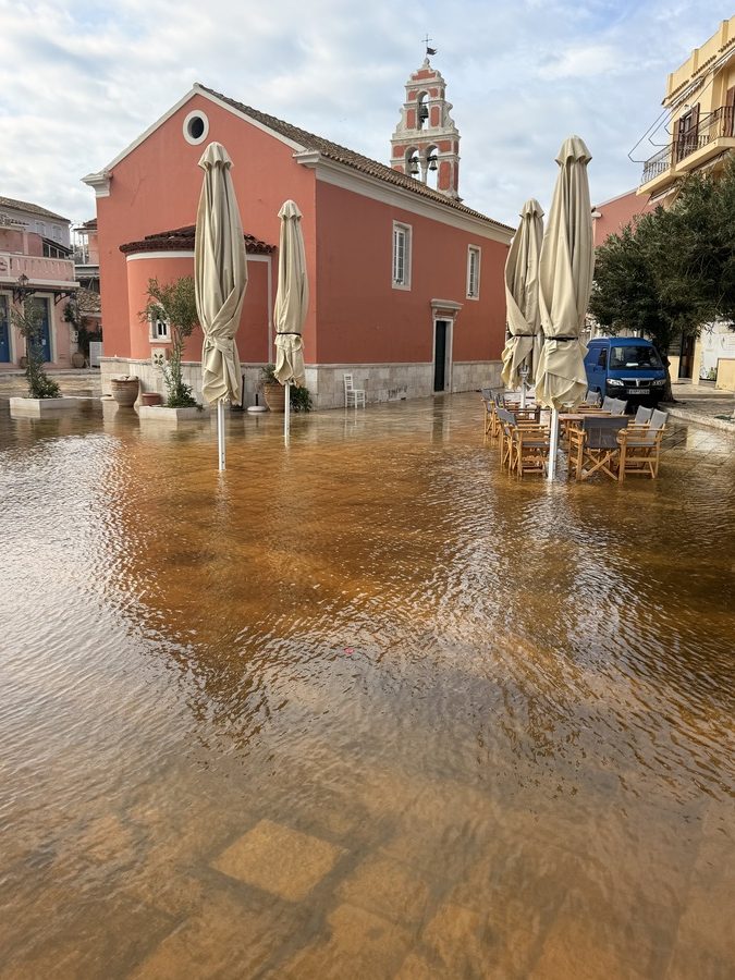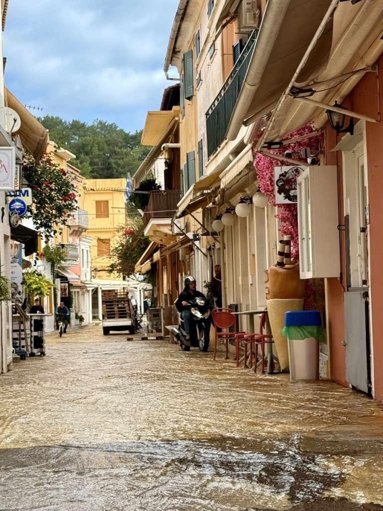 In Gaios ist ordentlich was los im Hafen. Der Schwell steht direkt rein und offensichtlich haben einige der Anker nicht gehalten und Boote beginnen zu driften. Fast alle scheinen daher aufbrechen zu wollen. Der zentrale Kirchplatz steht knöchelhoch unter Wasser. Der Bach wird hier nicht durch ein Rohr unter der Straße zum Meer geführt, sondern einfach oberirdisch durch die Gassen des Ortes. Hier auf dem Platz gibt es Gullis, durch die das Wasser dann in den Hafen gelangen soll. Aber offensichtlich sind sie unterdimensioniert. Die Griechen scheint das nicht zu stören, sie sitzen wir gewohnt in ihren Kaffeehäusern. Wir halten an einem kleinen Laden an der Promenade an, um etwas von dem Olivenöl von Paxos zu kaufen, das einen sehr guten Ruf genießt. Der Inhaber erzählt uns, dass er ca. tausend Bäume auf der Insel besitzt, die er von seinem Großvater übernommen hat. Anders als in Kalamata, werden die Oliven hier nicht von den Bäumen geschlagen, sondern man bedient sich der Hilfe des Windes. Ca. 4 Wochen dauert es, bis die Olivenhaine für die Ernte vorbereitet sind. Dafür muss der Untergrund von Unkraut gesäubert werden, damit die Netze ausgebreitet werden können. Der Wind erntet dann und die Olivenbauern müssen nur noch die Netze ausleeren. Klingt einfach, ist aber angesichts der steilen und unwegsamen Geländes trotzdem eine ziemliche Knochenarbeit. Insgesamt wachsen auf Paxos ca. 300.000 Olivenbäume, die überwiegend von den Venezianern im 16. Jahrhundert gepflanzt wurden.