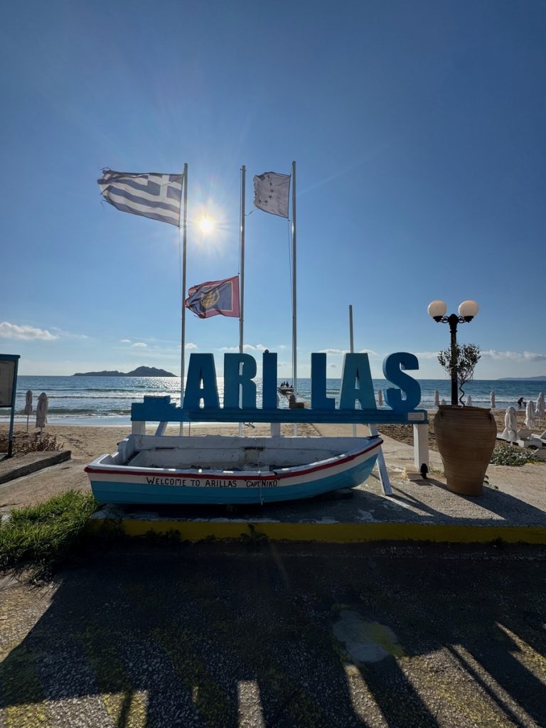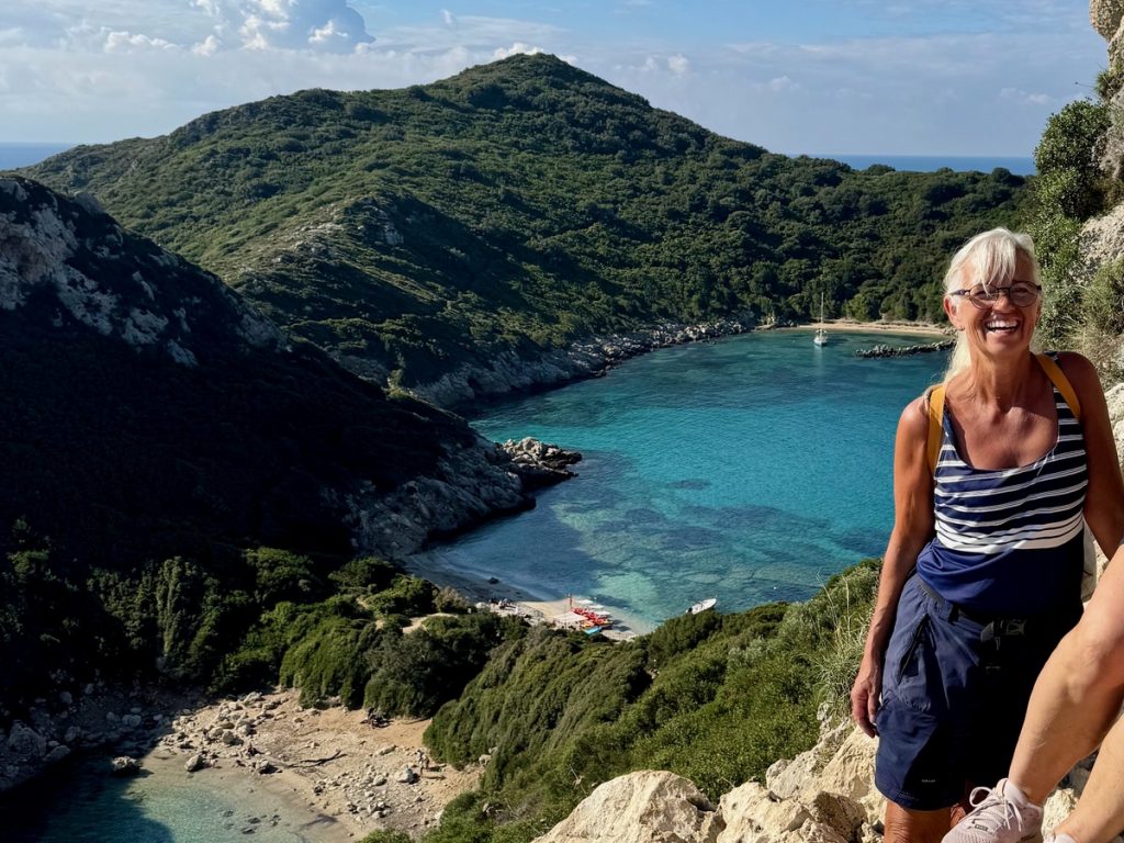 Den nächsten Stopp legen wir in Arillas ein, wo wir spontan auf eine Terrasse abbiegen, weil das Restaurant-Café Apple Pie und Cheesecake auf der Karte hat – leider ohne Preis. Nachdem wir Kuchen und Café genossen haben, kommt mit der Rechnung das dicke Ende: 42€ für drei Kuchen und drei Kaffee – das ist unerhört! Wir zahlen zähneknirschend und ärgern uns darüber, dass wir auf diesen Touristennepp hereingefallen sind. Zukünftig werden wir auch hier in Griechenland an touristischen Plätzen immer vorher nach dem Preis fragen, denn wenn wir den gewusst hätten, wären wir sofort wieder gegangen! Um die Gemüter zu beruhigen, geht’s erstmal wieder ins türkisfarbene Wasser, das uns hier fast mit einer Sylter Welle begrüßt.