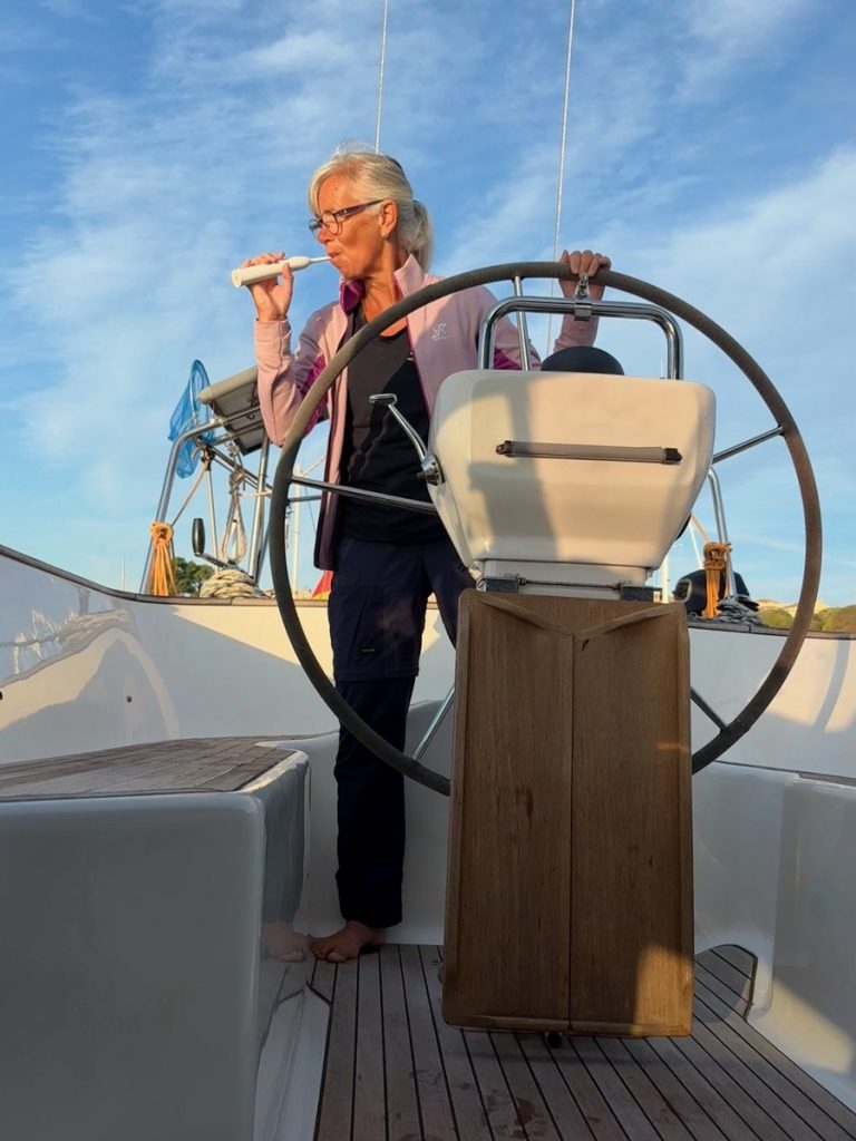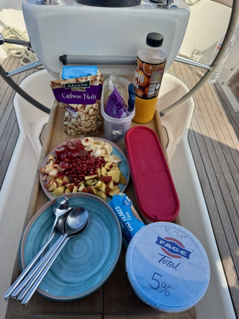 Nach 1,5 Wochen heißt es nun Abschied nehmen von Korfu. Die Insel hat viel zu bieten, insbesondere die Wanderwege haben es uns angetan. Auch die Stadt ist malerisch und pittoresk, aber uns ist es viel zu touristisch. Wir freuen uns auf ruhigere Buchten. Unser heutiges Ziel heißt Lakka auf der Insel Paxos. Bis dorthin sind es 25 Seemeilen. Da die ausgewählte Bucht sehr gern von Charterbooten angefahren wird, heißt es hier: „Der frühe Vogel…“. So lichten wir gegen 9:00 Uhr den Anker und starten ohne Wind unter Maschine. Im Laufe des Vormittags soll es Wind aus Osten geben. Das wäre ein toller Halbwindkurs. Aber leider kommt es anders. Der Wind dreht auf Nord und ist nur ein Hauch von 4-5 Knoten. Wir versuchen es trotzdem mit dem Segeln, aber der Schwell aus dem offenen Mittelmeer zwischen den Inseln bringt die Segel zum Schlagen und nimmt uns jede Fahrt. Also rollen wir wieder ein und laufen auch das letzte Stück unter Maschine. Unterwegs gibt es ein gesundes Frühstück: Müslibüfett!