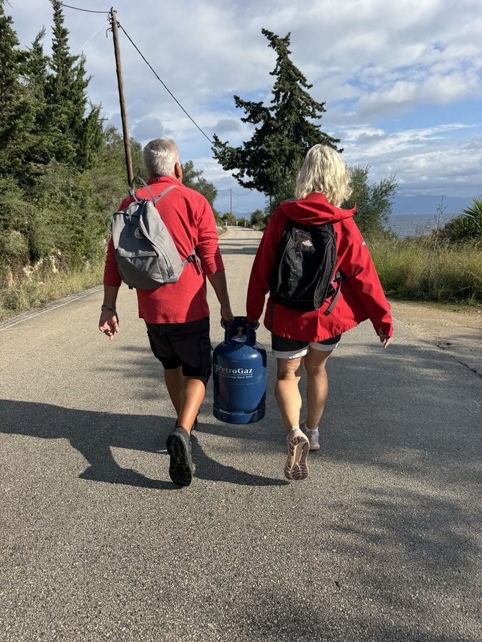 Nachts zogen einige Gewitterzellen durch, die zumindest bei Skipper und Skipperin für wenig erholsamen Schlaf sorgten. Zum Glück streifte uns das Gewitterfeld nur am Rand, das meiste ging weiter südlich durch. Etwas gerädert stehen wir gegen 8:00 Uhr auf. Draußen prasselt der Regen. Da wir kein Gas haben, können wir – zumindest auf herkömmliche Weise – keinen Kaffee kochen. Aber ohne Kaffee den Tag beginnen, das geht gar nicht. An Bord gibt es eine Nespressomaschine, die allerdings 220V benötigt. Der Ladestand der Batterie lässt es zu, dass wir mittels des Inverters die Maschine betreiben. So sind die Gemüter besänftigt. Wir diskutieren das weitere Vorgehen. Da die Skipperin (im Gegensatz zum Skipper) Bedenken anmeldet, heute eine Strecke von 30 Seemeilen bei über Nacht aufgebauter See an der Kreuz zurückzulegen, beschließen wir, noch einen Tag hierzubleiben. Leider passt das Wetter auch für keine der so empfohlenen karibischen Ankerbuchten von Antipaxos. Dort steht heute überall unangenehme Welle. Nachdem das letzte Regenfeld durchgezogen ist, machen wir uns also auf den Weg nach Gaios, um unsere Gasflasche zu tauschen. Zum Glück hat die leere Flasche zwei Griffe und lässt sich somit zu zweit ganz gut tragen. Auf halber Strecke hält ein netter Grieche mit seinem Roller an und bietet uns an, die Flasche zur Tankstelle zu fahren. Da sagen wir nicht nein. Er platziert die Flasche zwischen seinen Beinen und nimmt die dort bereits liegende Kuchenschachtel unter den Arm – ein Bild für die Götter, aber wir sind super dankbar!