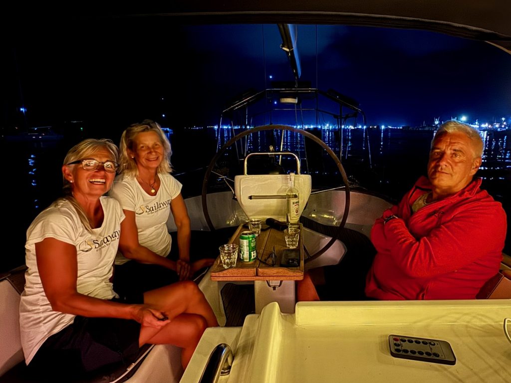 Am späten Nachmittag erreichen wir die betonte Einfahrt nach Preveza und wenig später den uns und dem aufmerksamen Lesenden bereits gut bekannten Ankerplatz. Nachdem Vengas! Anker gut eingefahren ist und zuverlässig hält, machen wir das Dinghi klar und fahren zum Abendessen in den Ort zu einer uns schon mehrfach empfohlenen Taverne an der Hafenpromenade. Das Essen ist wirklich gut und es gibt noch ein Dessert auf Kosten des Hauses dazu. Wir sind alle „genudelt“ und brauchen einen Ouzo, den aber dann im Cockpit. Es wird ein feucht-fröhlicher Abend und die Ouzoflasche ist am Ende irgendwie leer…