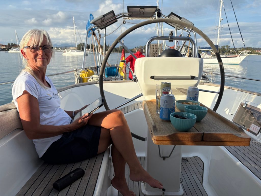 Bei der Rückkehr zu unserer Ankerbucht staunen wir nicht schlecht. An der fraglichen Pier liegt eine weitere Fottille von Sailing Holiday mit letztlich 13 Booten. Am Dinghi treffen wir auf zwei Crews, die uns berichten, sie müssten jetzt zum Abendessen nach Gaios, hier sei ja nichts mehr offen. An Bord wird also wohl eher nicht gekocht! Ganz anders bei uns: Zurück an Bord, macht Moni sich an die Vorbereitung des Abendessens, während Skipper und Skipperin in die Fluten springen und das warme Wasser zum Duschen nutzen. Sie sind kaum abgetrocknet und frisch gekleidet, da vermeldet Moni, dass der Herd nicht mehr funktioniert. Die Gasflasche ist leer – hätten wir sie doch in Korfu getauscht! Nun wird alles eingetuppert und die Küche bleibt heute kalt. Es gibt zwar eine elektrische Heizplatte an Bord, aber mit der würden wir hier vor Anker unsere Batterie zu sehr entladen. Morgen wird es bedeckt sein und die Solaranlage nicht ausreichend nachladen können. Zum Glück ist der Kühlschrank gut gefüllt und mit griechischem Salat und Thunfischsalat zaubern wir noch leckere Ergänzungen zum Abendbrot. Morgen müssen wir schauen, ob wir in Gaios eine neue Gasflasche bekommen.