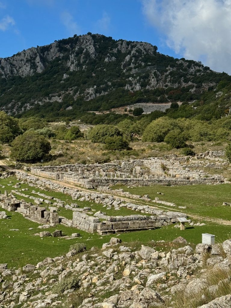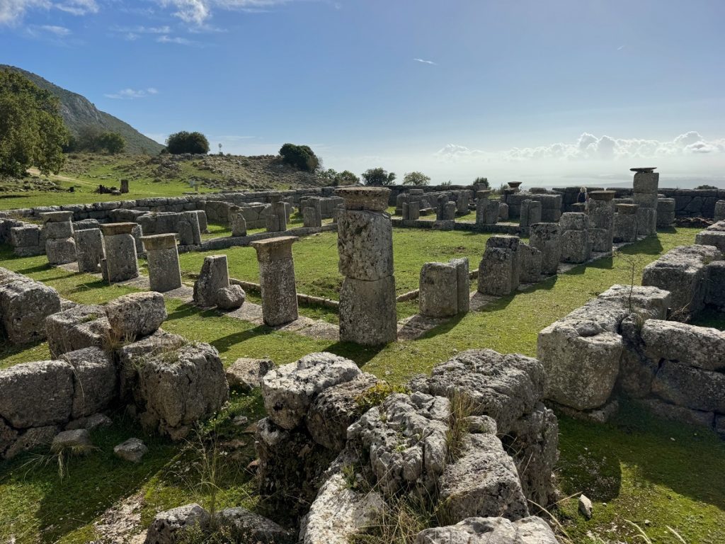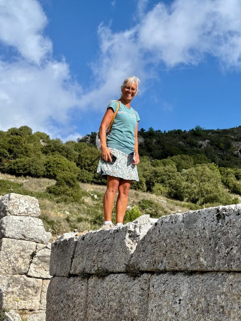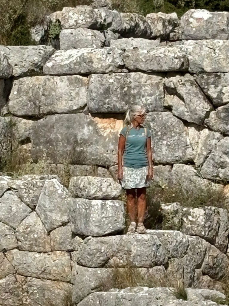 Leider ist es heute recht diesig und so können wir im Dunst zwar den Ambrakischen Golf und das Ionische Meer erkennen, aber die hohen Berge auf der Insel Lefkada sind nur schwer auszumachen. Wir nehmen uns sehr viel Zeit, die Informationstafeln zu studieren und den Ort auf uns wirken zu lassen. Im Amphitheater lassen wir uns das unterwegs gekaufte Picknick bei absoluter Ruhe (ausgenommen Vogelgezwitscher) und mit herrlichem Rundumblick (trotz Dunst) schmecken. Im Anschluss führt uns der Weg noch zu einem der Stadttore und Resten der Stadtmauer sowie zu einer Grabstelle, in der man noch gut den alten Wandputz erkennen kann. Dann geht es zurück zum Auto. Wir wollen noch ein Stück den Berg hinauffahren, denn auf einem nahegelegenen Gipfel haben wir schon aus der Ferne ein Monument bemerkt, dass wir uns aus der Nähe ansehen wollen.