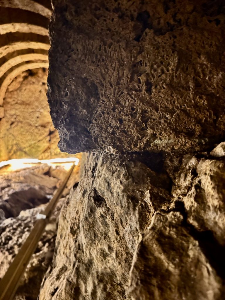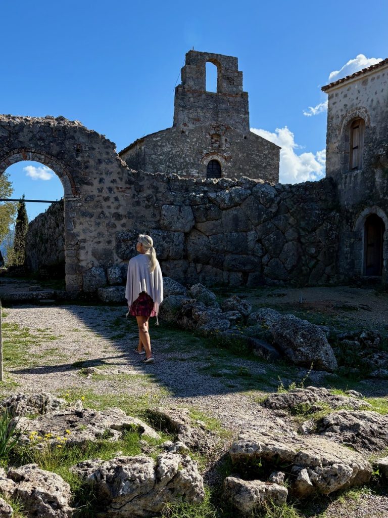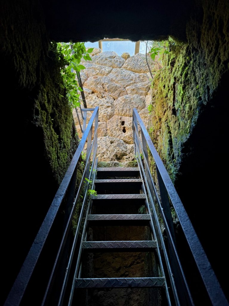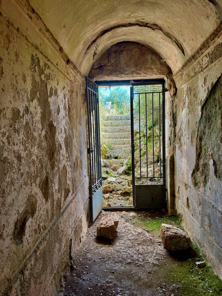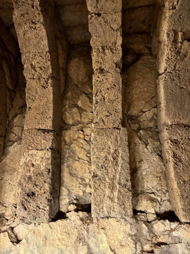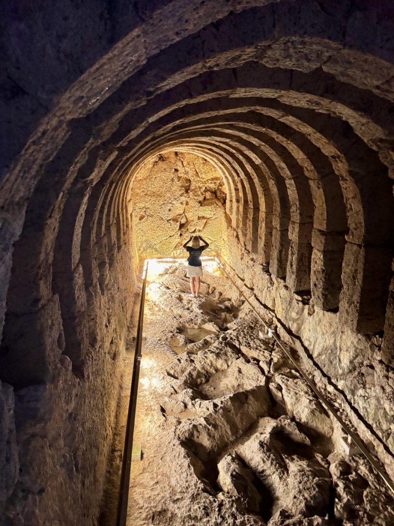 Erstes Ziel ist die Ausgrabungsstätte Nekromateion. Nach der These ihres Entdeckers, dem griechischen Archäologieprofessor Sotiris Dakaris, handelt es sich dabei um das einzige Totenorakel Griechenlands. Unter den Ruinen der im 18. Jahrhundert erbauten Kirche Johannes des Täufers entdeckte er bei Ausgrabungen 1958 Gebäudestrukturen mit über drei Meter dicken Mauern. Gefundene Baureste werden überwiegend dem 3-4. Jahrhundert v.Chr., vereinzelt sogar dem 7. Jahrhundert v.Chr. zugeordnet. Dakaris interpretierte die freigelegten Strukturen als das Zentrum des Totenorakels von Ephyra, das von Homer und Herodot in der Literatur erwähnt worden war, dessen genaue Lage aber bis dahin unbekannt blieb. Andere internationale Achäologen zweifeln die These inzwischen zwar an und sehen in den Funden eher einen befestigten Adelssitz aus hellenistischer Zeit. Aber die griechische „Vermarktung“ der Stätte fokussiert das Todesorakel – passt es doch einfach zu gut zum in der Nähe fließenden Fluss Acheron, der ebenfalls in seiner Schlucht das Tor zur Unterwelt beheimaten soll. In jedem Fall handelt es sich um eine beeindruckende Ausgrabung. Insbesondere die untere Etage fesselt uns. Über eine schmale Stahltreppe steigen wir in ein dunkles Loch, dass sich zu einer Halle mit erstaunlichen Ausmaßen (22m2 mit einer Höhe von 4,5 Metern) öffnet. Die Decke wird von mehreren steinernen Bögen getragen, die auf ausgehauenen Felsen ruhen. Wir fühlen uns ziemlich klein im Vergleich zu dem, was Menschen hier vor ca. 2.500 Jahren ohne die heutige technische Hilfsmittel geschaffen haben.