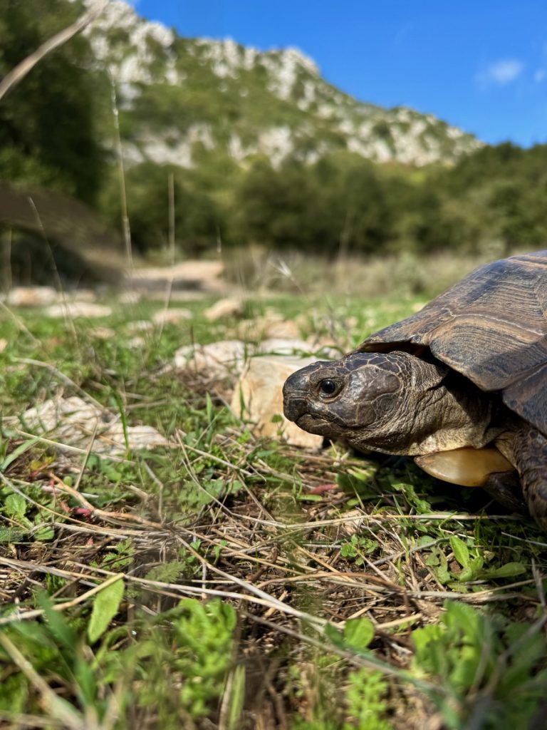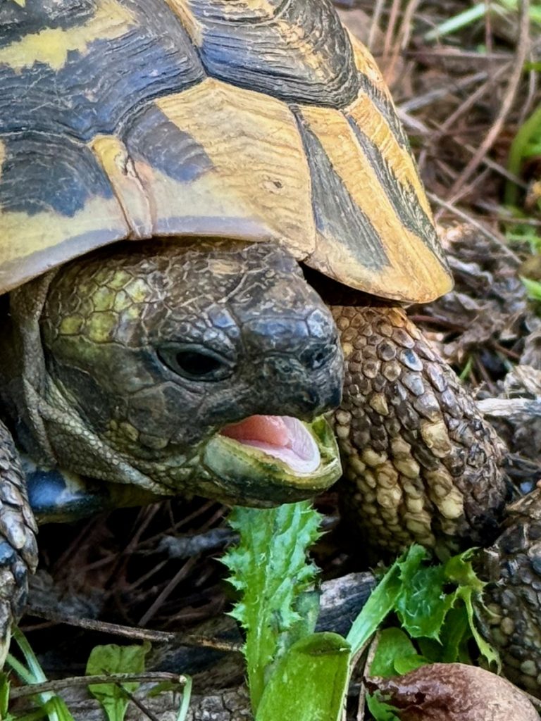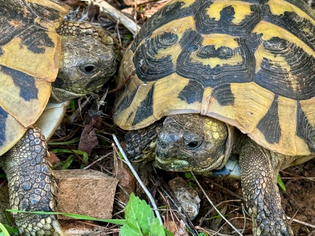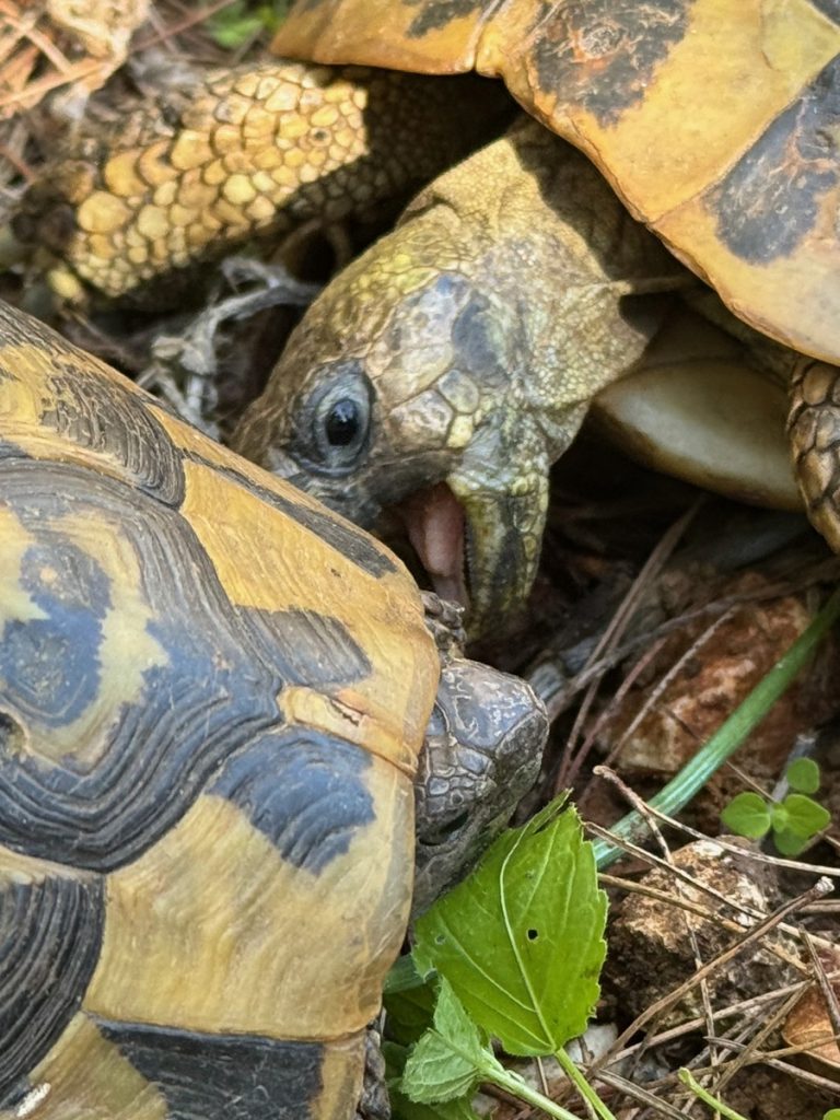 Auf einem Rundweg um die Anlage werden wir von kämpfenden Schildkröten in den Bann gezogen. Wir erlesen uns, dass die männlichen Tiere um Territorium oder um Weibchen kämpfen. Da wir nur zwei Tiere sehen, gehen wir davon aus, dass es um Dominanz im Territorium zwischen zwei Männchen geht. Die Tiere umkreisen sich und schnappen nach den Beinen und Schwänzen des Gegners. Oder sie rammen sich gegenseitig mit dem Panzer und versuche so den Kontrahenten auf den Rücken zu drehen. Von uns Zuschauern lassen sie sich dabei überhaupt nicht stören. Es ist ein besonderes Erlebnis diese „alten“ Tiere an einer so alten Ausgrabungsstätte zu beobachten.