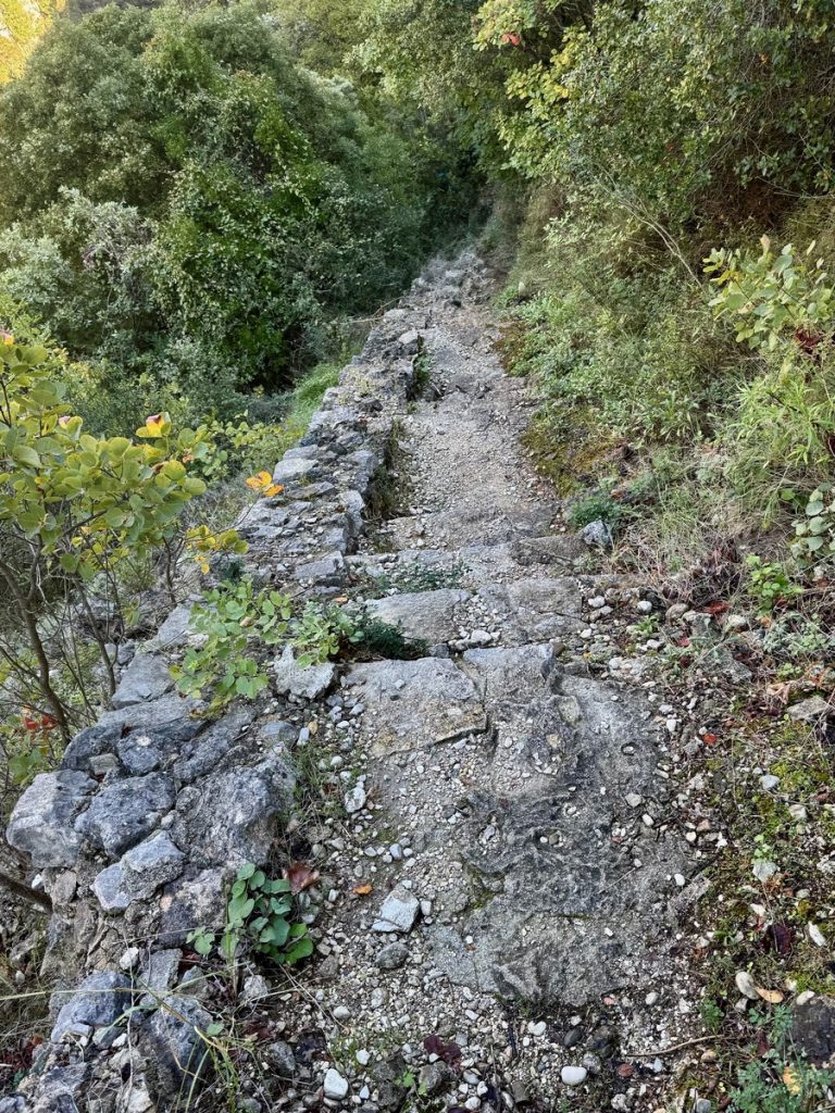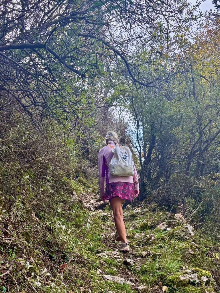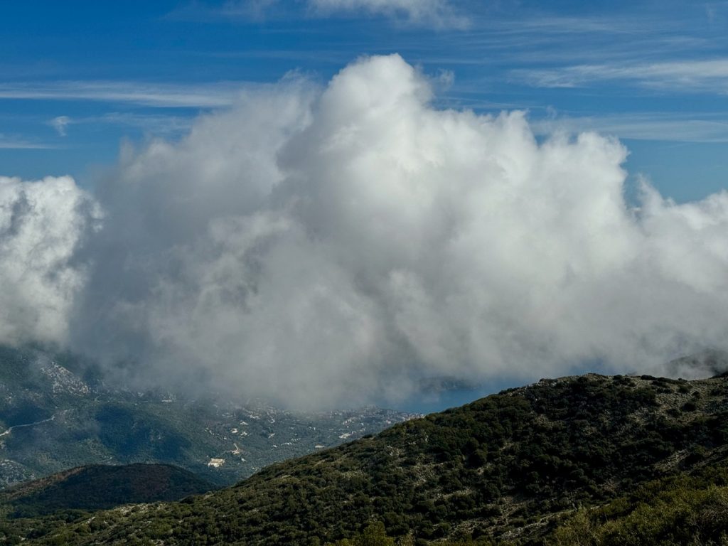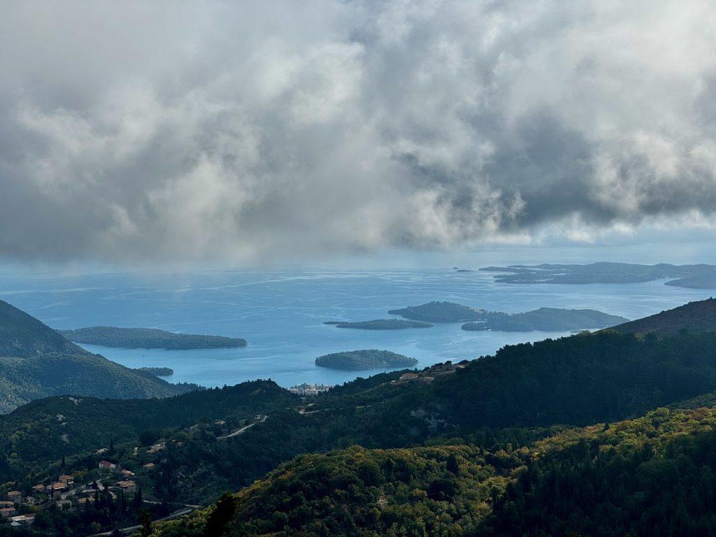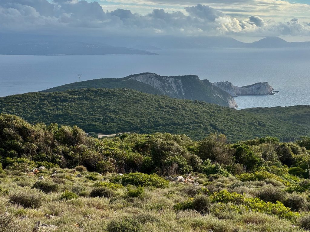 Wir haben bei Komoot eine Rundwanderung geplant, die uns verschiedenen Gipfeln sehr nahe bringt. Auf einigen stehen Sendeanlagen und können nicht betreten werden. Uns geht es nicht darum, Gipfel zu sammeln. Wir wollen uns sportlich betätigen und nebenbei die Natur und die Ausblicke genießen. Komoot hat die Route als schwer bezeichnet und ein Teilstück als „gefährlich“. Das hat allerdings wenig zu bedeuten, denn schon die Distanz von knapp 10 Kilometern reicht bei Komoot für die Klassifizierung „schwer“. Und der gefährliche Abschnitt erweist sich als zwar recht steil und mit Geröll durchsetzt, aber zumindest im Aufstieg gut zu bewältigen. Wir sind recht flott unterwegs und erreichen den höchsten Punkt nach gut 1,5 Stunden. Leider wabern um uns herum einige Wolken und so sind nur partielle Ausblicke möglich. Aber auch so hat der Ort seinen Reiz und bringt uns immer wieder zum Staunen, wenn sich eine neue Blickachse öffnet. Wir können mal nach Norden bis Antipaxos und Paxos sehen, mal nach Nordosten bis Preveza und zum Flughafen. Vom Osten bis zum Süden breiten sich die vielen ionischen Inseln vor uns aus – da haben wir im November noch reichlich Revier zu erkunden, wenn wir von Lefkada Abschied nehmen!