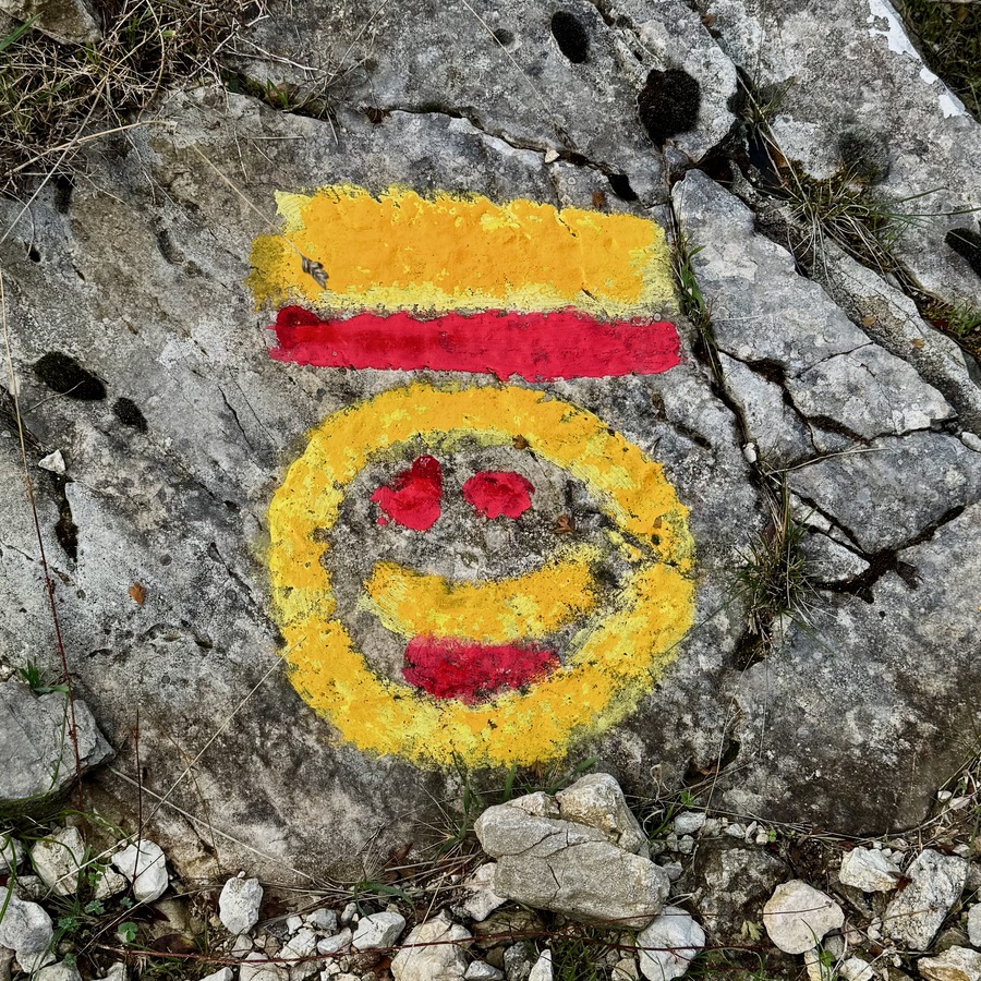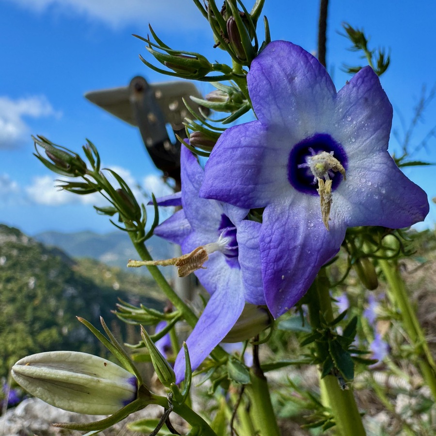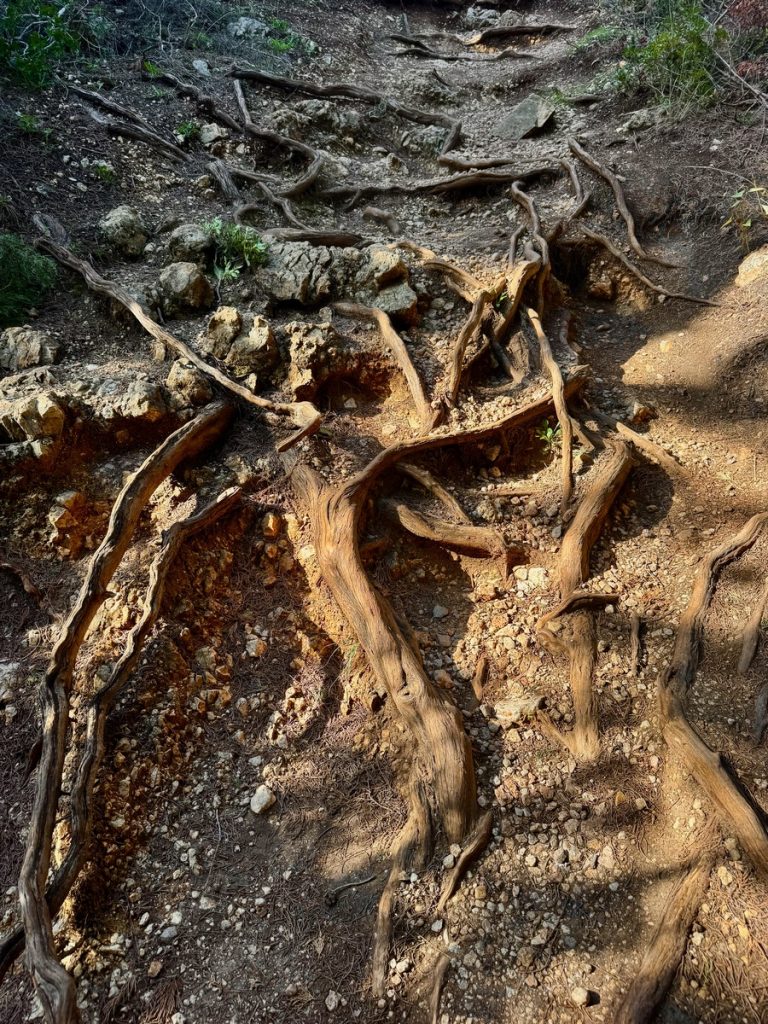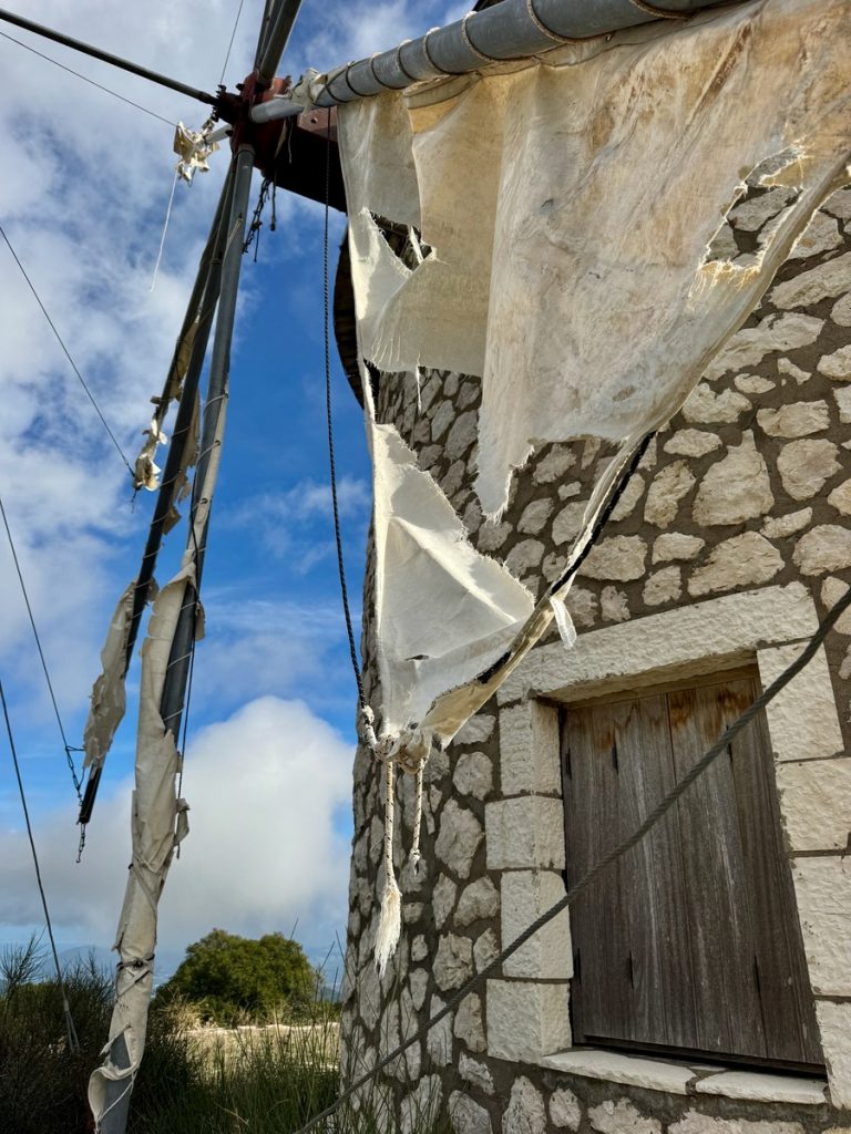 Wir haben bei Komoot eine Rundwanderung geplant, die uns verschiedenen Gipfeln sehr nahe bringt. Auf einigen stehen Sendeanlagen und können nicht betreten werden. Uns geht es nicht darum, Gipfel zu sammeln. Wir wollen uns sportlich betätigen und nebenbei die Natur und die Ausblicke genießen. Komoot hat die Route als schwer bezeichnet und ein Teilstück als „gefährlich“. Das hat allerdings wenig zu bedeuten, denn schon die Distanz von knapp 10 Kilometern reicht bei Komoot für die Klassifizierung „schwer“. Und der gefährliche Abschnitt erweist sich als zwar recht steil und mit Geröll durchsetzt, aber zumindest im Aufstieg gut zu bewältigen. Wir sind recht flott unterwegs und erreichen den höchsten Punkt nach gut 1,5 Stunden. Leider wabern um uns herum einige Wolken und so sind nur partielle Ausblicke möglich. Aber auch so hat der Ort seinen Reiz und bringt uns immer wieder zum Staunen, wenn sich eine neue Blickachse öffnet. Wir können mal nach Norden bis Antipaxos und Paxos sehen, mal nach Nordosten bis Preveza und zum Flughafen. Vom Osten bis zum Süden breiten sich die vielen ionischen Inseln vor uns aus – da haben wir im November noch reichlich Revier zu erkunden, wenn wir von Lefkada Abschied nehmen!