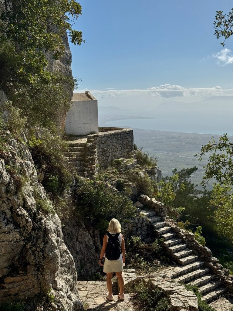 Am Frauenkloster Agios Dimitrios endet die Straße. Wir parken unser Auto und machen uns an den Aufstieg zum Monument. Dazu sind ca. 400 Stufen zu bewältigen. Das Monument besteht aus sechs stilisierten Frauenfiguren. Die höchste ist 13 Meter hoch. Die Frauen scheinen sich an den Händen zu halten. Wir googeln und erfahren, dass das Monument „Tanz von Zalongo“ heißt. Was so schön klingt, hat einen sehr ernsten Hintergrund: Die in der Gegend lebenden Soulioten leisteten bis zum Jahr 1803 lange und erbitterten Widerstand gegen die Truppen des tyrannischen Ottomanen Ali Pascha und waren bereit bis zum Tod für ihre Freiheit zu kämpfen. Ihre Frauen und Kinder flüchteten auf den Berg. Die Soulioten verloren den letzten Kampf und die Frauen stürzten sich tanzend und singend mit ihren Kindern im Arm in die Tiefe, um Gefangenschaft und Versklavung zu entgehen.