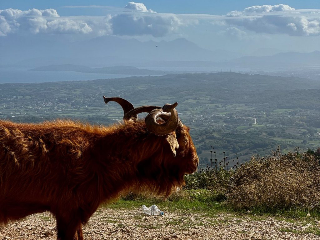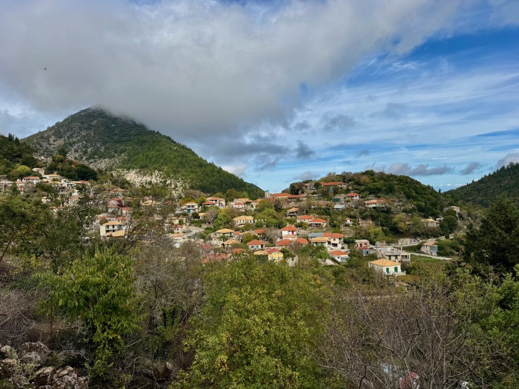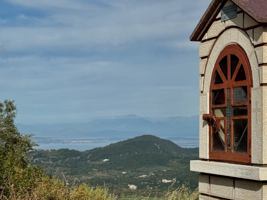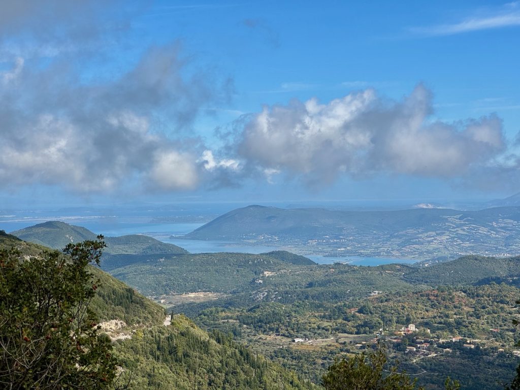 Nachdem wir gestern viele Stunden im Auto verbrachten, soll der heutige Tag mehr die körperliche Bewegung im Fokus haben. Barbara wünscht sich eine Wanderung zu den Gipfeln Lefkadas, die gleich hinter dem Liegeplatz unseres Bootes auf bis zu 1.100 Meter in die Höhe wachsen. Die gesamten Höhenmeter zu Fuß zu absolvieren, wäre ein tagesfüllendes Programm. So fahren wir mit dem Auto bis zum höchsten Bergdorf der ionischen Inseln. „Eglouvi“ liegt auf einer Höhe von 730m. Schon der Weg hierher über unzählige Serpentinen ist wunderschön und bietet tolle Ausblicke. Unser kleiner Peugeot hält wacker durch, obwohl wir über den dritten Gang kaum hinauskommen.