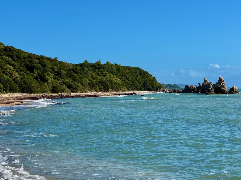 Um den Tag vollkommen zu machen, fehlt uns nun nur noch eine schöne Bucht mit „Karibikwasser“ zu unserem Glück. Moni findet auf Google Maps die Artholithia Beach und navigiert uns dorthin. Die Streckenführung ist etwas abenteuerlich, aber am Ende werden wir belohnt.