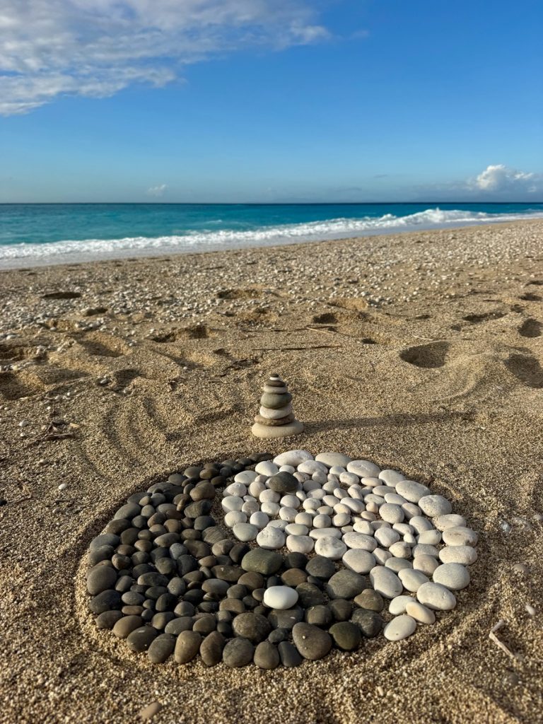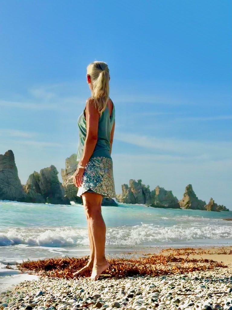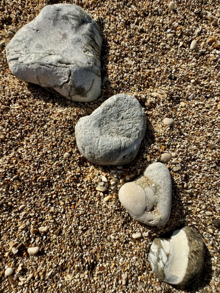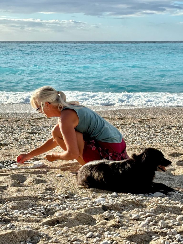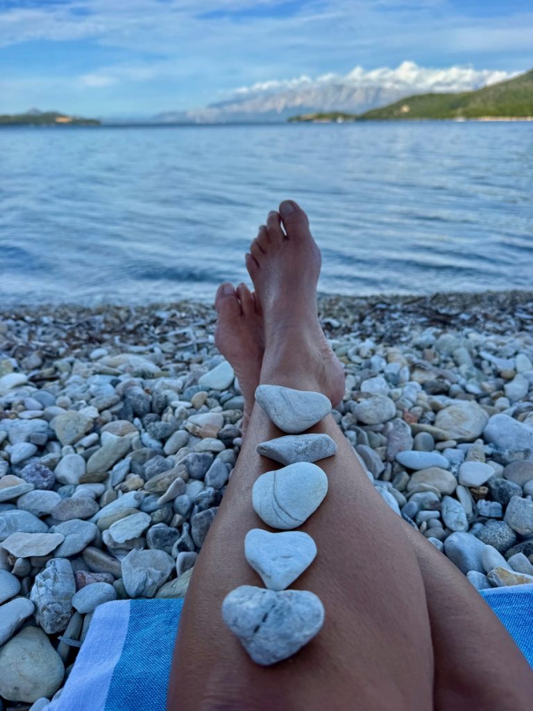 Feiner Kies durchsetzt mit einigen größeren Steinen begrüßt uns. Tatsächlich gibt es hier bereits ein paar andere Menschen, aber die Bucht ist groß genug und wir wandern bis fast an ihr hinteres Ende. Das ist in dem Kies recht anstrengend und sorgt gleichzeitig für eine anregende Fußreflexzonenmassage. Wir machen es uns auf unseren schönen griechischen Badetüchern mit dem mitgebrachten Picknick gemütlich. Moni traut sich im Anschluss auch ins Wasser, Barbara verzichtet, da es auch hier nach kräftiger Unterströmung durch die „Sylter Wellen“ aussieht. Moni ist eine ausdauernde und gute Schwimmerin, kommt aber dennoch ziemlich aus der Puste wieder aus dem Wasser. Der Rückweg zum sicheren Ufer war tatsächlich ziemlich kräftezehrend. Leider ziehen ein paar Wolken auf und es wird frisch am Strand. Da wir aber Hoffnung haben, dass es nochmals aufklart, halten wir durch und beschäftigen uns heute statt mit Yoga mit kreativem Steinesammeln samt Fotoshooting.