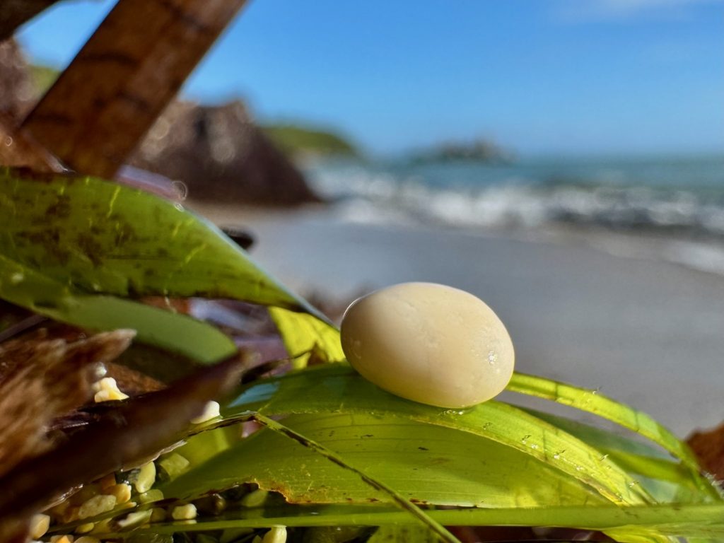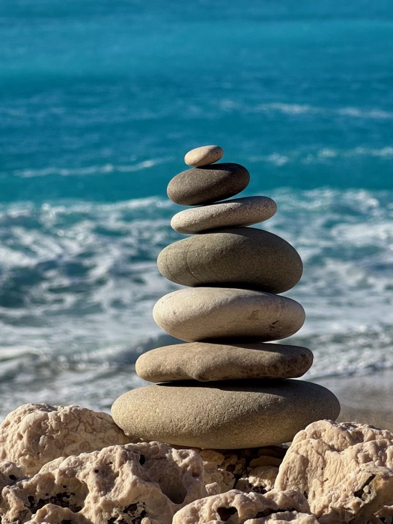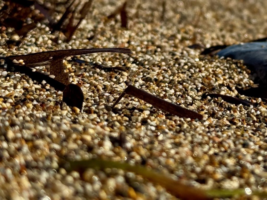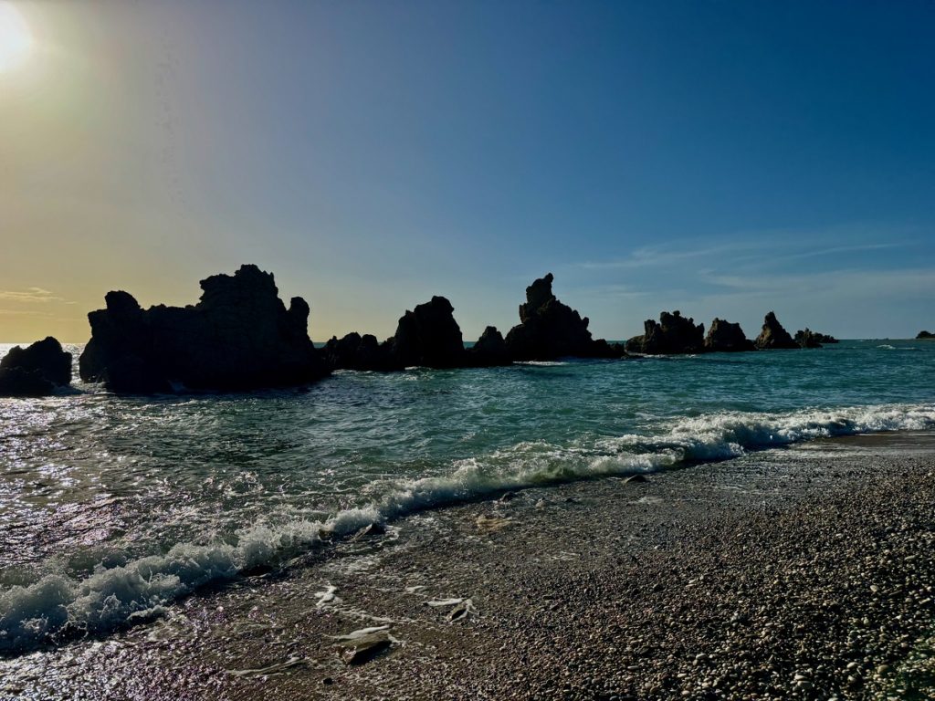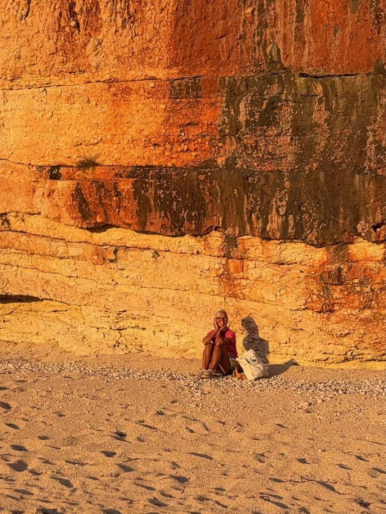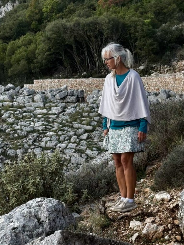 Feiner Kies durchsetzt mit einigen größeren Steinen begrüßt uns. Tatsächlich gibt es hier bereits ein paar andere Menschen, aber die Bucht ist groß genug und wir wandern bis fast an ihr hinteres Ende. Das ist in dem Kies recht anstrengend und sorgt gleichzeitig für eine anregende Fußreflexzonenmassage. Wir machen es uns auf unseren schönen griechischen Badetüchern mit dem mitgebrachten Picknick gemütlich. Moni traut sich im Anschluss auch ins Wasser, Barbara verzichtet, da es auch hier nach kräftiger Unterströmung durch die „Sylter Wellen“ aussieht. Moni ist eine ausdauernde und gute Schwimmerin, kommt aber dennoch ziemlich aus der Puste wieder aus dem Wasser. Der Rückweg zum sicheren Ufer war tatsächlich ziemlich kräftezehrend. Leider ziehen ein paar Wolken auf und es wird frisch am Strand. Da wir aber Hoffnung haben, dass es nochmals aufklart, halten wir durch und beschäftigen uns heute statt mit Yoga mit kreativem Steinesammeln samt Fotoshooting.