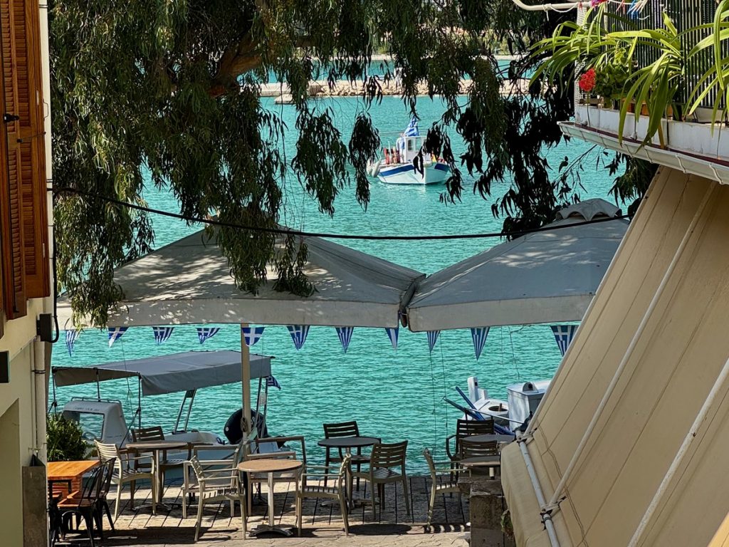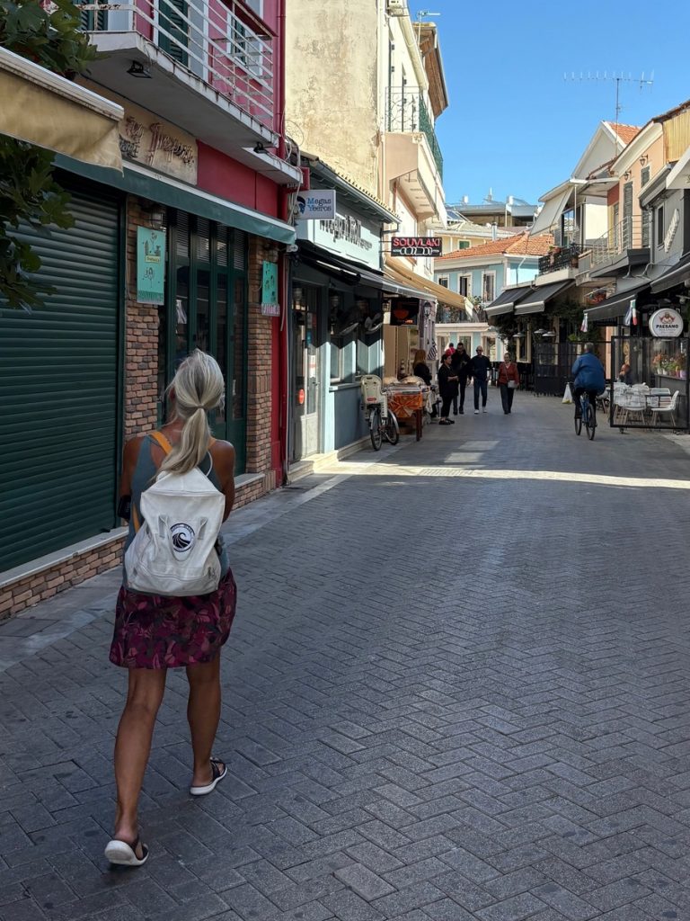 Das ist DIE Gelegenheit, um einen (heute) menschenleeren Ort zu erkunden. Als wir Lefkada erreichen, finden wir am Hafen, neben dem Busbahnhof einen Parkplatz am Seitenstreifen. Die Weiterfahrt ist hier heute nicht möglich – die Straße ist für die Parade bereits gesperrt.