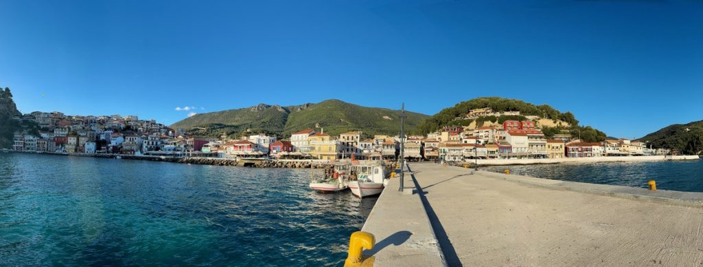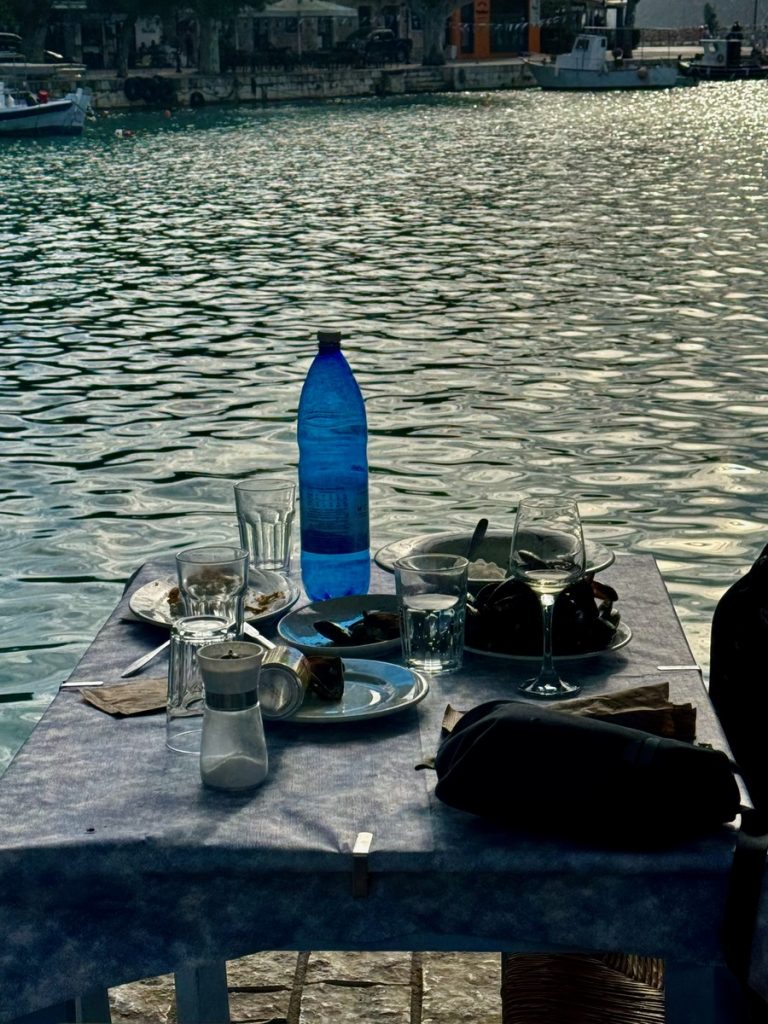 Als tatsächlich andere Menschen den Weg in die Bucht finden, ist es für uns Zeit zum Aufbruch. In der „Old Fisherman’s Tavern“ in Vasiliki am Hafen genießen wir einen Mittagsimbiss mit Blick auf den malerischen Hafen in der Sonne.