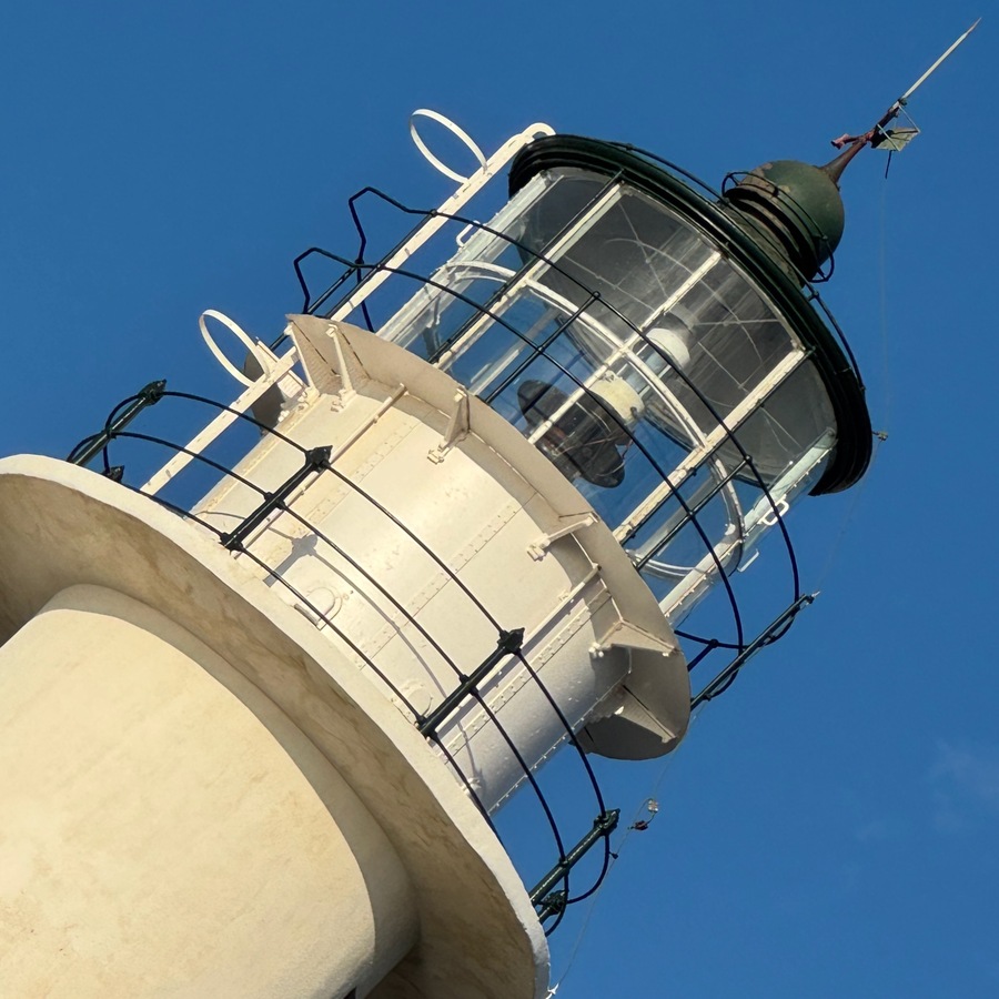 Dann geht es weiter. Moni möchte gern zum Leuchtturm am Cap Lefkada. Auch dort waren Barbara und Werner bereits im März und der Weg ist bekannt. Der Wettergott begleitet uns weiterhin. Die Wolken, die vormittags tief über der Halbinsel hingen, lösen sich gerade auf und als wir den Leuchtturm erreichen strahlt die Sonne vom stahlblauen Himmel. Die Halbinsel ist wirklich spektakulär mit ihren schroffen, 60m hohen Klippen, die steil ins Meer abfallen. Hier sind sie hell, fast weiß. Das muss von unten sehr beeindruckend aussehen und erinnert an die Kalkfelsen von Mön oder Rügen. Nur die Vegetation passt nicht. Wir wandern zum Leuchtturm hoch und machen ein paar Fotos. Natürlich wollen wir auch eines von uns beiden vor dem Leuchtturm und bitten einen anderen Besucher, uns zu fotografieren. Die Fotos sind ein Witz: Entweder sind nur unsere Oberkörper drauf oder nur die Köpfe. Wenig später findet sich ein weiterer Besucher, der es besser kann…