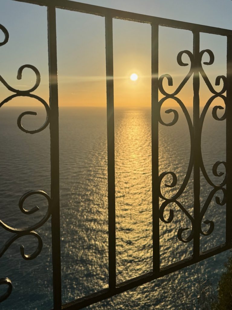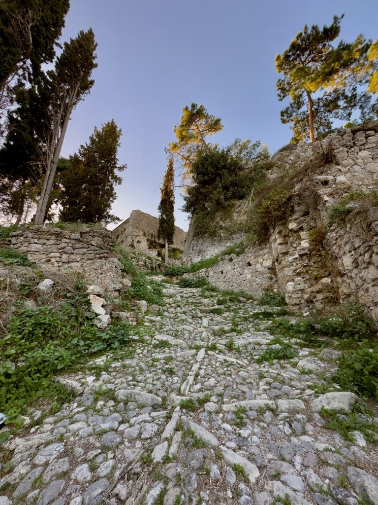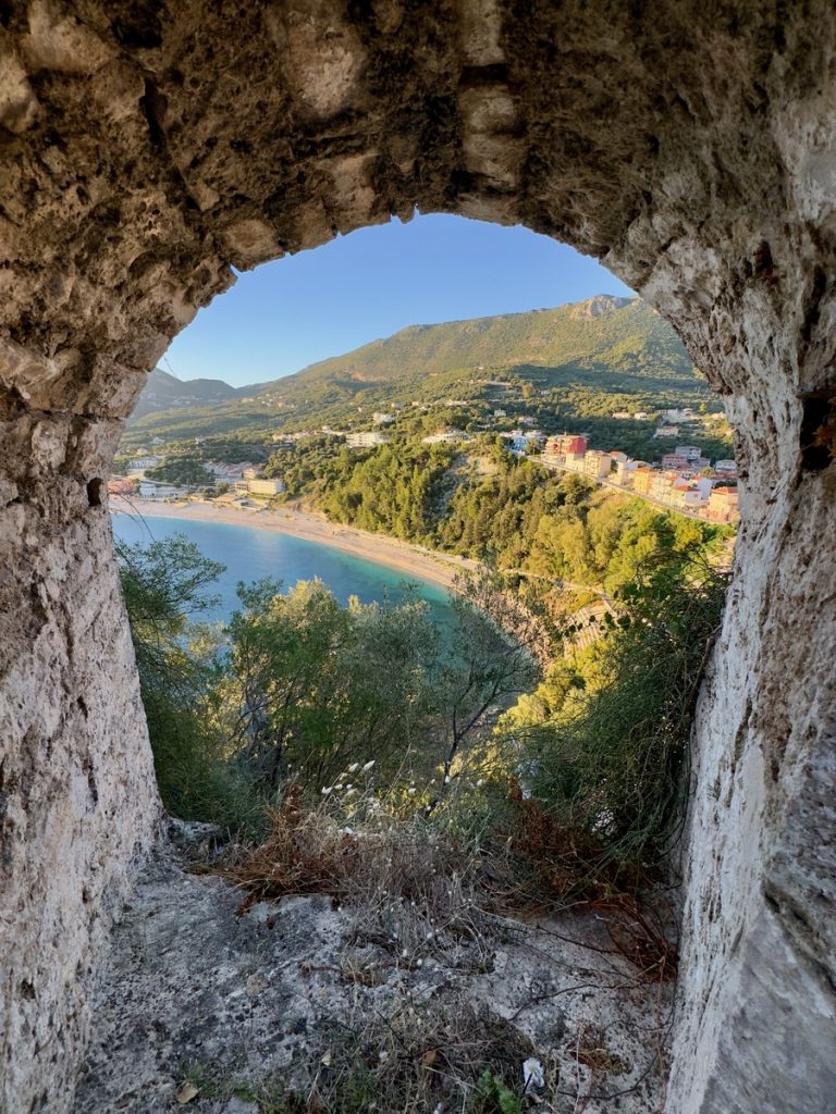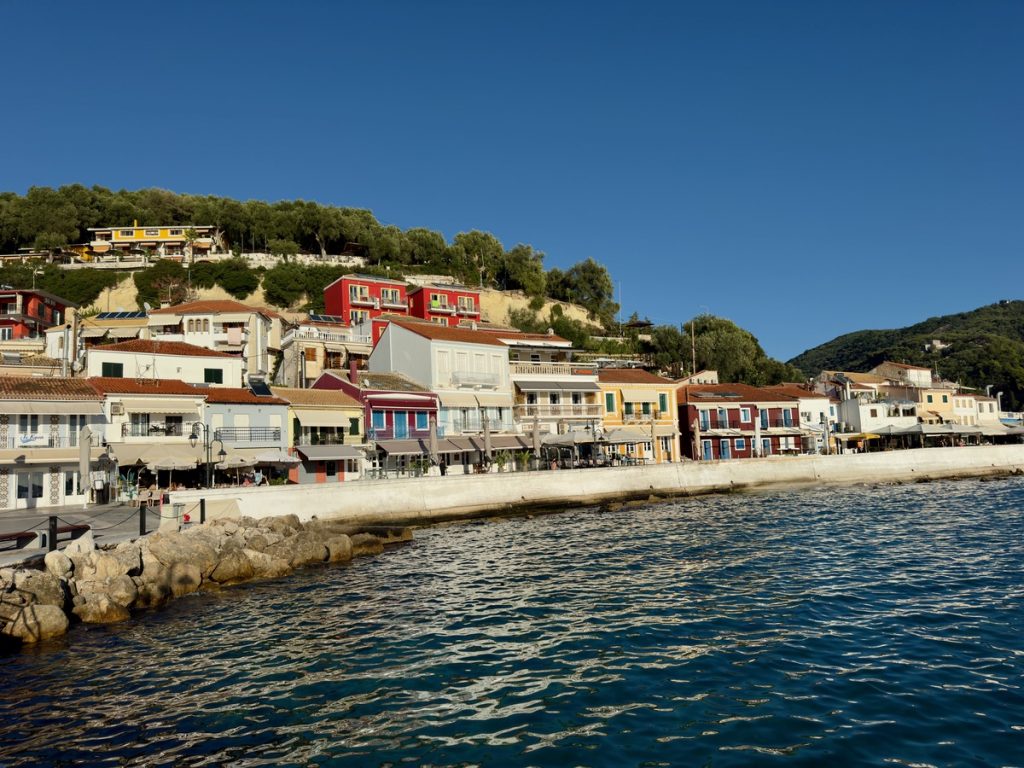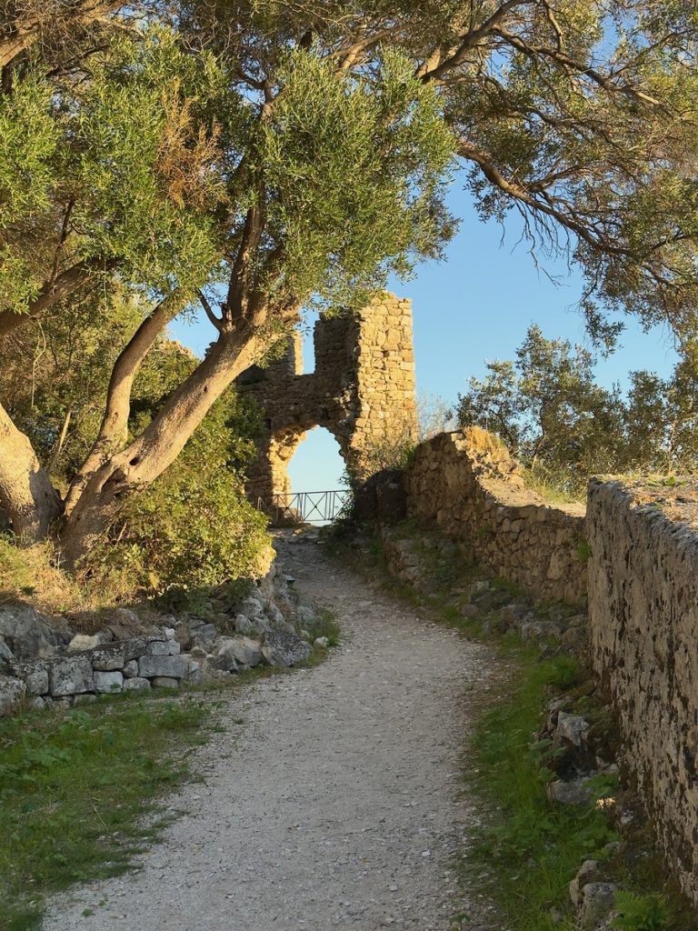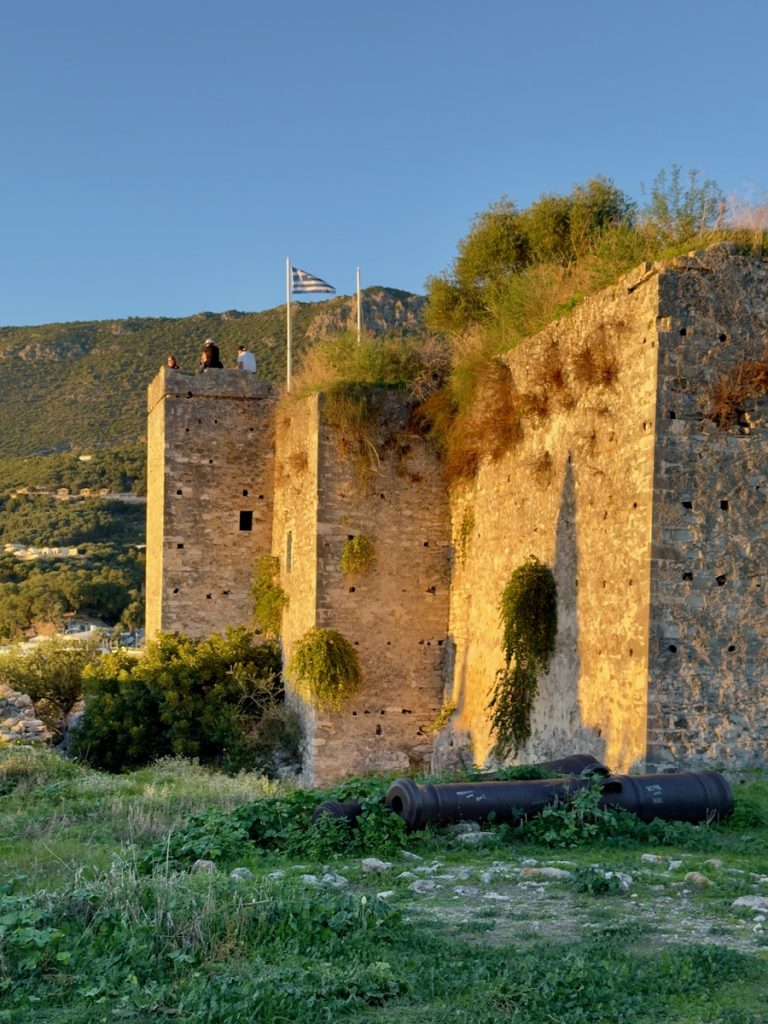 Nach gut 30 Minuten Fahrtzeit erreichen wir den malerischen Ort, der uns mit seinen hübschen Häusern am Steilhang in bunten Farben sofort an die Amalfiküste erinnert. Leider sind wir etwas zu spät und ein Teil des Ortes liegt bereits im Schatten des vorgelagerten Festungsberges. Wir suchen uns ein nettes Café in erster Linie zum Meer und stärken sammeln neue Kräfte bei einem Frappé, denn natürlich wollen wir noch zur Festung hinauf. Während wir noch mit Schauen beschäftigt sind, wird am Nachbartisch Souvlaki als hängender Spieß serviert – sieht sehr appetitlich aus, vielleicht später? Die Festung ist bis 18:00 Uhr geöffnet, um 17:40 Uhr ist Sonnenuntergang – noch eine gute Stunde bleibt uns zur Erkundung der im 15. Jahrhundert erbauten venezianischen Festung, die im Laufe der Jahre von französischen, russischen, türkischen und britischen Armeen eingenommen wurde. Eintritt wird nicht verlangt. Man kann sich relativ frei in den Ruinen bewegen, in denen es nur sehr wenige Erläuterungen zu einzelnen Gebäudeteilen gibt. „Eigentlich“ sind alle Wege zu den höher gelegenen Arealen mit Gefahren-Hinweisschildern versperrt, aber das scheint hier niemanden zu interessieren – uns auch nicht. Auf dem höchsten Punkt mit bester Aussicht zum Sonnenuntergang über Paxos sind wir zwar nicht allein, aber es ist trotzdem ein stiller wunderschöner Moment.