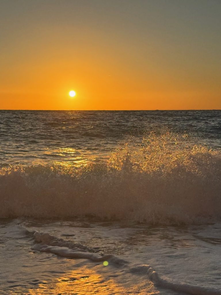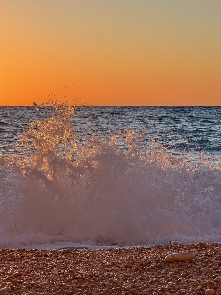 Nach ausgiebigem Bad und Strandspaziergang, machen wir uns auf den Heimweg und kehren unterwegs in einer kleinen Taverne am Meer ein, wo wir uns mit griechischem Salat zum Sonnenuntergang stärken – ein abwechslungsreicher und wundervoller Tag geht spektakulär zu ende.