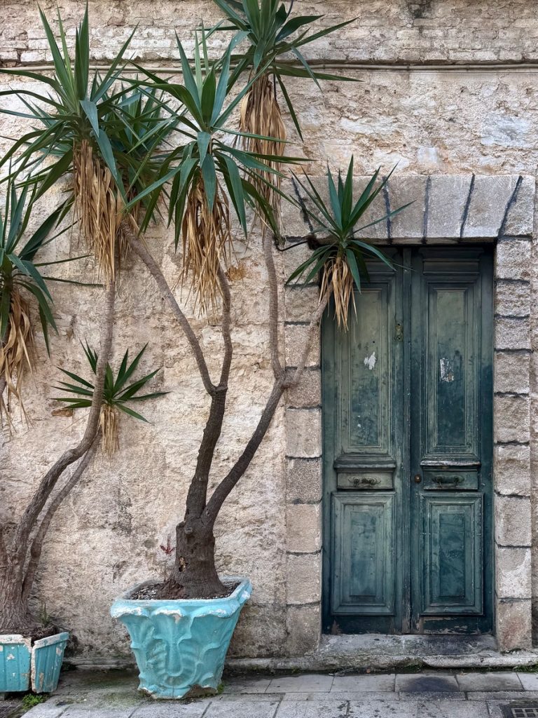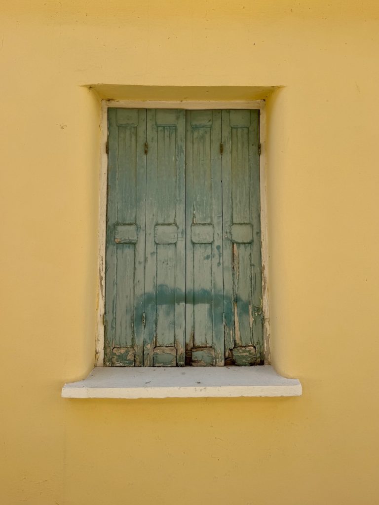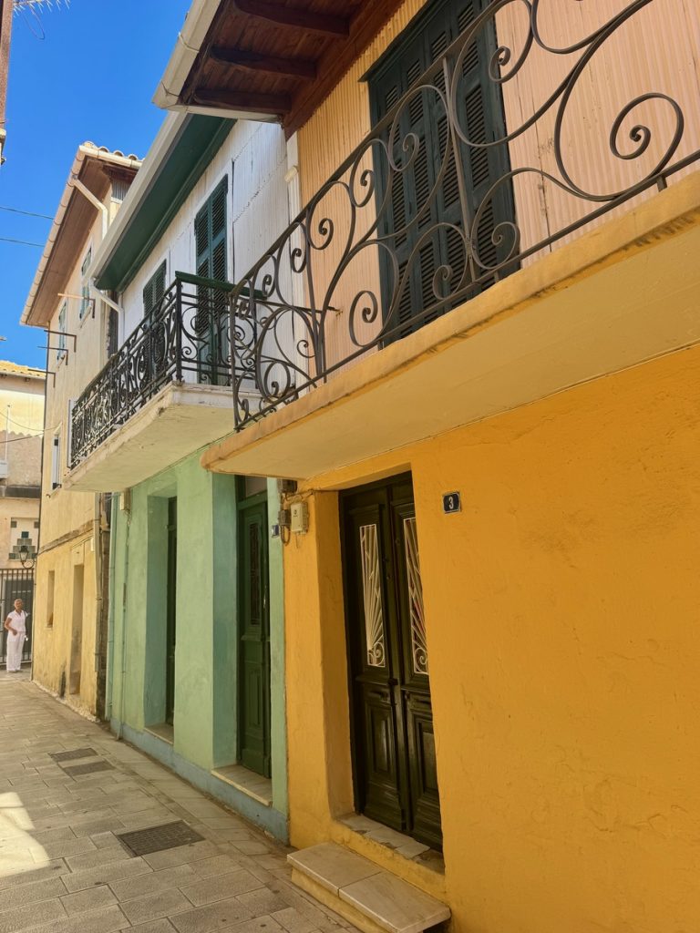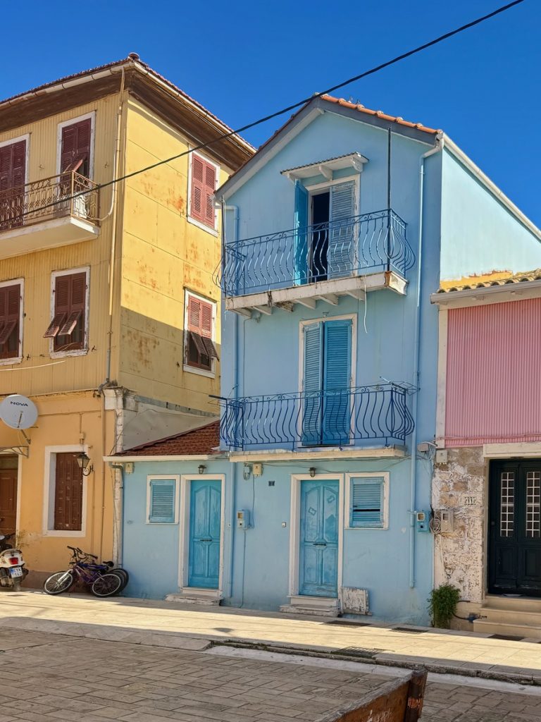 Unser Plan geht auf: die kleinen autofreien Gassen sind menschenleer. Das warme Morgenlicht bringt die Farben der Häuser mit ihren bunten Fassaden, kontrastierenden Fenstern, Fensterläden und Türen noch mehr zum Leuchten. Wir baden in einem wahren Farbenmeer! Lefkada Stadt wurde genau wie der Hauptort auf Zakynthos durch ein verheerendes Erdbeben 1953 in großen Teilen zerstört. Beim Wiederaufbau, blieb man allerdings eng am Originalzustand. Ein weiteres Seebeben traf die Insel 2003 mit Stärke der 6,4 und beschädigte wiederum viele Gebäude und Infrastruktur, hatte aber zum Glück nicht so katastropale Folgen wie das Beben von 1953. Mit diesem Wissen schaut man etwas anders auf die teilweise schlechten Wege und Straßen und setzt den Fokus mehr auf die schönen Dinge. Genau das ist nach unserer Erfahrung auch das Naturell der Griechen. Sie bemühen sich, mit den wenigen, ihnen zur Verfügung stehenden Mitteln, ihre Häuser hübsch aussehen zu lassen. Über für sie nicht änderbare Dinge wie herabhängende Stromkabel oder defekte Straßenbeläge, sehen sie hinweg. Dafür sind ihnen farbliche Akzente sehr wichtig und so werden oftmals die außen am Haus angebrachten Stromzähler, Briefkästen und Ähnliches in der gleichen Farbe gestrichen, die die Türen und Fenster.