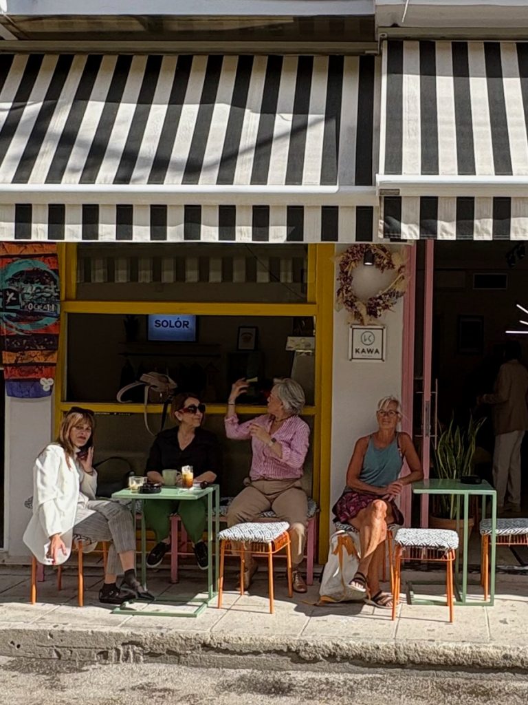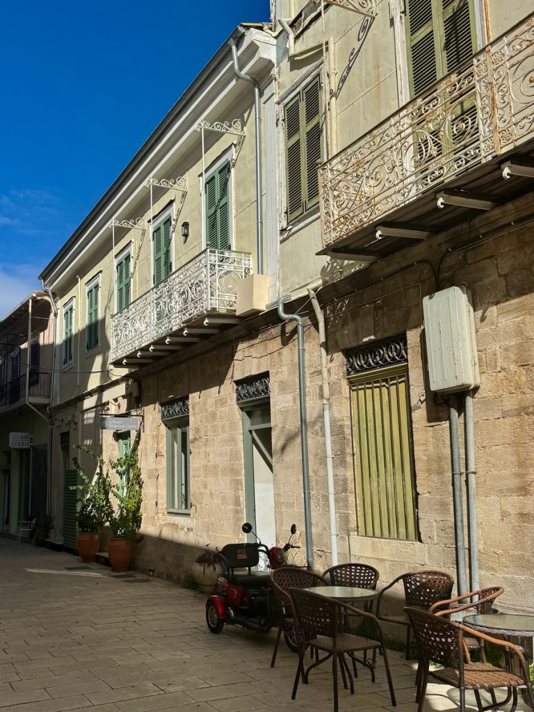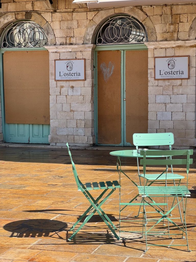 Die Fahrt entlang der Küstenstraße nach Norden ist uns nun schon sehr vertraut – wie schnell das doch geht! Auch in der Stadt wissen wir bereits, wo wir am besten parken. Wie vermutet, ist heute etwas mehr Trubel in den Straßen, als zum Feiertag am Dienstag. Dafür haben aber jetzt auch viele der kleinen Geschäfte geöffnet und es macht Spaß, sich das ein oder andere anzusehen. Aber das Saisonende ist nun nicht mehr zu übersehen. Viele der Tavernen und Cafés in der Altstadtmhaben ihre Stühle und Tische eingewintert und die Türen und Terrassen verrammelt. Das wirkt schon etwas traurig. Aber die auch bei den Einheimischen beliebten Cafés haben weiterhin geöffnet. Hier sind am späten Vormittag viele Tische belegt, mal nur mit Männern, mal nur mit Frauen, seltener mit beiden Geschlechtern zusammen. Die Sonne schafft es hin und wieder durch die Wolkendecke, Er passt sich heute den pastellfarbenen der Häuserfronten an und wirkt etwas verwaschen.