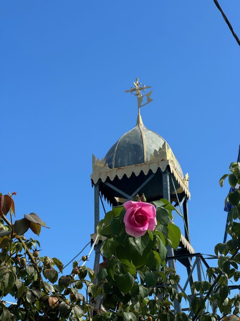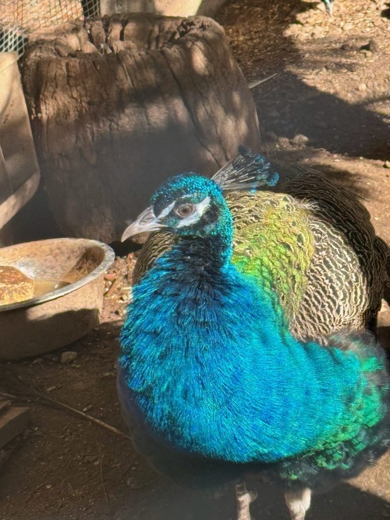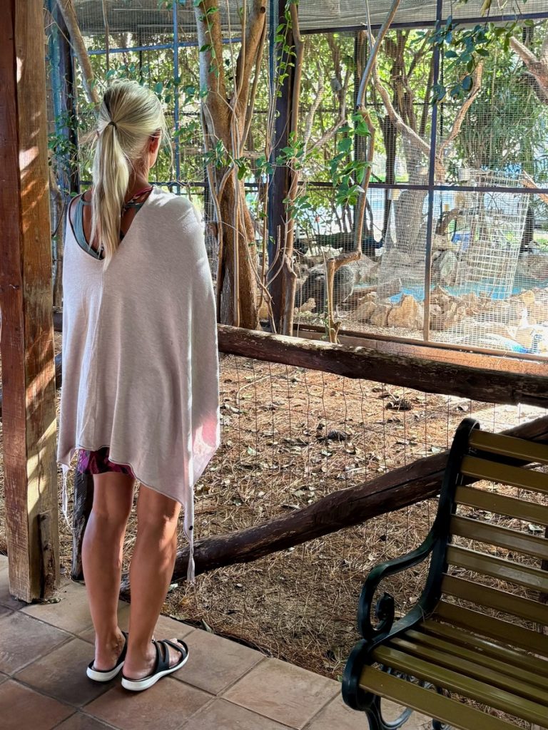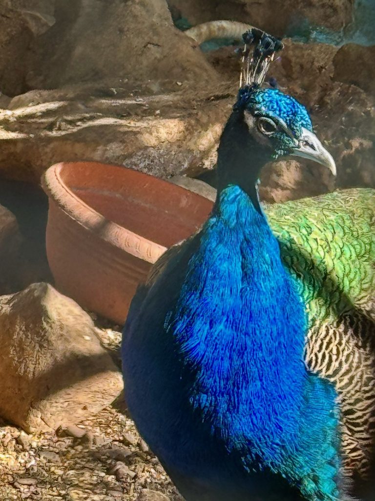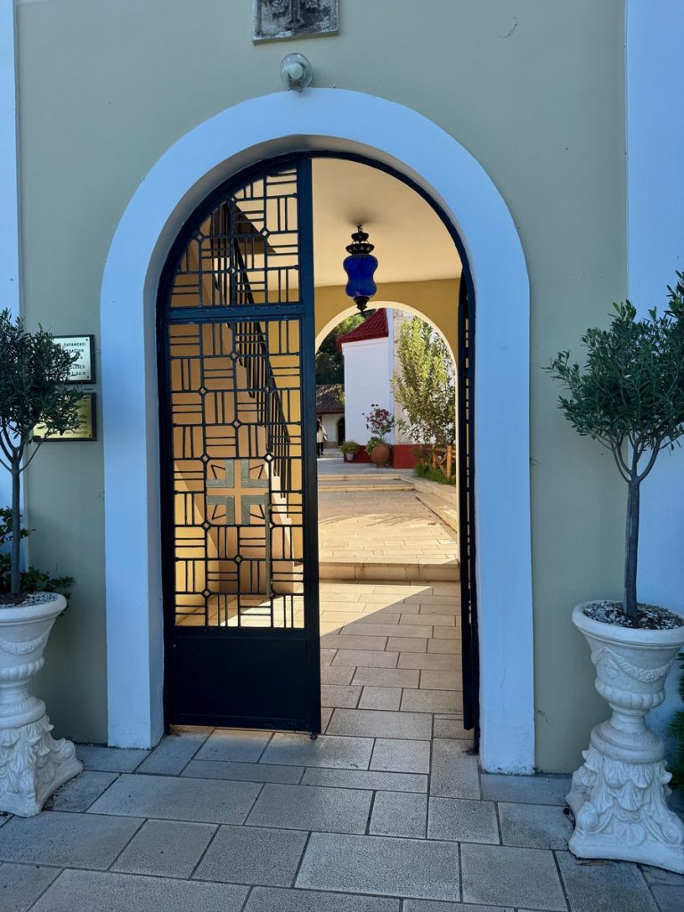 Als nächstes wollen wir zum Kloster Faneromeni und das schließt von 14 bis 16 Uhr seine Türen. Auch dort ist wenig Betrieb und wir haben freie Parkplatzwahl auf dem großen Besucherparkplatz. Das Kloster befindet sich auf einem bewaldeten Hügel südlich der Stadt und bietet einen atemberaubenden Ausblick über den vorgelagerten Strand in Form des „Sylter Ellenbogens“ mit seiner Lagune. Der Überlieferung nach, lag an dieser Stelle der Tempel der Göttin Artemis. Später riefen an dieser Stelle die Jünger des Apostel Paulus die Einwohner der Insel zusammen, um das Christentum zu verkünden. Das Kloster erhielt seine heutige Gestalt in der Zeit der venezianischen Herrschaft im Jahre 1734. Die Namensgeberin ist die Schutzpatronin der „ganzen Erde von Lefkada“ und wird am Pfingstmontag gefeiert. Im Kloster leben aktuell 5 Mönche, einen bekommen wir zu Gesicht. Die Kirche ist reich verziert und uns beeindruckt besonders die himmelblaue Decke. Im Kloster befindet sich zudem ein Schattengarten mit verschiedenen Volieren und Gehegen für Pfauen, Hühner und Gänse. Letztere begrüßen jeden neuen Besucher mit lautstarkem Gezeter.