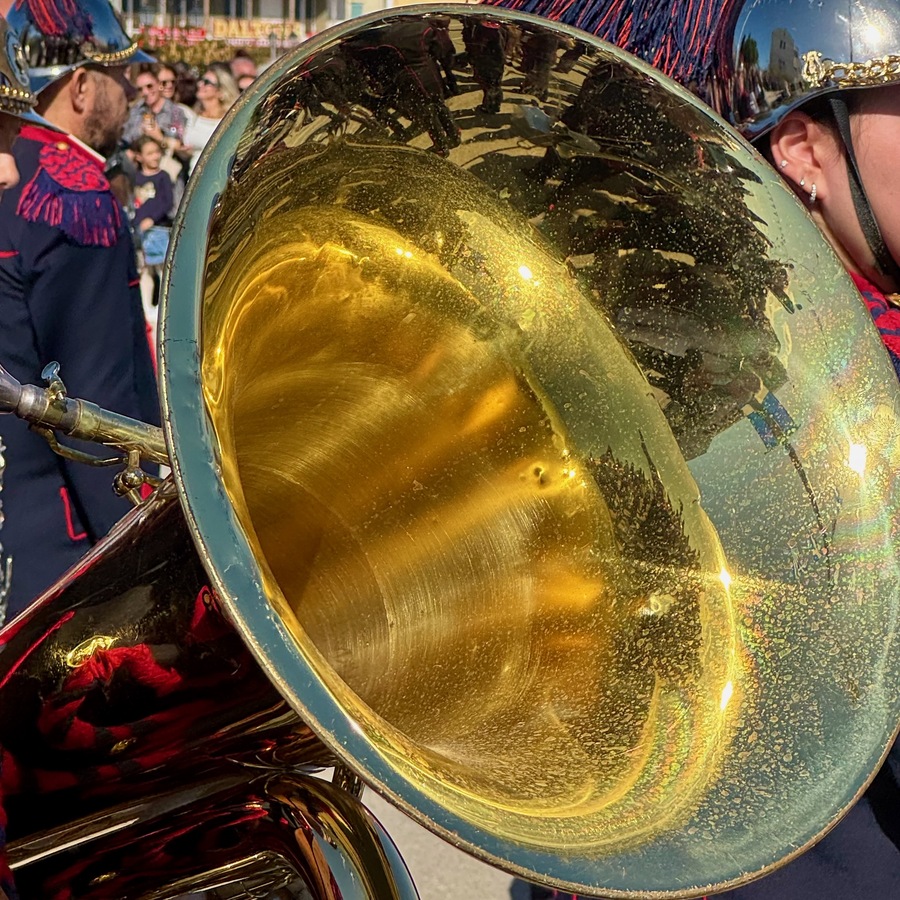 Wir stellen fest, dass wir zwar einen sehr stadtnahen Parkplatz gefunden haben, nun aber vom Aufmarsch der Parade mit Spielmannszug und Schulen eingebaut sind. Wir kommen also nicht umhin, die Parade zu bestaunen, bevor die Polizei die Straße wieder freigibt.