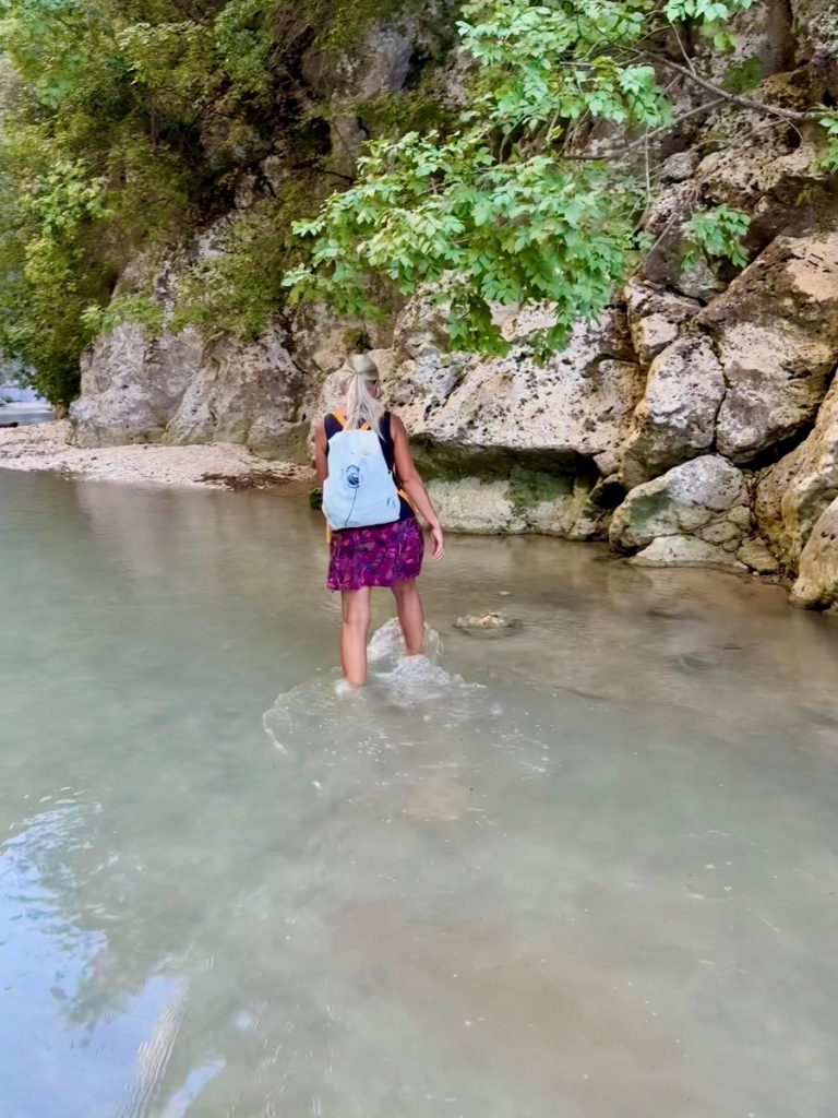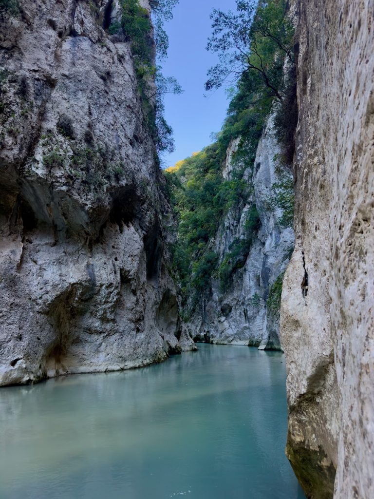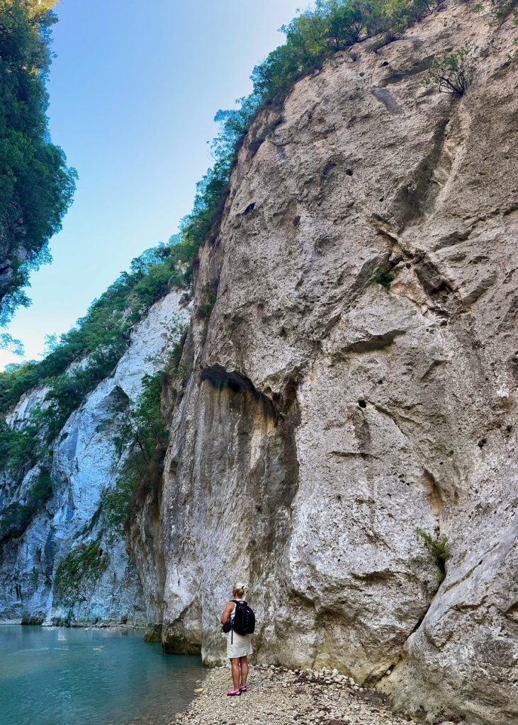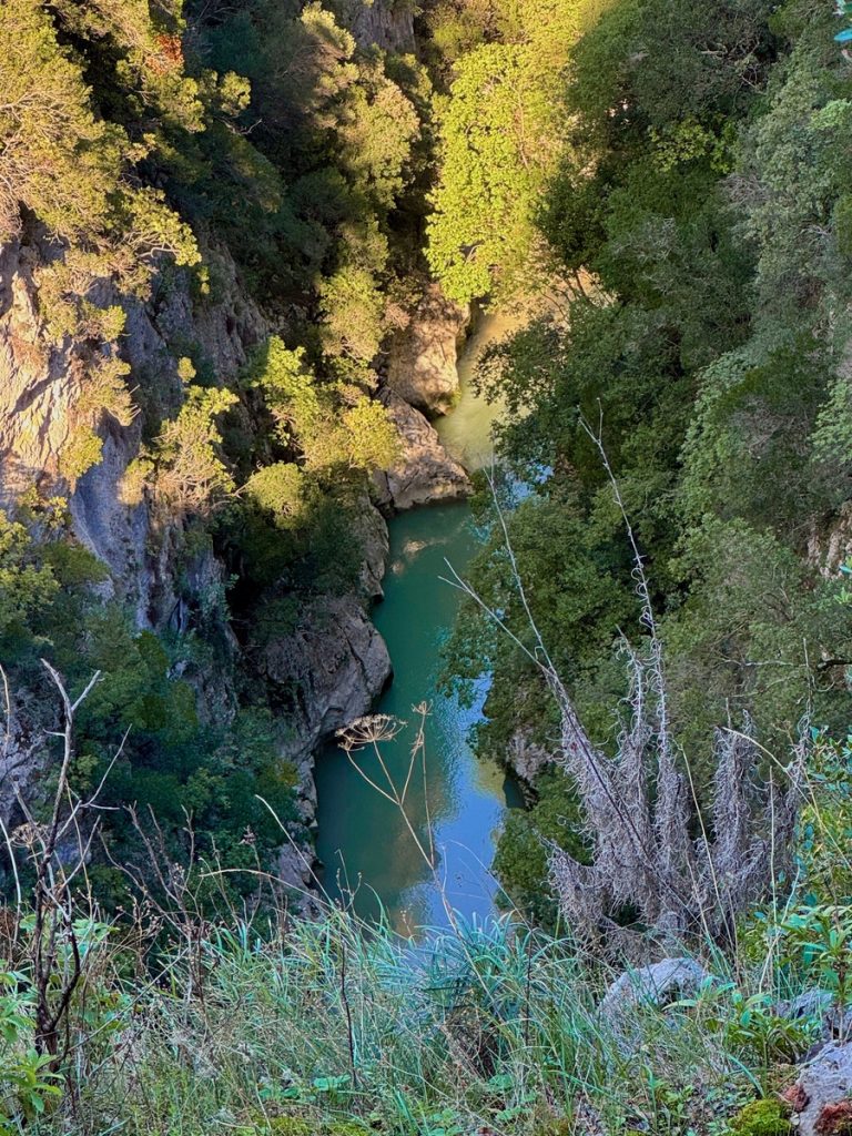 Nun geht es weiter durch die fruchtbare Ebene des Acheron. Wir sehen Orangen- und Kiwi-Plantagen, Weinreben und landwirtschaftlich genutzte Flächen. Frisch gepflügte Felder sehen nach satter, fruchtbarer Erde aus. Dann erreichen wir den kleinen Ort Glykis, durch den der Acheron fließt. Wir folgen der Beschilderung zu den „Acheron Springs“ und kommen an verschiedenen Hinweisschildern zu Wildwasserrafting, Reiten im Fluss oder „Freiflug an Stahlseilen über den Fluss“ vorbei. Alles für die Sommertouristen – jetzt zum Glück geschlossen. Wir stellen unseren Wagen auf dem nahezu verwaisten riesigen Parkplatz am Ende der befestigten Straße ab. Von hier aus wollen wir zu einer Rundwanderung starten, aber vorher gibt es ein Picknick-Frühstück. So gestärkt kann es losgehen.  Der griechischen Mythologie zufolge befand sich das Tor des Hades zur Unterwelt genau hier in der Nähe der Acheronquellen. Angesichts der schönen Umgebung, kaum zu glauben. Hier ruderte Charon die Seelen der Toten über den Fluss, um vom Land der Lebenden in die Unterwelt zu gelangen. Wir marschieren los.  Schon nach ca. 500 Metern endet allerdings der Weg. Aufgrund der Komootkarten hatten wir an dieser Stelle mit einer Brücke über den Fluss gerechnet, aber die gibt es nicht. Der Weg führt durch den Fluss. Also ziehen wir die Badeschuhe an und steigen in das klare Wasser. Es ist bitterkalt, naja vielleicht so 12 Grad? Die Strömung ist kräftig, aber zu bewältigen. Bevor wir ans andere Ufer gehen, wollen wir ein Stück in die Schlucht hineinschauen. Die Felswände erheben sich geschätzte 60 Meter steil über uns. Wir haben unsere Handys zum Fotografieren dabei, also ist „ins Wasser fallen“ (genau wie beim Segeln) keine Option. Entsprechend vorsichtig bewegen wir uns durch das Wasser immer weiter in die beeindruckend enge Schlucht. Vor uns geht ein Vater mit seinen zwei Söhnen und wir können an ihnen ablesen, wie das Wasser langsam tiefer wird. Irgendwann reicht es uns allen bis zum Oberschenkel und wir beschließen, dass es Zeit zur Umkehr ist. Außerdem spüren wir unsere Füße nicht mehr. Aber dieses Naturschauspiel war es allemal wert. Es ist gut vorstellbar, dass die Menschen in früherer Zeit hier das Tor zur Unterwelt vermuteten. Insbesondere im Frühjahr, wenn der Fluss viel Wasser führt und mit lautem Getöse und jeder Menge Astwerk und Geröll durch diese Schlucht stürzt, muss es beängstigend wirken. Jetzt ist der Fluss freundlich gestimmt und entlässt uns ohne Schaden.