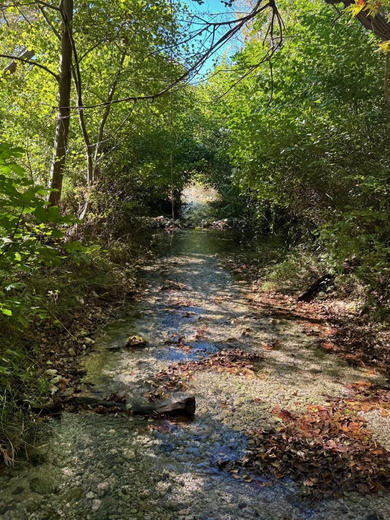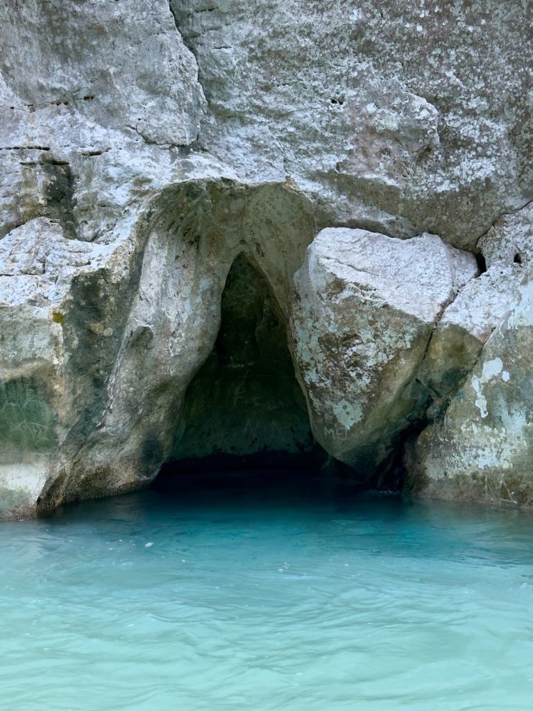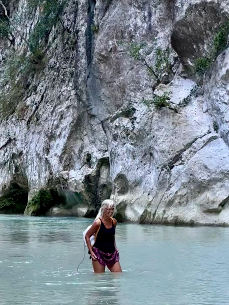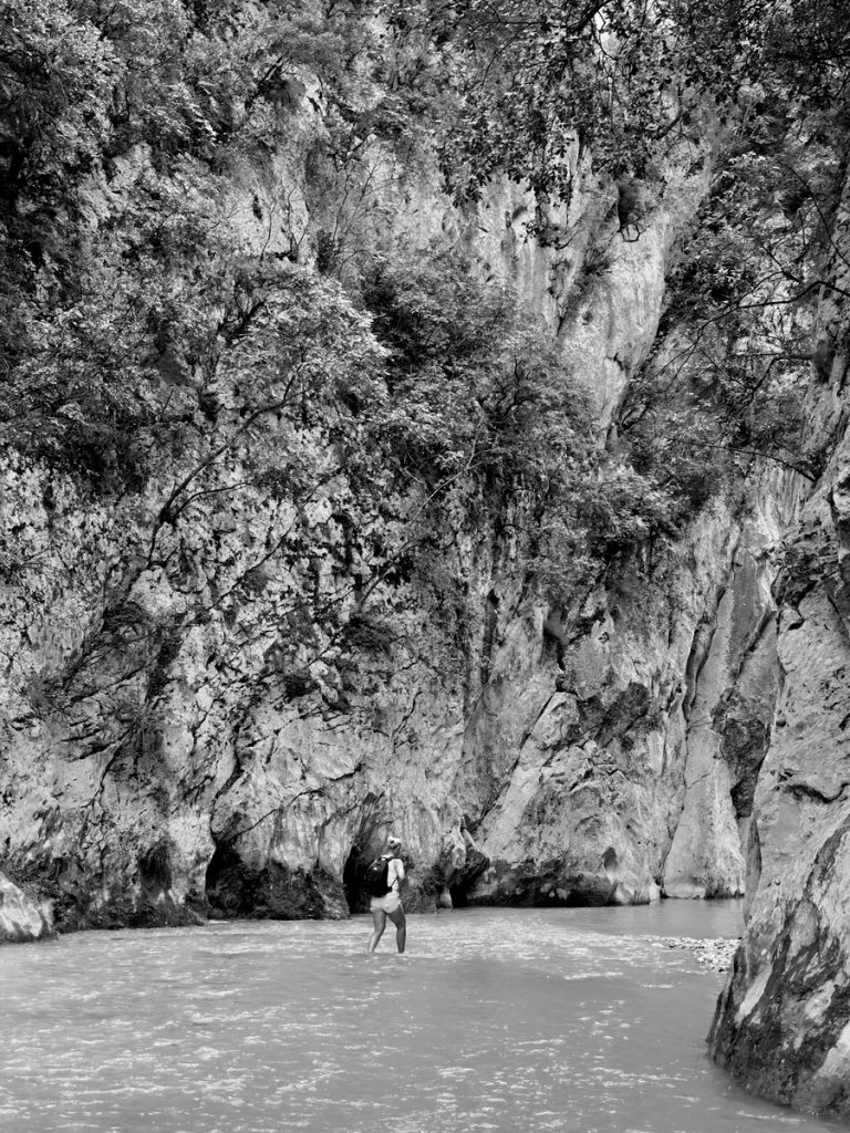 Nun geht es weiter durch die fruchtbare Ebene des Acheron. Wir sehen Orangen- und Kiwi-Plantagen, Weinreben und landwirtschaftlich genutzte Flächen. Frisch gepflügte Felder sehen nach satter, fruchtbarer Erde aus. Dann erreichen wir den kleinen Ort Glykis, durch den der Acheron fließt. Wir folgen der Beschilderung zu den „Acheron Springs“ und kommen an verschiedenen Hinweisschildern zu Wildwasserrafting, Reiten im Fluss oder „Freiflug an Stahlseilen über den Fluss“ vorbei. Alles für die Sommertouristen – jetzt zum Glück geschlossen. Wir stellen unseren Wagen auf dem nahezu verwaisten riesigen Parkplatz am Ende der befestigten Straße ab. Von hier aus wollen wir zu einer Rundwanderung starten, aber vorher gibt es ein Picknick-Frühstück. So gestärkt kann es losgehen.  Der griechischen Mythologie zufolge befand sich das Tor des Hades zur Unterwelt genau hier in der Nähe der Acheronquellen. Angesichts der schönen Umgebung, kaum zu glauben. Hier ruderte Charon die Seelen der Toten über den Fluss, um vom Land der Lebenden in die Unterwelt zu gelangen. Wir marschieren los.  Schon nach ca. 500 Metern endet allerdings der Weg. Aufgrund der Komootkarten hatten wir an dieser Stelle mit einer Brücke über den Fluss gerechnet, aber die gibt es nicht. Der Weg führt durch den Fluss. Also ziehen wir die Badeschuhe an und steigen in das klare Wasser. Es ist bitterkalt, naja vielleicht so 12 Grad? Die Strömung ist kräftig, aber zu bewältigen. Bevor wir ans andere Ufer gehen, wollen wir ein Stück in die Schlucht hineinschauen. Die Felswände erheben sich geschätzte 60 Meter steil über uns. Wir haben unsere Handys zum Fotografieren dabei, also ist „ins Wasser fallen“ (genau wie beim Segeln) keine Option. Entsprechend vorsichtig bewegen wir uns durch das Wasser immer weiter in die beeindruckend enge Schlucht. Vor uns geht ein Vater mit seinen zwei Söhnen und wir können an ihnen ablesen, wie das Wasser langsam tiefer wird. Irgendwann reicht es uns allen bis zum Oberschenkel und wir beschließen, dass es Zeit zur Umkehr ist. Außerdem spüren wir unsere Füße nicht mehr. Aber dieses Naturschauspiel war es allemal wert. Es ist gut vorstellbar, dass die Menschen in früherer Zeit hier das Tor zur Unterwelt vermuteten. Insbesondere im Frühjahr, wenn der Fluss viel Wasser führt und mit lautem Getöse und jeder Menge Astwerk und Geröll durch diese Schlucht stürzt, muss es beängstigend wirken. Jetzt ist der Fluss freundlich gestimmt und entlässt uns ohne Schaden.