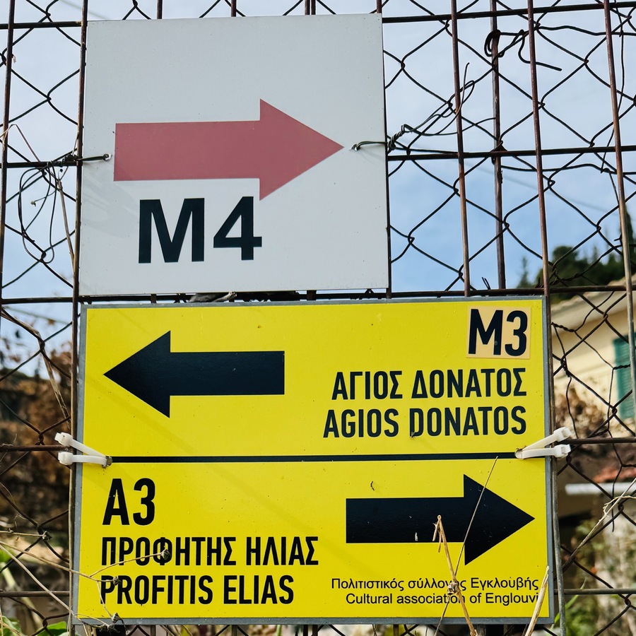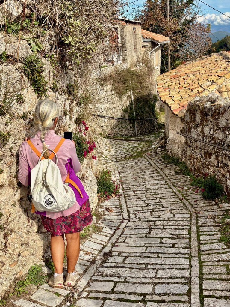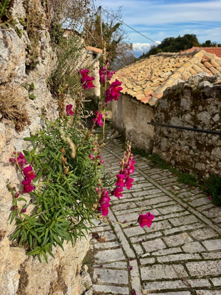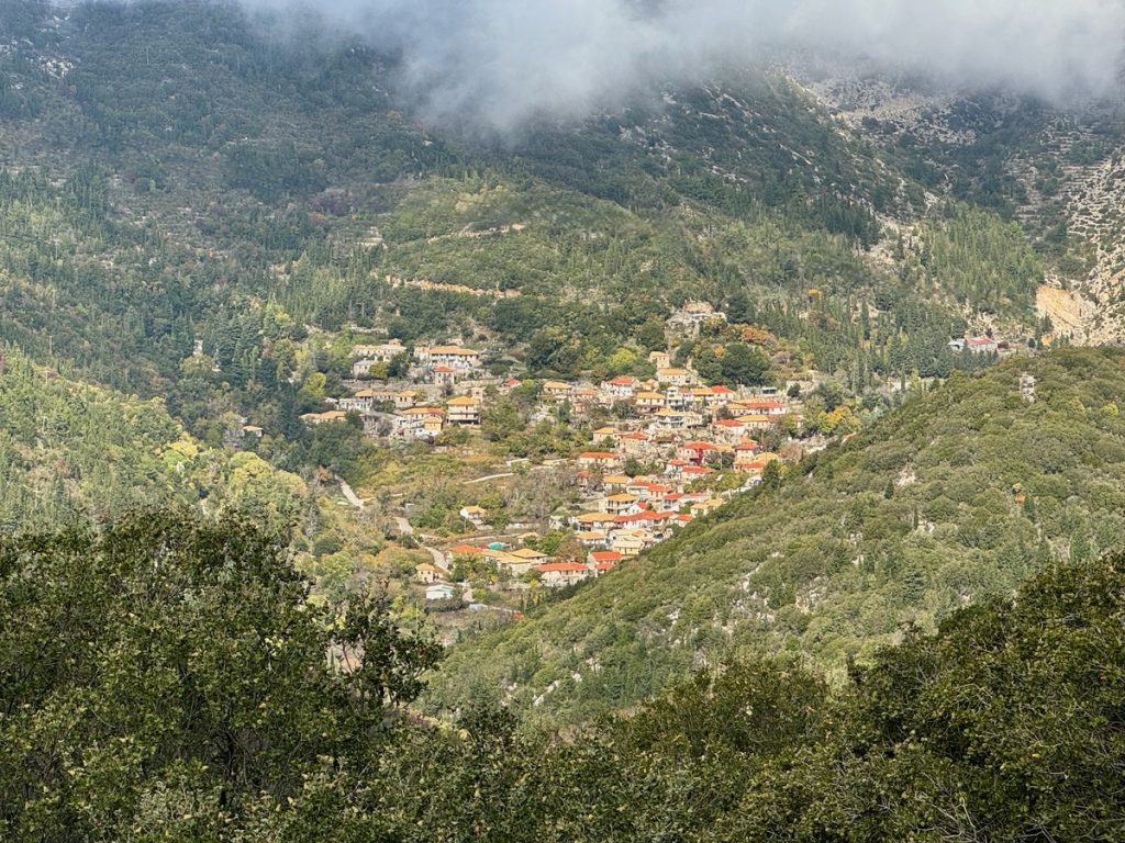 Nach einer guten halben Stunde erreichen wir das Dorf und parken das Auto auf dem zentralen Dorfplatz zwischen Schule und Kirche. Wir beginnen die Wanderung mit einer kleinen Runde durch den Ort, bei dem uns mehrere verfallene Häuser auffallen, vor denen Schilder auf die Einsturzgefahr hinweisen. Das Dorf wirkt noch sehr ursprünglich, aber in Teilen auch verlassen und arm. Es sieht nicht danach aus, dass es hier viele Übernachtungsangebote für zahlungskräftige Touristen gibt. Aber es wird mit den rund um das Dorf existierenden Wanderrouten geworben, die wirklich gut gekennzeichnet sind. Bekannt ist das Dorf für den „Giovannios Berglauf“, der jedes Jahr am ersten Sonntag im Oktober stattfindet. Er erinnert an den aus dem Ort stammenden Marathonläufer Giovanni, der 1896 bei den olympischen Spielen in Athen den schnellsten Marathon lief, allerdings außerhalb des Wettkampfes gestartet war. Zu diesem Ereignis kommen jährlich Hunderte Läufer und starten auf der 27 oder 11,5 km Strecke. Ein weiteres Highlight es Ortes ist das jährlich im August stattfindende Linsenfest, dass ca. einen Kilometer außerhalb des Dorfes auf einem Hochplateau bei der Kirche Agios Donatos stattfindet. Hier sind auch Touristen herzlich willkommen, die verschiedenen Linsengerichte der Region zu kosten.
