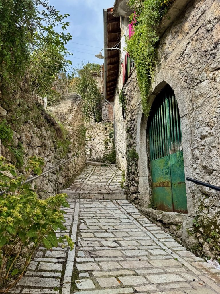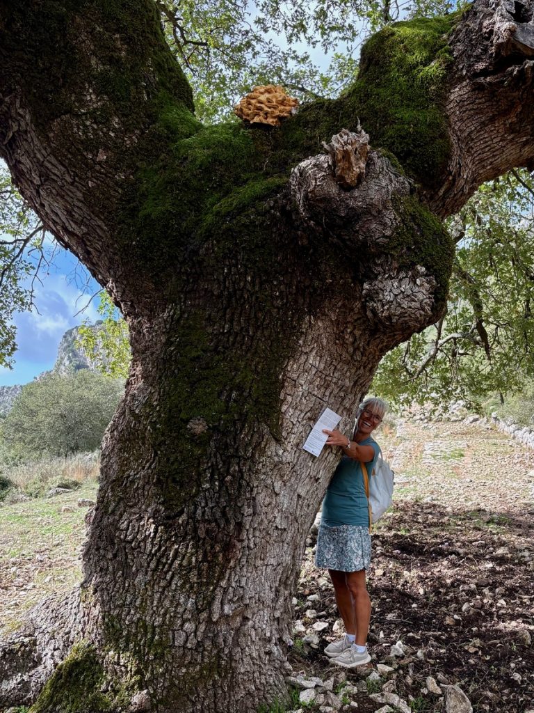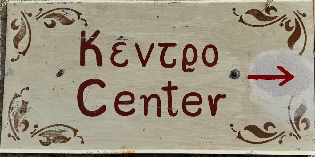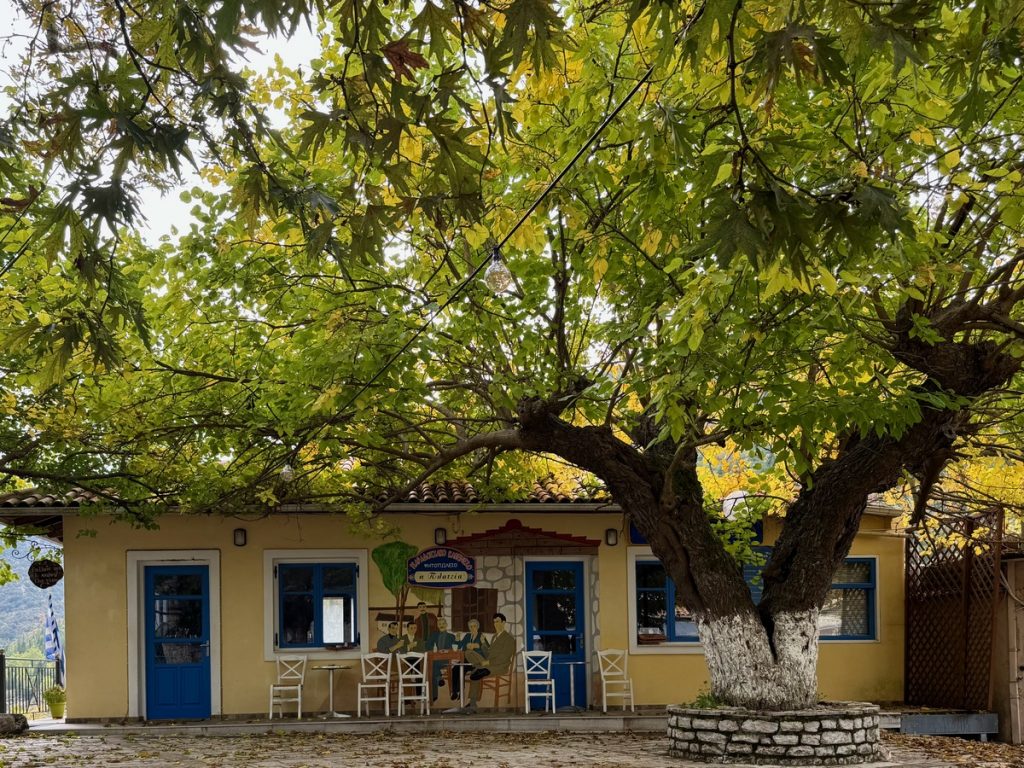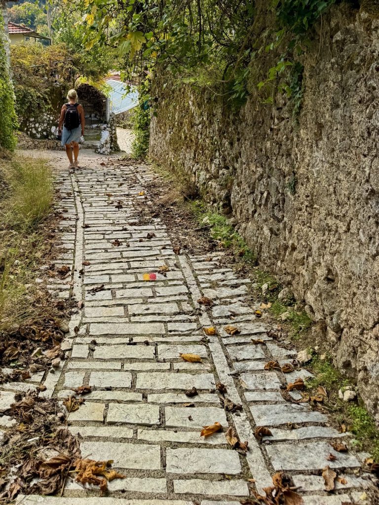 Nach einer guten halben Stunde erreichen wir das Dorf und parken das Auto auf dem zentralen Dorfplatz zwischen Schule und Kirche. Wir beginnen die Wanderung mit einer kleinen Runde durch den Ort, bei dem uns mehrere verfallene Häuser auffallen, vor denen Schilder auf die Einsturzgefahr hinweisen. Das Dorf wirkt noch sehr ursprünglich, aber in Teilen auch verlassen und arm. Es sieht nicht danach aus, dass es hier viele Übernachtungsangebote für zahlungskräftige Touristen gibt. Aber es wird mit den rund um das Dorf existierenden Wanderrouten geworben, die wirklich gut gekennzeichnet sind. Bekannt ist das Dorf für den „Giovannios Berglauf“, der jedes Jahr am ersten Sonntag im Oktober stattfindet. Er erinnert an den aus dem Ort stammenden Marathonläufer Giovanni, der 1896 bei den olympischen Spielen in Athen den schnellsten Marathon lief, allerdings außerhalb des Wettkampfes gestartet war. Zu diesem Ereignis kommen jährlich Hunderte Läufer und starten auf der 27 oder 11,5 km Strecke. Ein weiteres Highlight es Ortes ist das jährlich im August stattfindende Linsenfest, dass ca. einen Kilometer außerhalb des Dorfes auf einem Hochplateau bei der Kirche Agios Donatos stattfindet. Hier sind auch Touristen herzlich willkommen, die verschiedenen Linsengerichte der Region zu kosten.