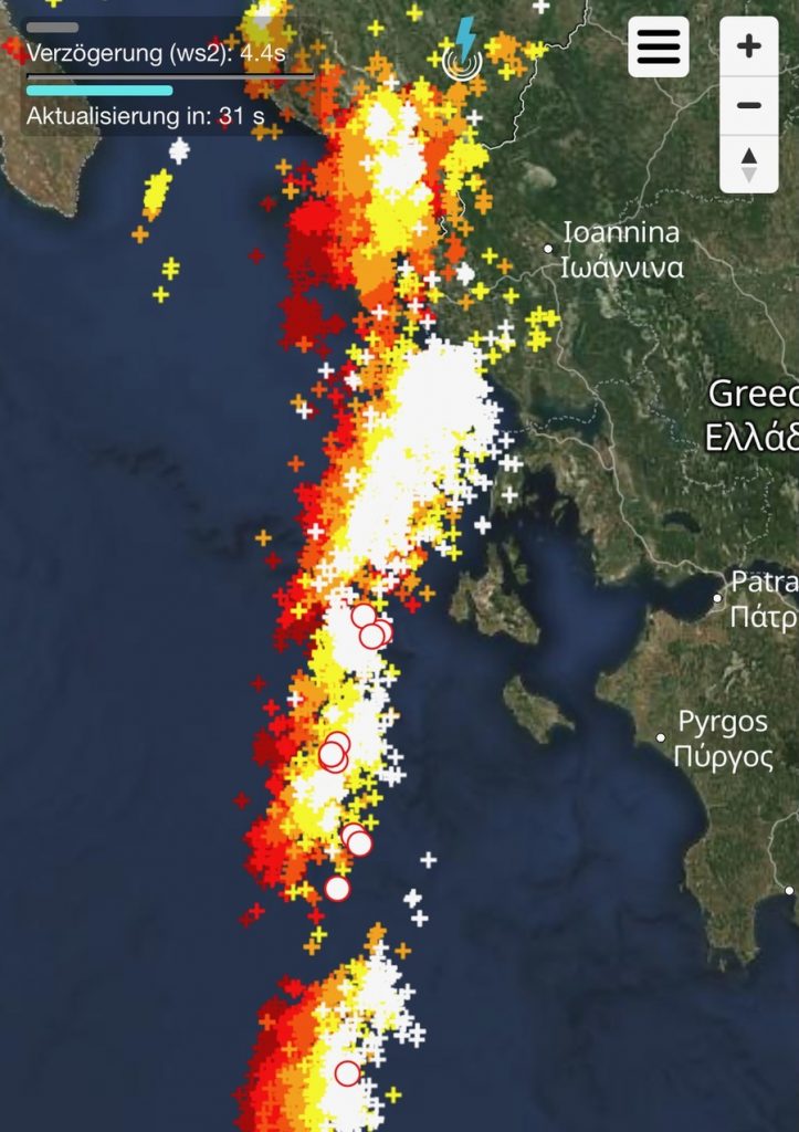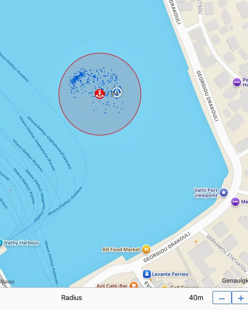 Nun ist es dann doch passiert: der Wetterbericht hat Recht behalten und die nächste Regen- und Sturmfront hat uns voll getroffen. Unser Schwesternschiff die Africa bricht Richtung Norden auf, denn sie haben einen Krantermin in Preveza einzuhalten. Vorhergesagt sind Windstärken von (moderaten) 20-24 Knoten. Wir sehen allerdings Böen mit 35 Knoten und fragen uns, ob es sich dabei vielleicht um katabatische Winde, also Fallböen handeln könnte. Von der Crew der „Africa“ erfahren wir aber, dass sie außerhalb der Bucht ebenfalls derartige Böen gemessen haben. Venga! schwoit ordentlich um den Anker, bekommt den Wind mal mehr von Backbord, dann wieder von Steuerbord. Durch ihre Höhe mit dem Decksalon ist sie deutlich windanfällig und krängt auch mal in die eine, mal in die andere Richtung. Zwei andere Boote slippen vor Anker und müssen den Anker neu setzen oder verholen an die Pier. Unser Anker hält. Wir haben bei 3,5 m Wassertiefe etwa 20m Kette draußen. Das Bild auf der AnkerApp schenkt uns Vertrauen für die Nacht. Wir beschäftigen uns mit privatbürokratischen Themen (Rentenantrag für Barbara – zum Jahresende ist der Arbeitsvertrag gekündigt) und Werner klärt technischen Fragen zum Energiemanagement.