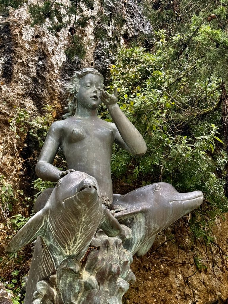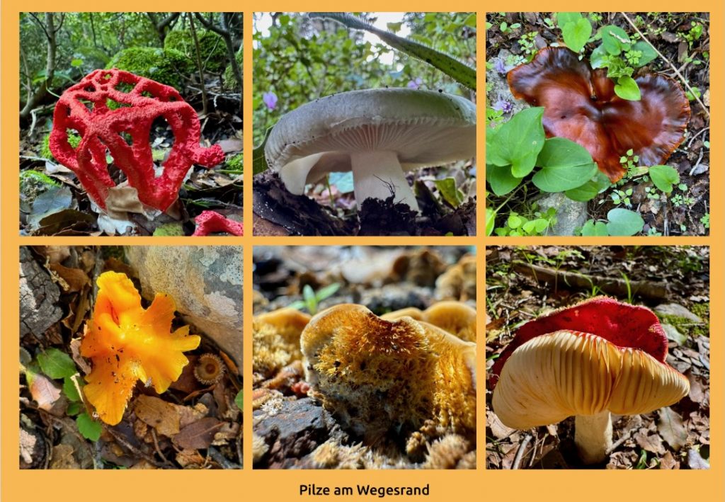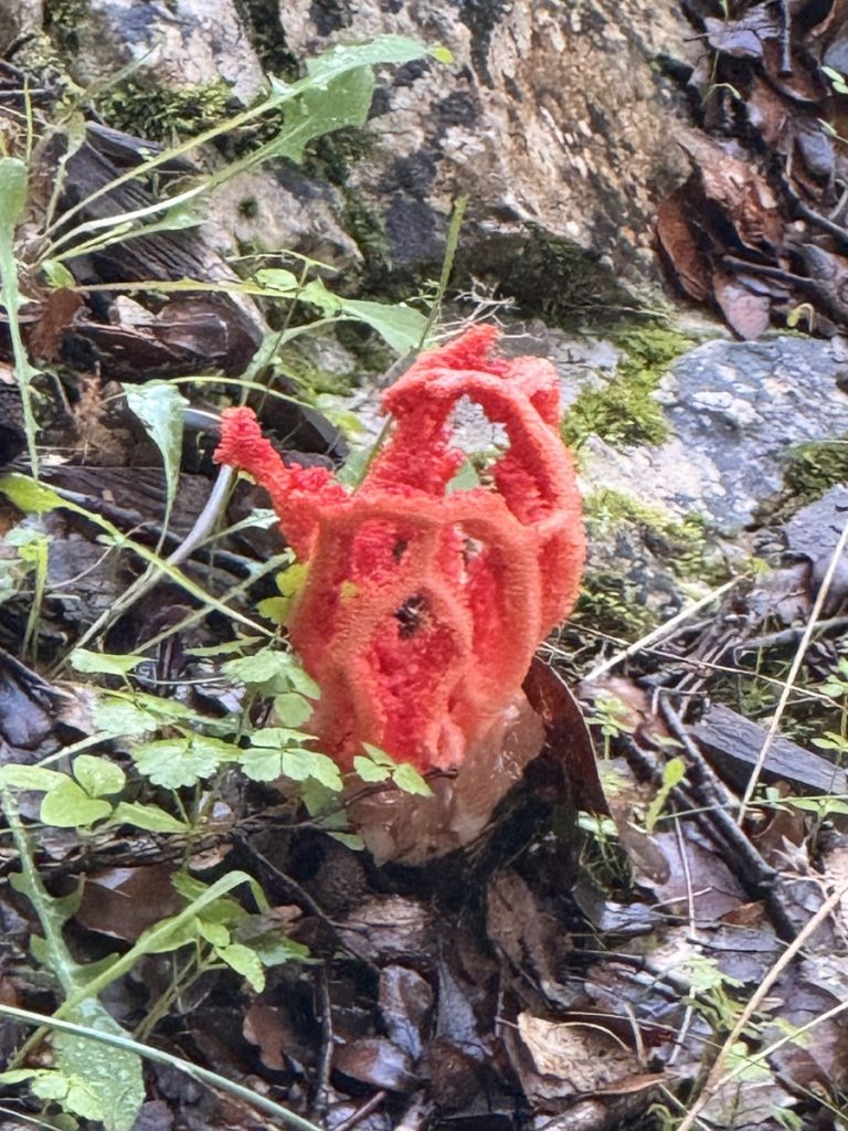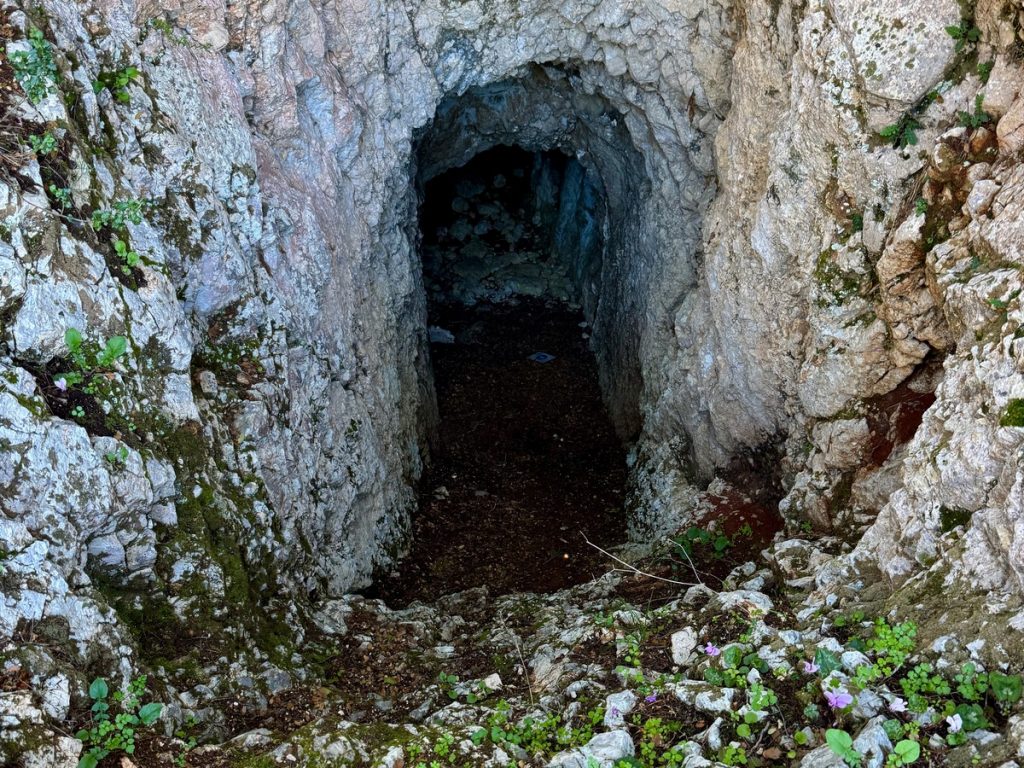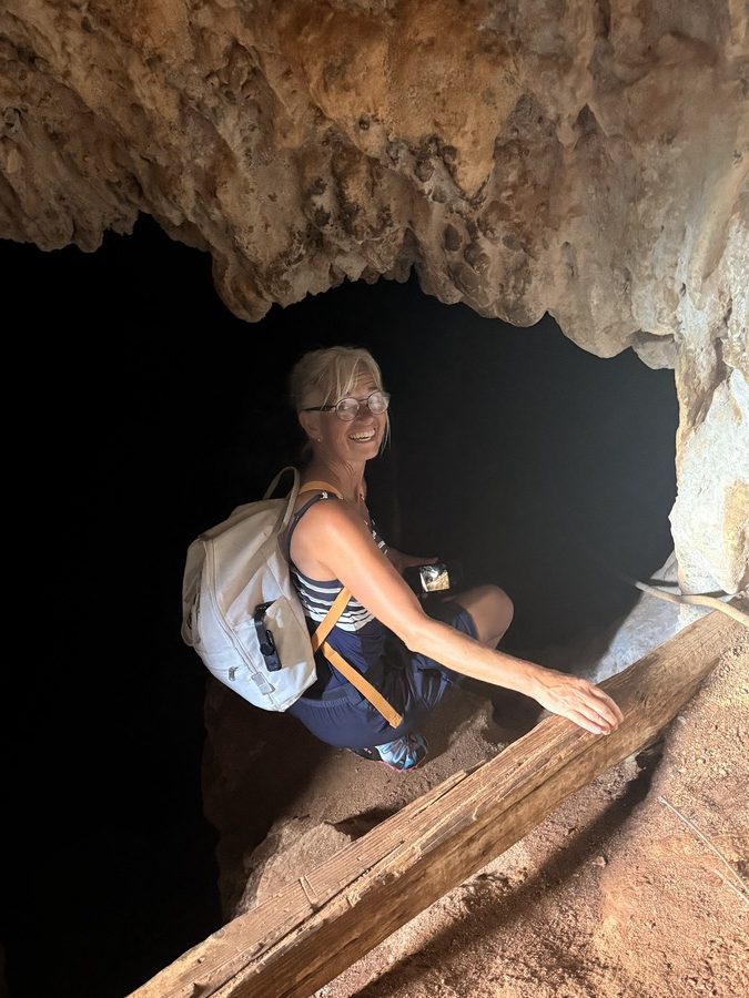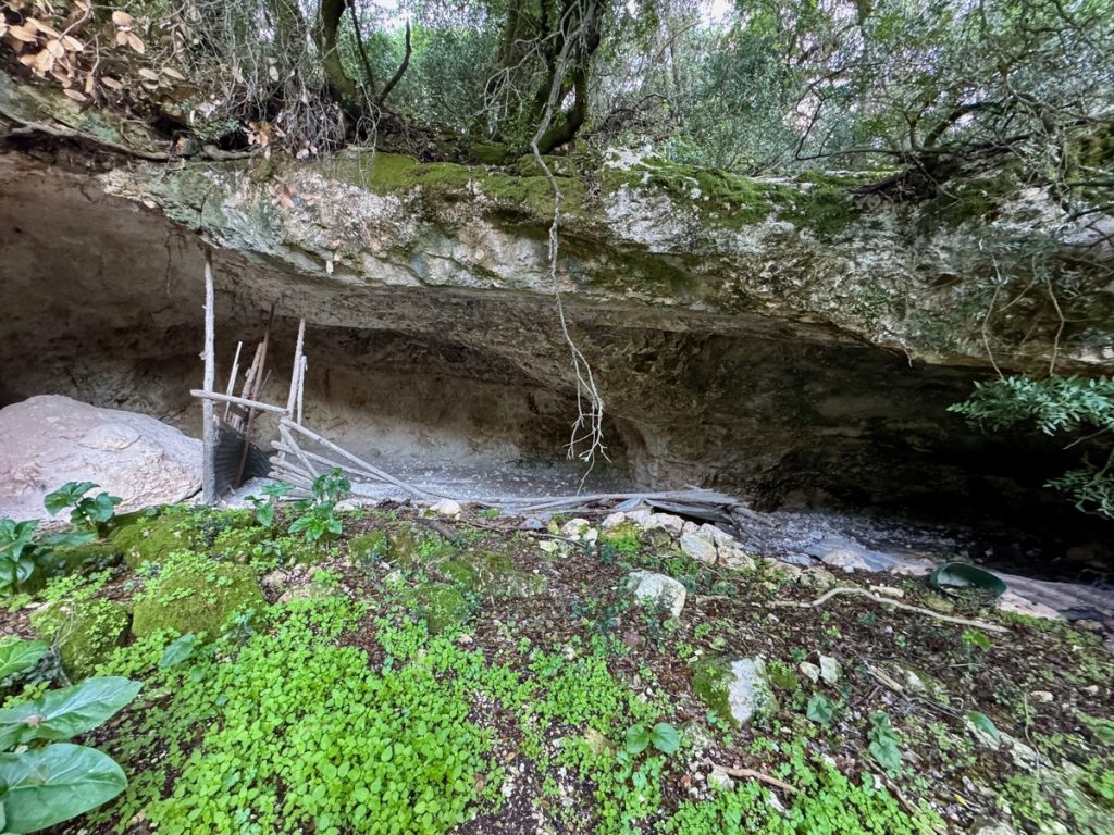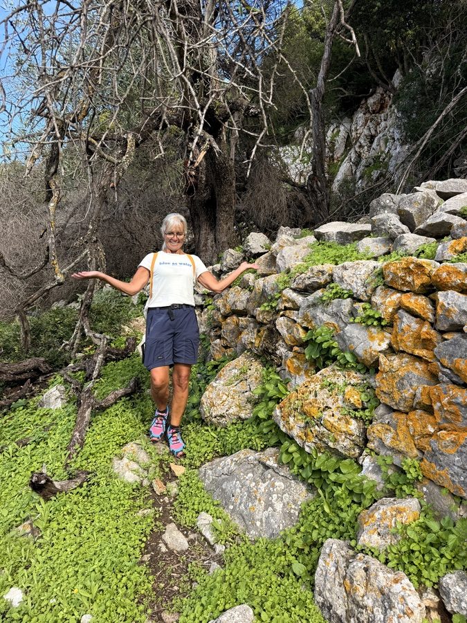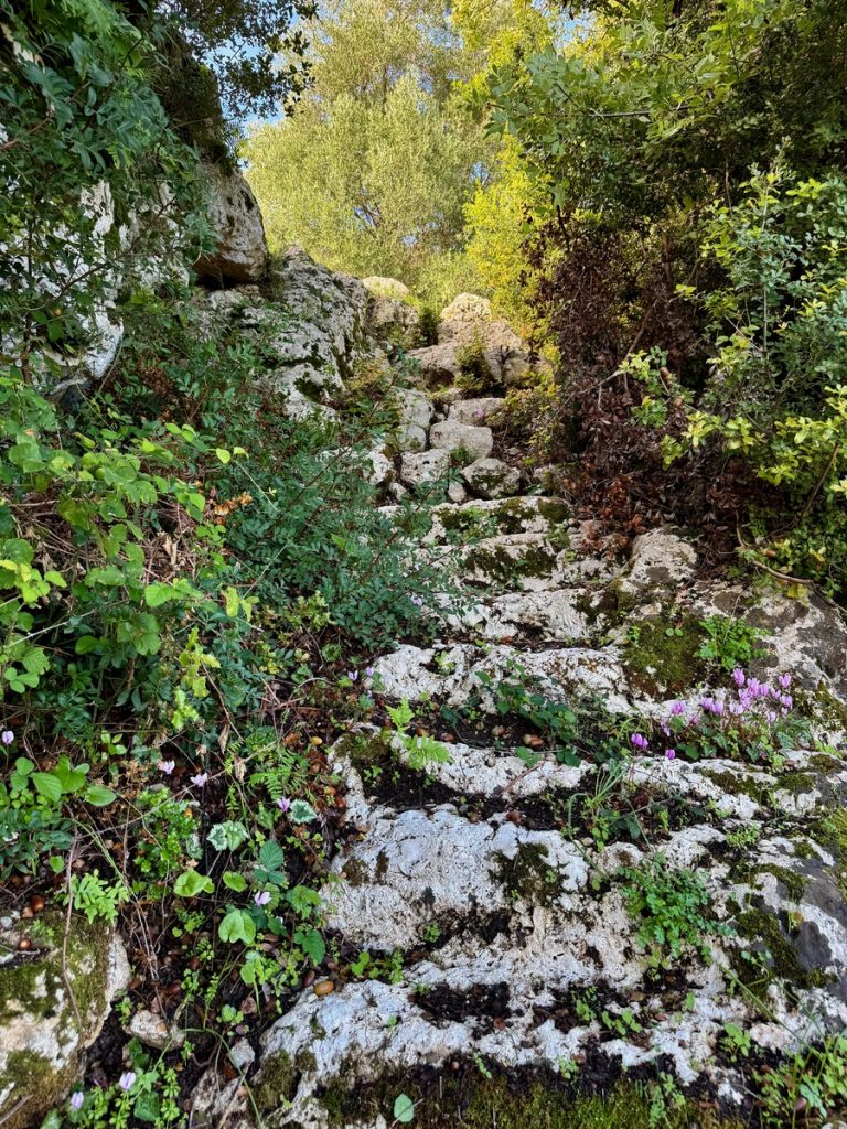 Sie führt uns durch den Ort hinauf bis zur Kirche über gepflasterte Wege, um dann in einen Trampelpfad zu münden. Wir lieben solche kleinen Pfade und folgen diesem anfangs durch Olivenhaine und vorbei an einzelnen Häusern. Heute trägt die Skipperin auch angemessenes Schuhwerk für diese Wanderung auf rutschigen Wegen. In einem Olivenhain entdecken wir merkwürdige rote Gebilde. Mit etwas Fantasie könnte man darin Überbleibsel von Halloween vermuten: blutige Hände, die aus dem Erdreich nach uns greifen. Nein, jetzt geht die Fantasie dann doch mit der Skipperin durch. Werner zoomt mit der Handykamera heran und macht ein Foto, das die KI dann einer Pflanze zuordnet. Es könnte sich um den Roten Gitterling und damit um einen Pilz handeln. Der Weg führt steiler bergan und wir erreichen auf ca. 190 Höhenmetern den Eingang zur Nymphen Höhle.