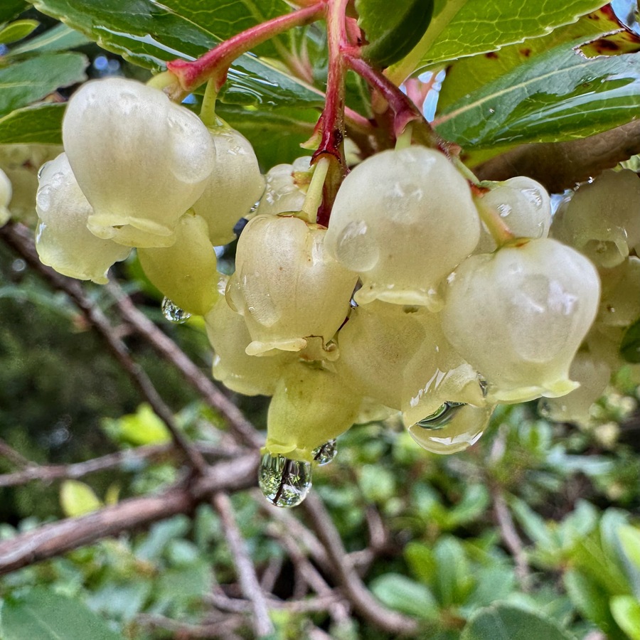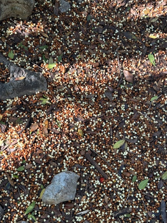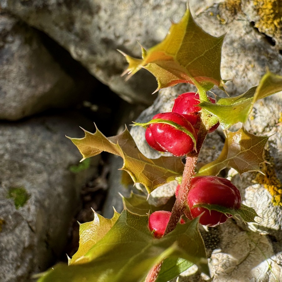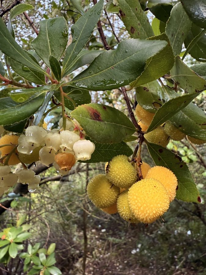 Der Weg führt uns anfangs über einen schmalen Pfad durch einen Wald, der überwiegend aus Erdbeerbäumen und Kermeseiche besteht. Der Boden ist übersäht mit den herabgefallenen zierlichen weißen Glockenblüten des Erdbeerbusches. Hin und wieder liegt auch eine leuchtend rote Buscherdbeere dazwischen. Die Natur scheint uns heute lauter kleine Stillleben zu präsentieren.