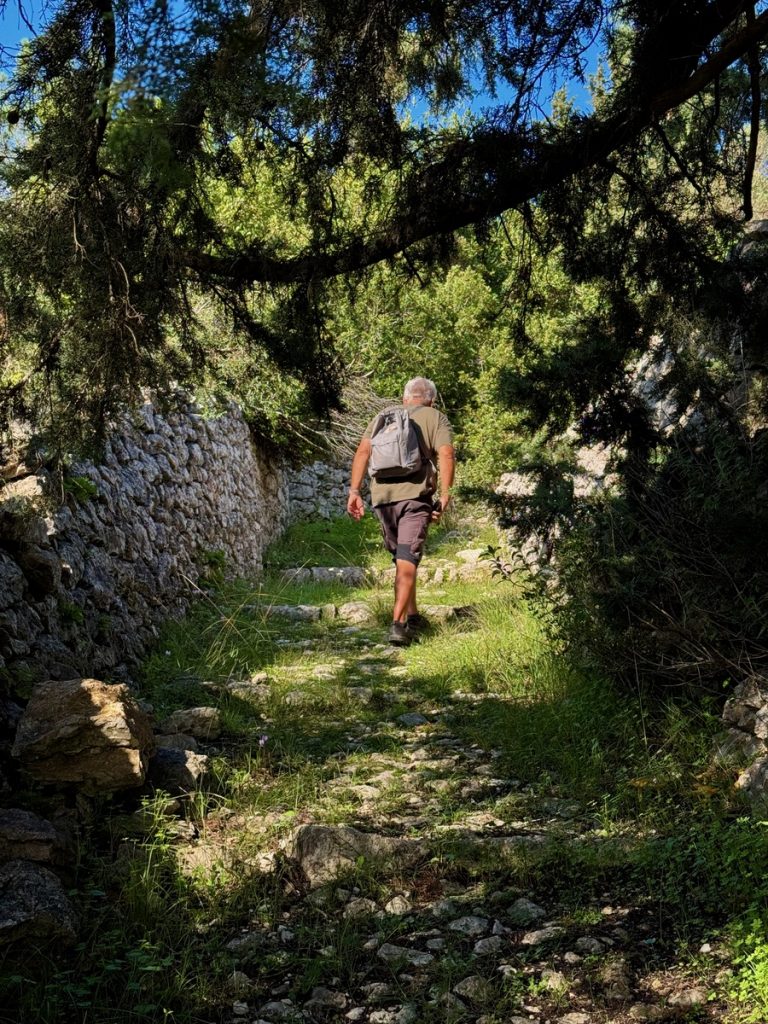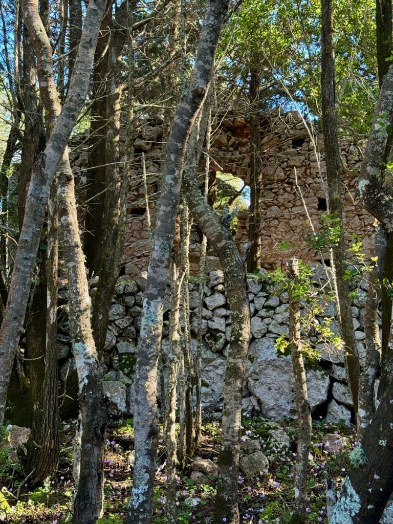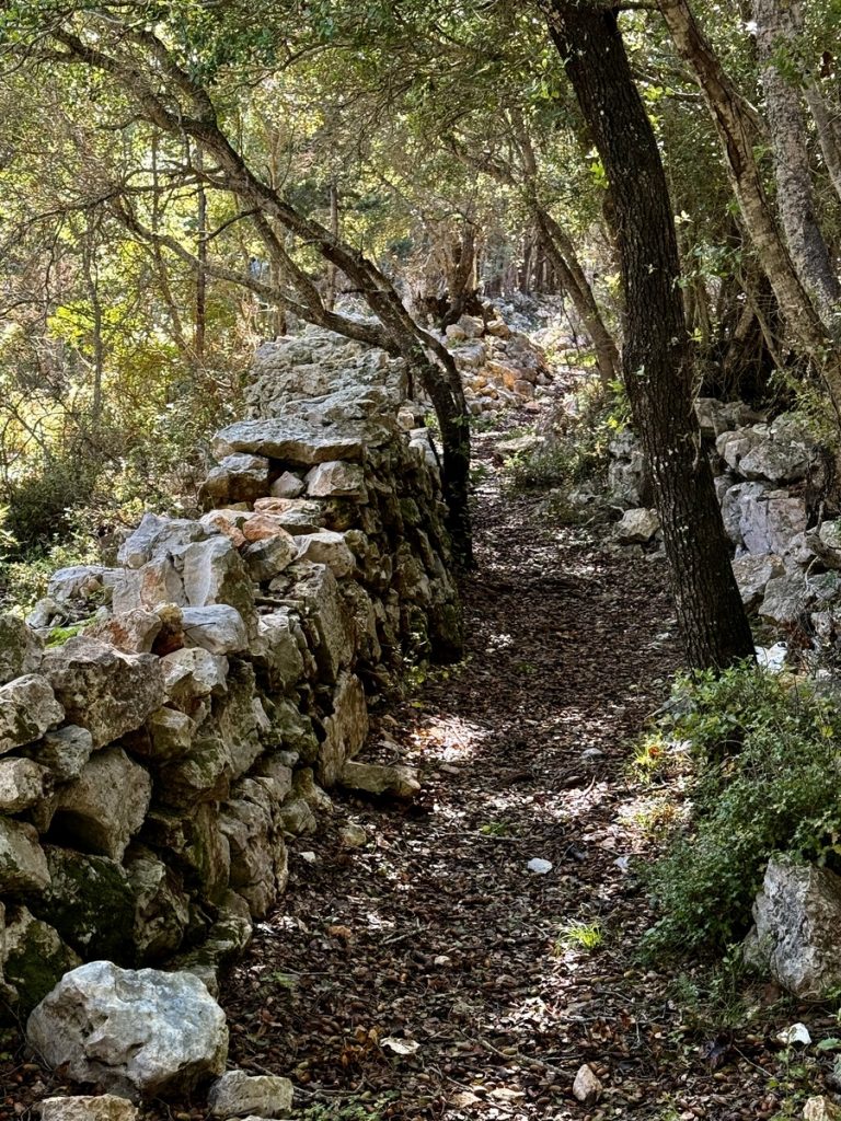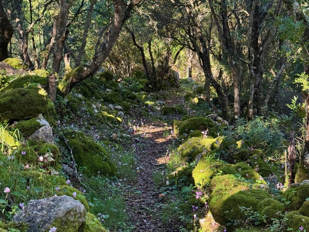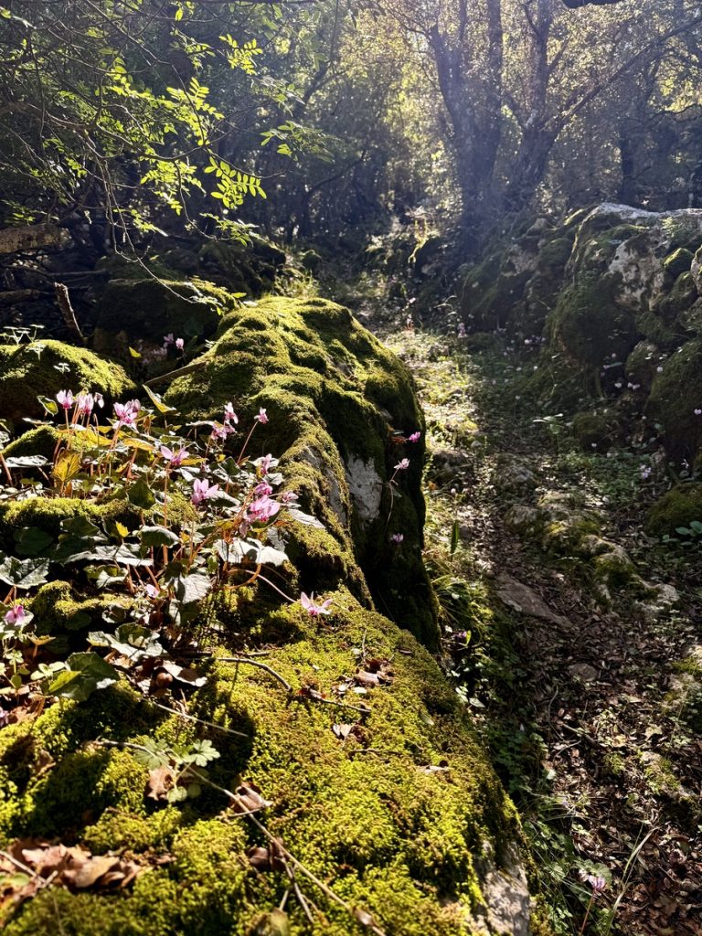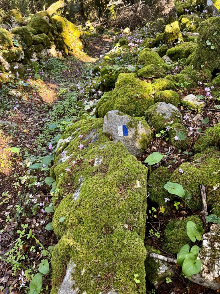 Danach geht es weiter Richtung Süden. Der Weg führt weiterhin durch Wald, der hier aber eher aus Eiche und Wacholder besteht. Zudem wechselt er von einem Trampelpfad zu einem alten Eselsweg. Anfangs liegen große Felsen wie von Riesenhand verstreut im Unterholz, später laufen wir zwischen alten, oft eingefallenen Mauern und kommen immer wieder an Ruinen von Gehöften oder kleinen Dörfern vorbei. Es wirkt so, als sei dieser Teil früher kultiviert und bewirtschaftet worden. Die Markierung ist überwiegend sehr gut. Wir kommen nun auch immer wieder an Pforten, die wir öffnen und hinter uns gewissenhaft wieder schließen. Sie sorgen dafür, dass die Ziegenherden in dem dafür vorgesehenen Bereich bleiben. Das Spiel von Licht und Schatten fesselt uns immer wieder. Mal wird dadurch ein einzelner hübscher Pilz in Szene gesetzt, dann wieder ein Pulk der unzähligen wilden Alpenveilchen. Manchmal wird es fast dunkel und die uns begleitenden Steinwälle sind mit dicken Moospolstern überzogen – würde jemand erzählen, er habe hier Feen und Trolle gesehen, wir würden es (fast) glauben.