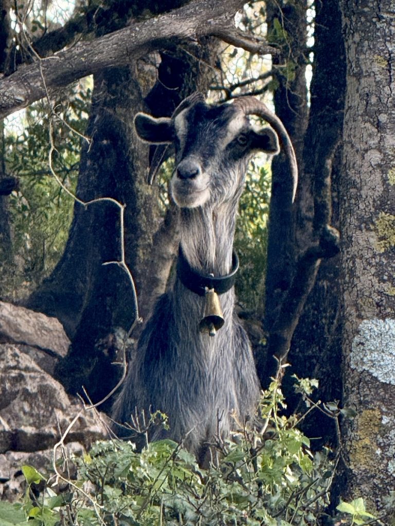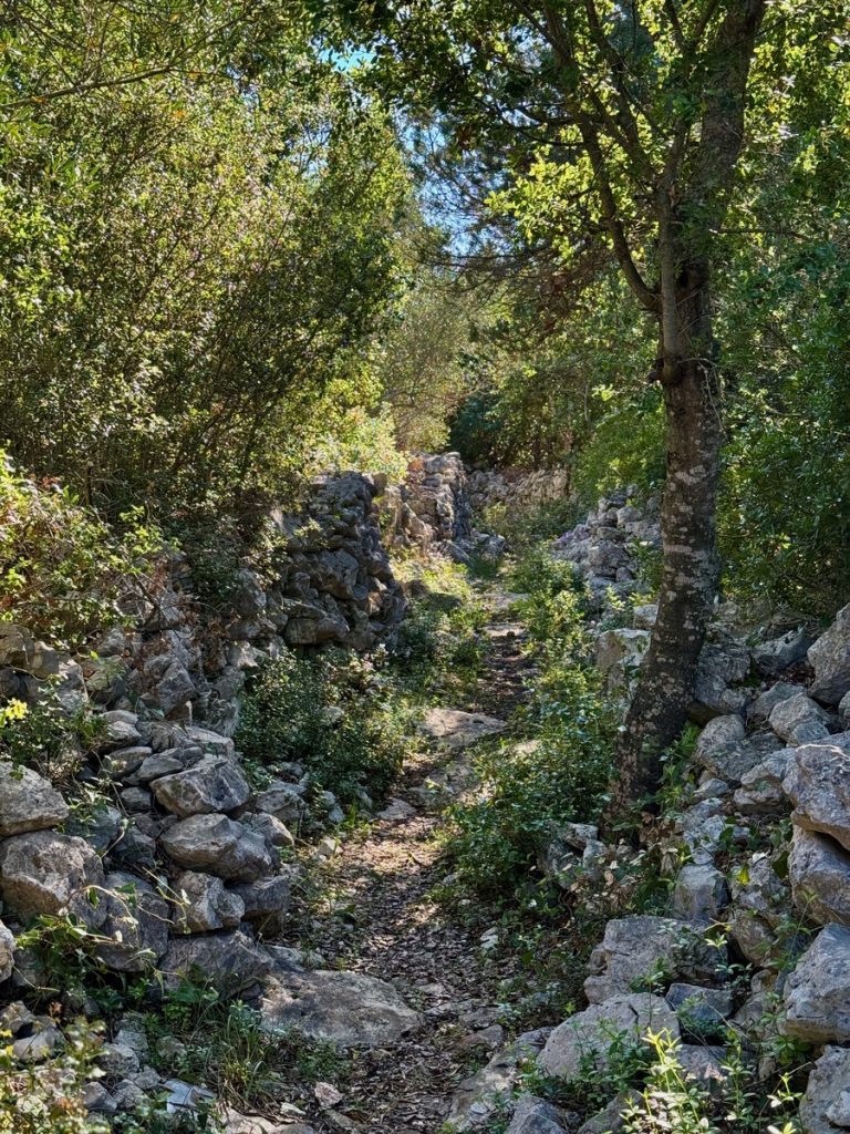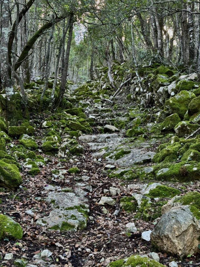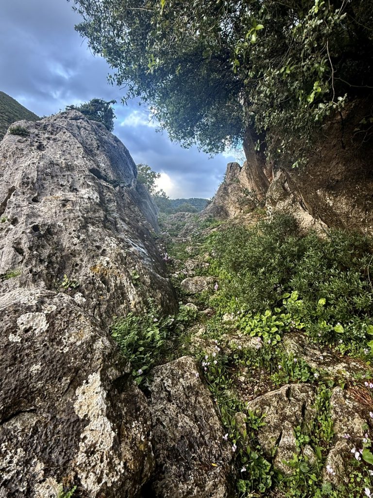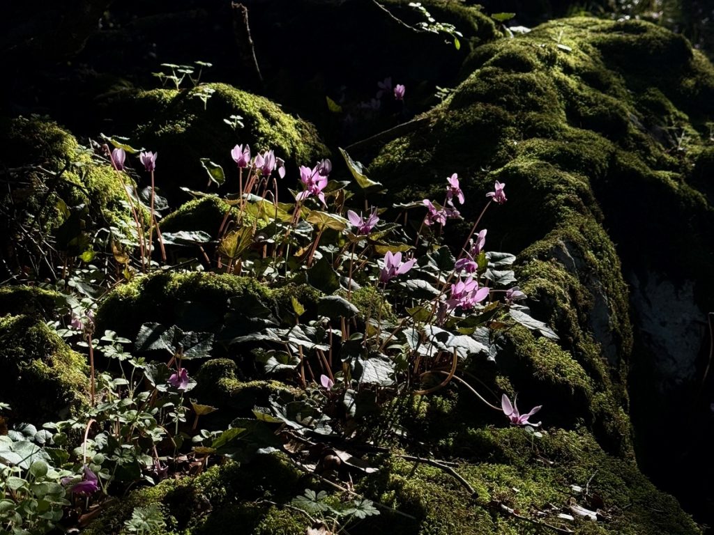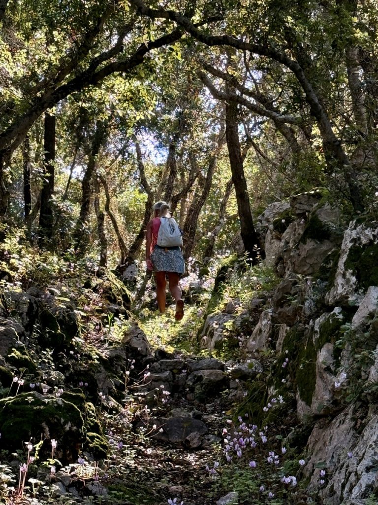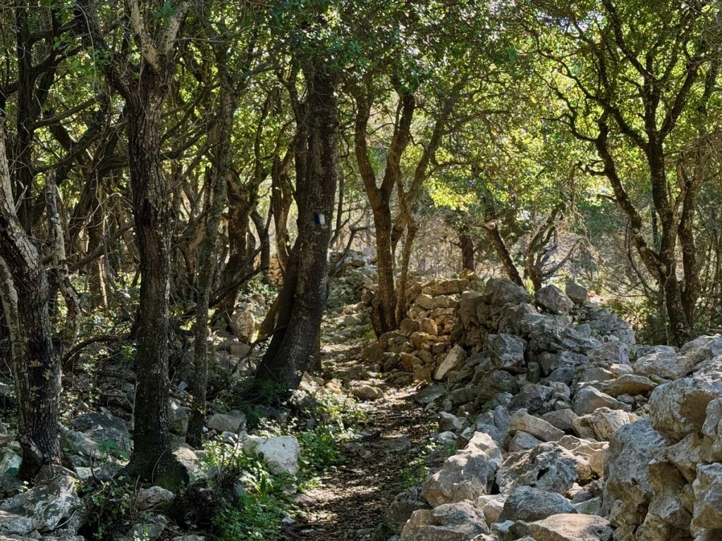 Danach geht es weiter Richtung Süden. Der Weg führt weiterhin durch Wald, der hier aber eher aus Eiche und Wacholder besteht. Zudem wechselt er von einem Trampelpfad zu einem alten Eselsweg. Anfangs liegen große Felsen wie von Riesenhand verstreut im Unterholz, später laufen wir zwischen alten, oft eingefallenen Mauern und kommen immer wieder an Ruinen von Gehöften oder kleinen Dörfern vorbei. Es wirkt so, als sei dieser Teil früher kultiviert und bewirtschaftet worden. Die Markierung ist überwiegend sehr gut. Wir kommen nun auch immer wieder an Pforten, die wir öffnen und hinter uns gewissenhaft wieder schließen. Sie sorgen dafür, dass die Ziegenherden in dem dafür vorgesehenen Bereich bleiben. Das Spiel von Licht und Schatten fesselt uns immer wieder. Mal wird dadurch ein einzelner hübscher Pilz in Szene gesetzt, dann wieder ein Pulk der unzähligen wilden Alpenveilchen. Manchmal wird es fast dunkel und die uns begleitenden Steinwälle sind mit dicken Moospolstern überzogen – würde jemand erzählen, er habe hier Feen und Trolle gesehen, wir würden es (fast) glauben.