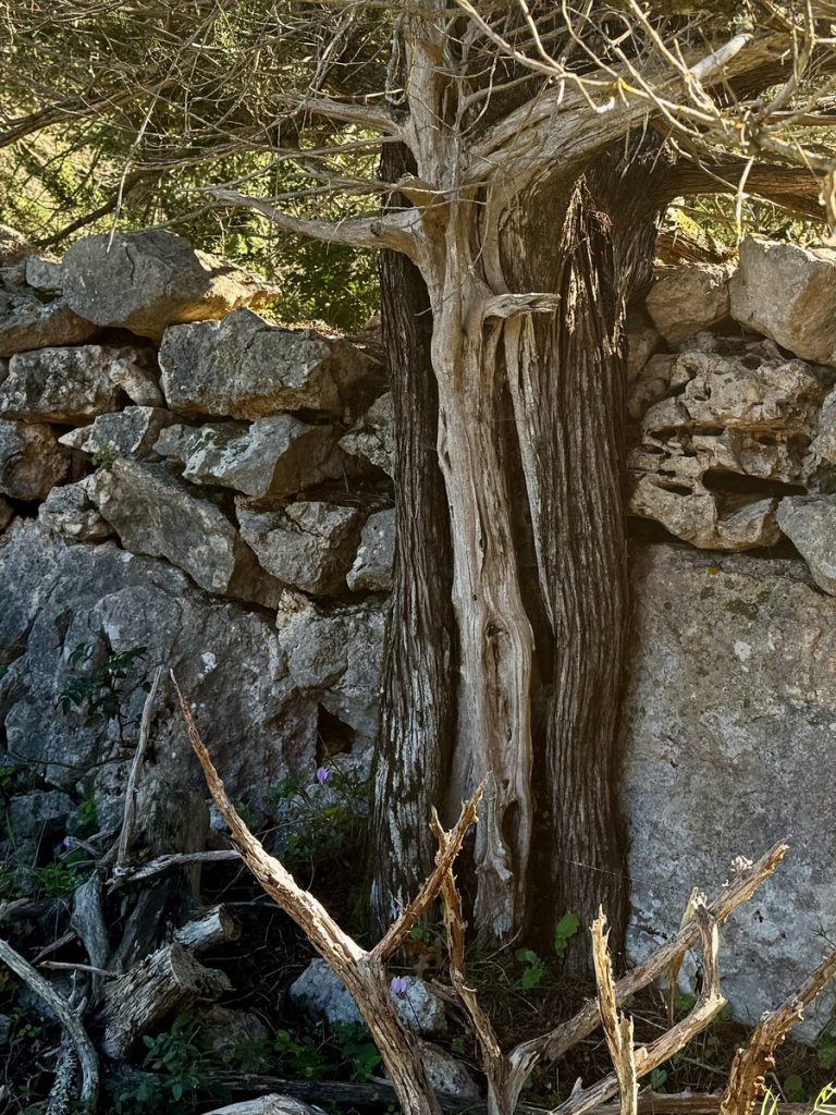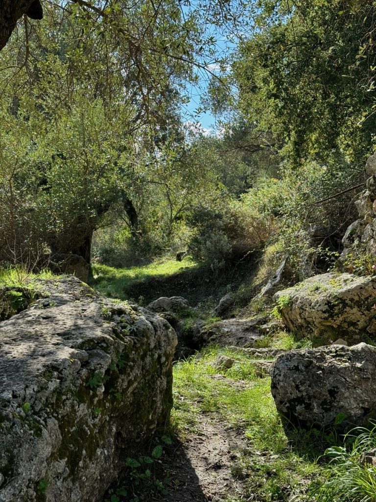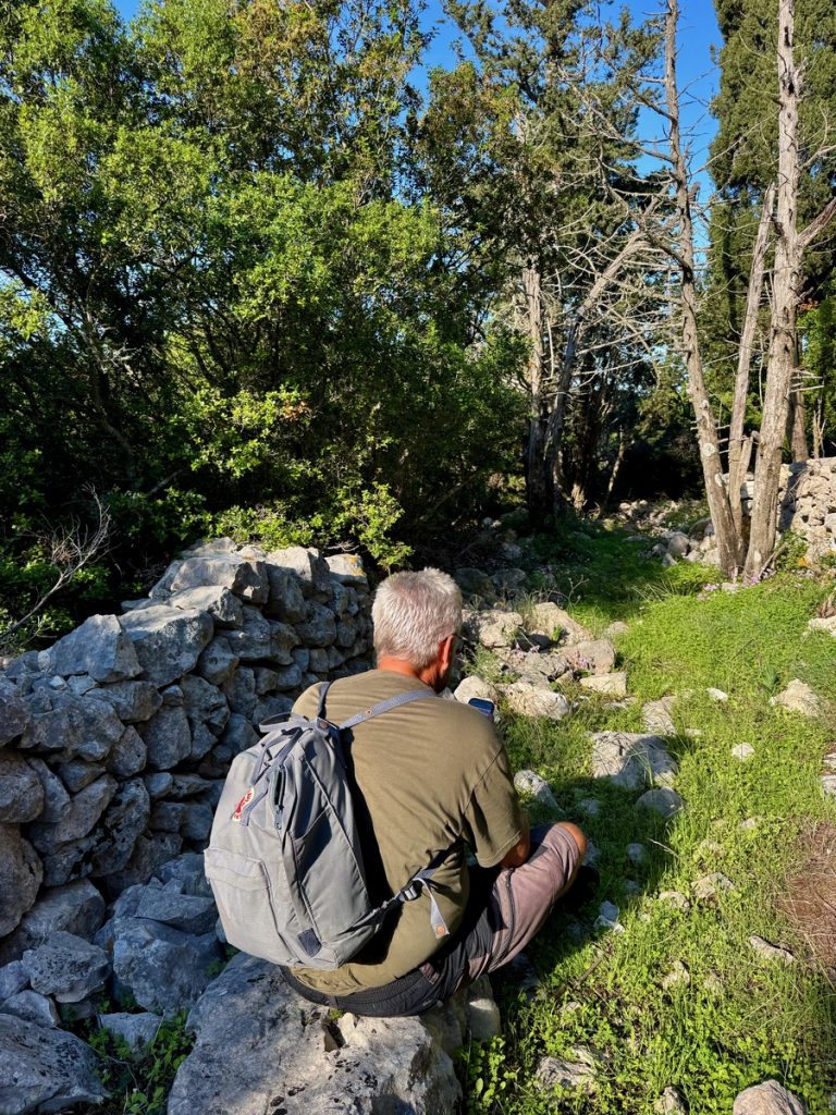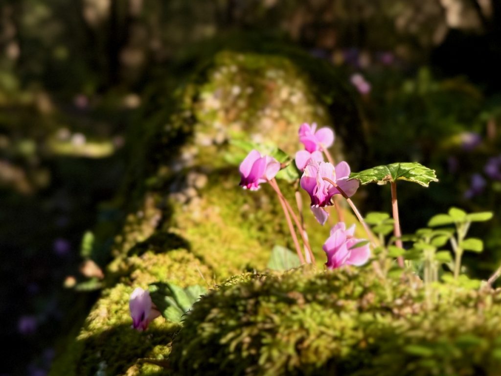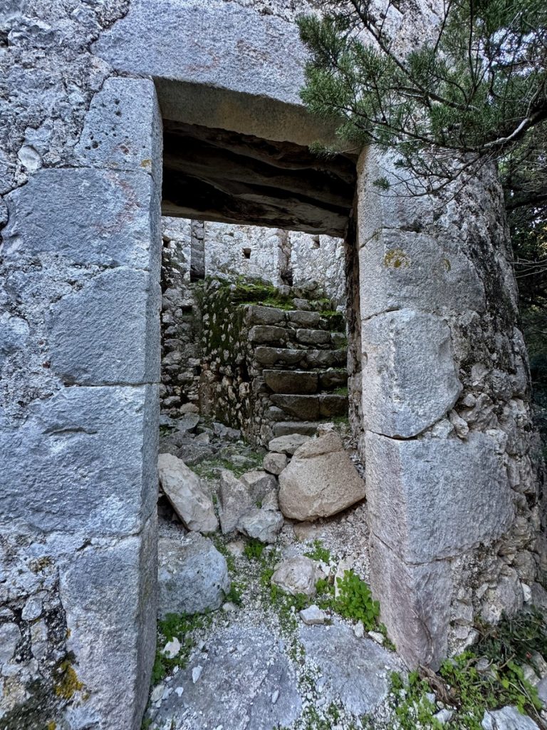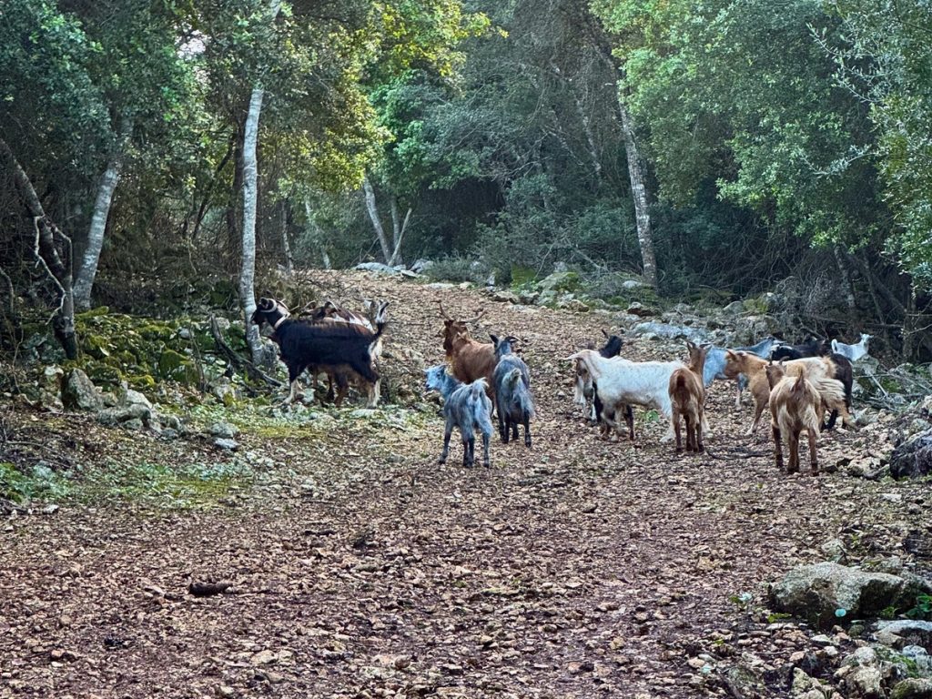 Danach geht es weiter Richtung Süden. Der Weg führt weiterhin durch Wald, der hier aber eher aus Eiche und Wacholder besteht. Zudem wechselt er von einem Trampelpfad zu einem alten Eselsweg. Anfangs liegen große Felsen wie von Riesenhand verstreut im Unterholz, später laufen wir zwischen alten, oft eingefallenen Mauern und kommen immer wieder an Ruinen von Gehöften oder kleinen Dörfern vorbei. Es wirkt so, als sei dieser Teil früher kultiviert und bewirtschaftet worden. Die Markierung ist überwiegend sehr gut. Wir kommen nun auch immer wieder an Pforten, die wir öffnen und hinter uns gewissenhaft wieder schließen. Sie sorgen dafür, dass die Ziegenherden in dem dafür vorgesehenen Bereich bleiben. Das Spiel von Licht und Schatten fesselt uns immer wieder. Mal wird dadurch ein einzelner hübscher Pilz in Szene gesetzt, dann wieder ein Pulk der unzähligen wilden Alpenveilchen. Manchmal wird es fast dunkel und die uns begleitenden Steinwälle sind mit dicken Moospolstern überzogen – würde jemand erzählen, er habe hier Feen und Trolle gesehen, wir würden es (fast) glauben.