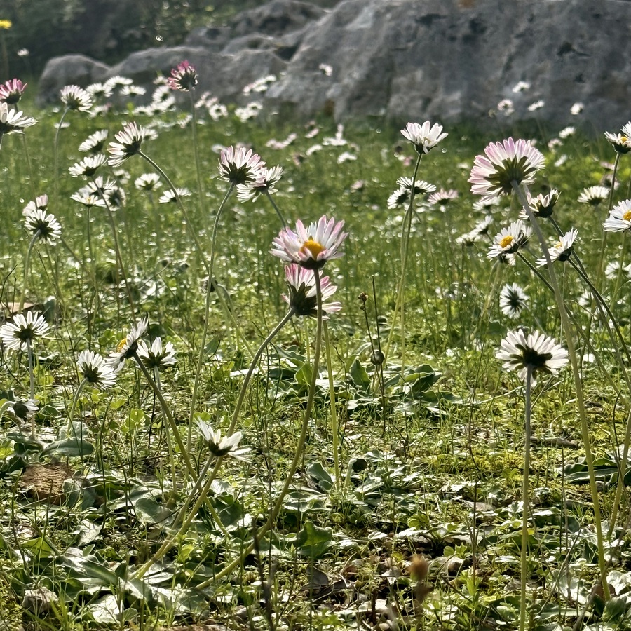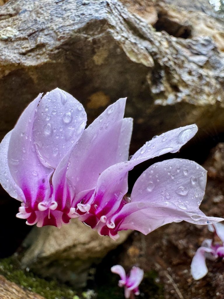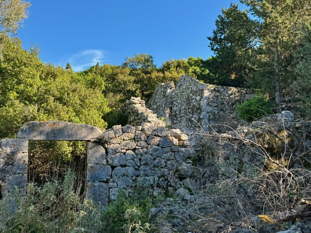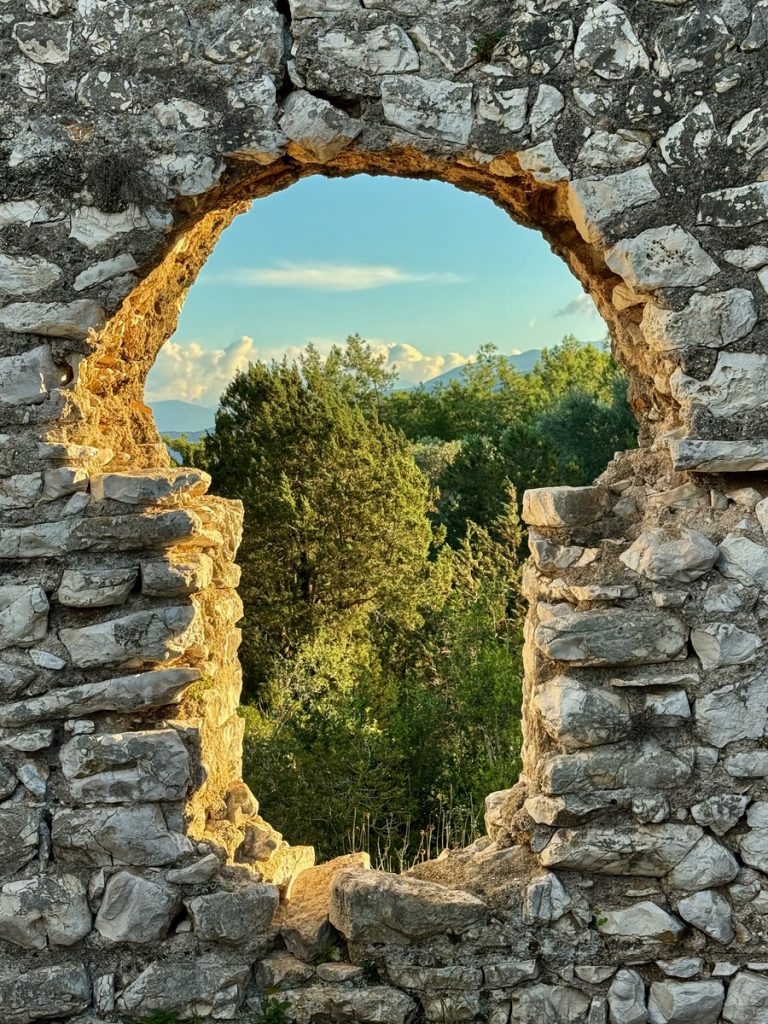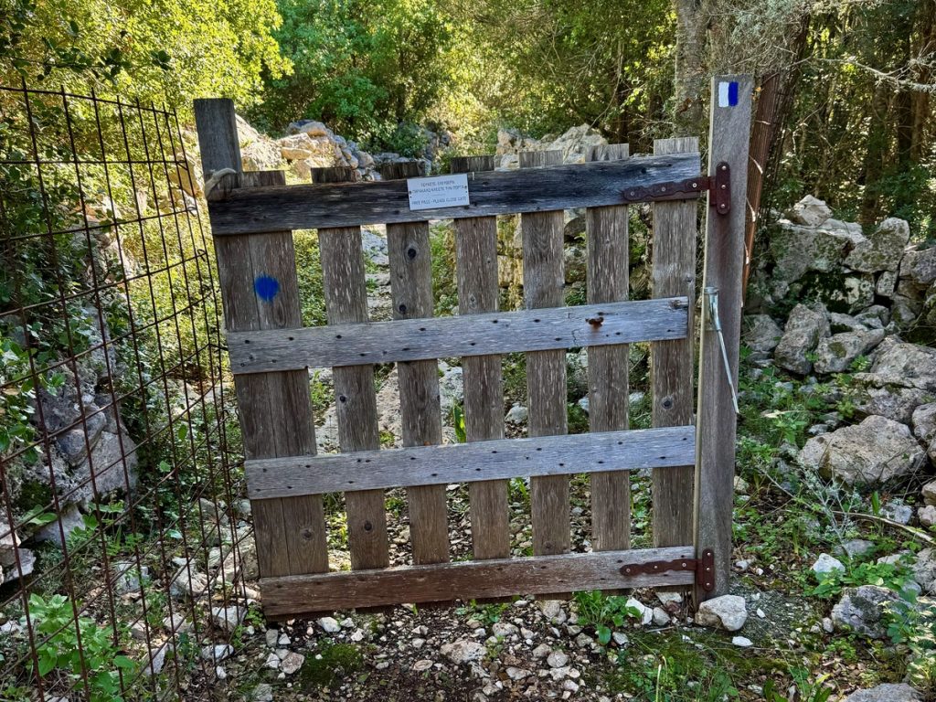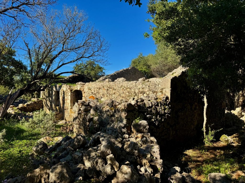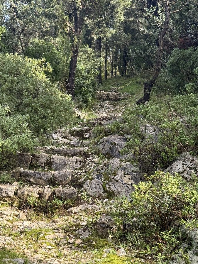 Danach geht es weiter Richtung Süden. Der Weg führt weiterhin durch Wald, der hier aber eher aus Eiche und Wacholder besteht. Zudem wechselt er von einem Trampelpfad zu einem alten Eselsweg. Anfangs liegen große Felsen wie von Riesenhand verstreut im Unterholz, später laufen wir zwischen alten, oft eingefallenen Mauern und kommen immer wieder an Ruinen von Gehöften oder kleinen Dörfern vorbei. Es wirkt so, als sei dieser Teil früher kultiviert und bewirtschaftet worden. Die Markierung ist überwiegend sehr gut. Wir kommen nun auch immer wieder an Pforten, die wir öffnen und hinter uns gewissenhaft wieder schließen. Sie sorgen dafür, dass die Ziegenherden in dem dafür vorgesehenen Bereich bleiben. Das Spiel von Licht und Schatten fesselt uns immer wieder. Mal wird dadurch ein einzelner hübscher Pilz in Szene gesetzt, dann wieder ein Pulk der unzähligen wilden Alpenveilchen. Manchmal wird es fast dunkel und die uns begleitenden Steinwälle sind mit dicken Moospolstern überzogen – würde jemand erzählen, er habe hier Feen und Trolle gesehen, wir würden es (fast) glauben.