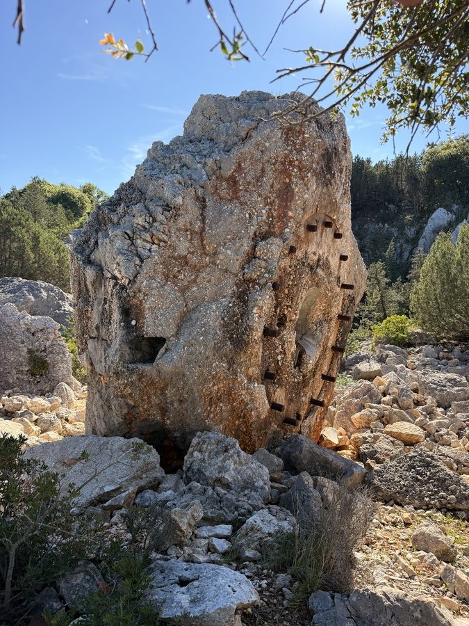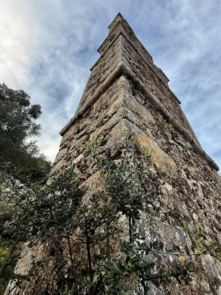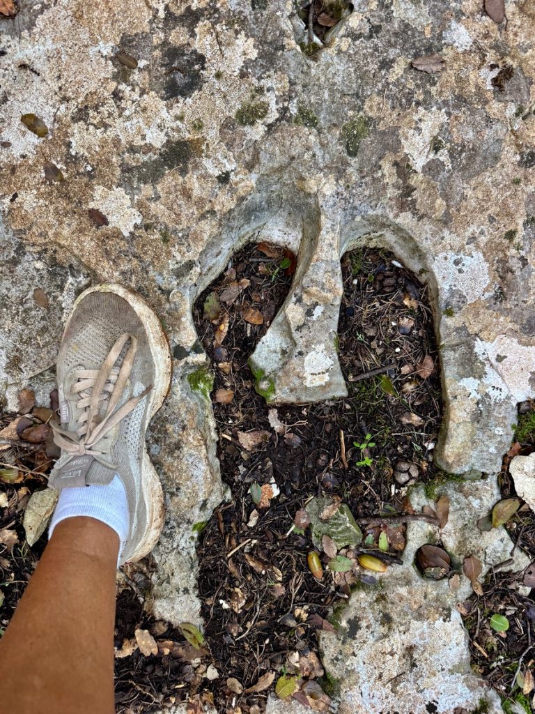 Nach diesem Abstecher geht es auf gleichem Weg zurück bis zum Abzweig nach Fiskardo. Der Skipper hat sich noch nicht bewegt, also beschließt die Skipperin nicht länger zu warten und den Rückweg zur Venga! einzuschlagen. Dazu geht es wieder durch den Wald, der bei nun tiefstehender Sonne vollständig im Schatten liegt. Mit den Geräuschen von aufgescheuchten Vögeln, einer nervösen Ziegenherde und knarzenden Geräuschen der Bäume, bekommt er schon fast etwas Gruseliges – und dann findet sie auch noch einen Fußabdruck eines Urtiers…. Bitte jetzt nicht umknicken oder hinfallen und hier auf Hilfe warten müssen! Zwei Stunden später klingelt das Telefon: der Skipper ist fertig und sucht sich nun den kürzesten Weg zum Hafen – sehr vernünftig. Die Skipperin passiert derweil noch eine Windmühlenruine und eine Höhle, bevor es endgültig bergab nach Fiskardo geht. Das Dinghi wartet brav am Hafen. Ein Blick auf die „wo ist App“ zeigt ihr, dass der Skipper noch ein gutes Stück entfernt ist. So setzt sie alleine über und nutzt die Zeit für eine warme Dusche auf der Badeplattform, bevor heute sie die Fährfrau für den Skipper spielt.
