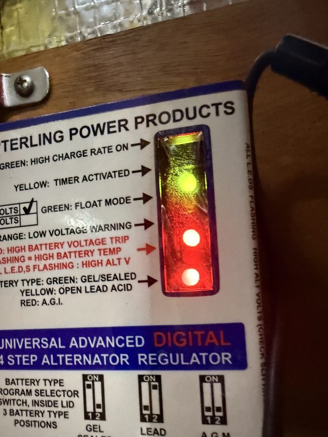 Werner lässt zudem das Problem mit unserem Energiemanagement nicht los. Der Batteriestand begrüßt uns morgens mit nur noch 65% (50% ist bei unserem Batterietyp schon die Untergrenze, die nicht unterschritten werden sollte). Als zusätzliche Sparmaßnahme schalten wir den Kühlschrank aus. Der Inhalt ist sowieso stark geschrumpft und gekühlte Getränke sind uns im Augenblick nicht wichtig. Werner versucht das Problem weiter einzugrenzen. Unser Trennrelais/Booster sollte eigentlich über verschiedene Leuchtdioden anzeigen, was er tut oder wo es Probleme gibt. Es gibt insgesamt 5 Leuchtdioden – keine leuchtet. Es stellt sich die Frage, ob die mangelnde Spannung beim Laden tatsächlich ein Fehler der Lichtmaschine ist, oder eher dieser „Blackbox“. Als erstes testet Werner, ob er das lose Kabel an der „Blackbox“ anschließen kann, um die Dioden wieder zum Leuchten zu bringen. McGyver ist erfolgreich: drei Dioden leuchten und er kann nun im Internet recherchieren, was ihm die Farben der Dioden sagen wollen und damit den Fehler weiter einkreisen. Das Display zeigt uns bei laufender Maschine jetzt zumindest eine Ladung der Batterien mit knapp 24 Ah an, allerdings immer noch mit nur 13V. Es könnten und sollten bei dem Batterietyp (AGM) 14,4V sein.