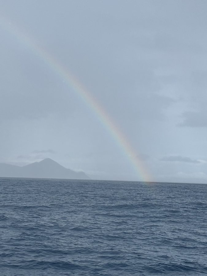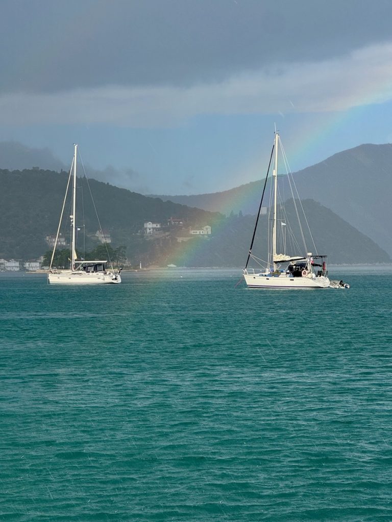 In den frühen Morgenstunden ziehen ergiebige Regenschauer über uns hinweg, aber im Laufe des Vormittags zeigt sich ein milchiger Ball hinter den Wolken und zaubert einen schönen Regenbogen über die hinter uns liegenden Boote im Ankerfeld. Im Norden reißt der Himmel auf und als das Regenradar keine Schauer mehr anzeigt, wagen wir den Start zu einer Rundwanderung.