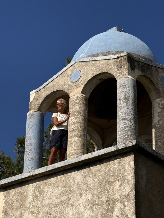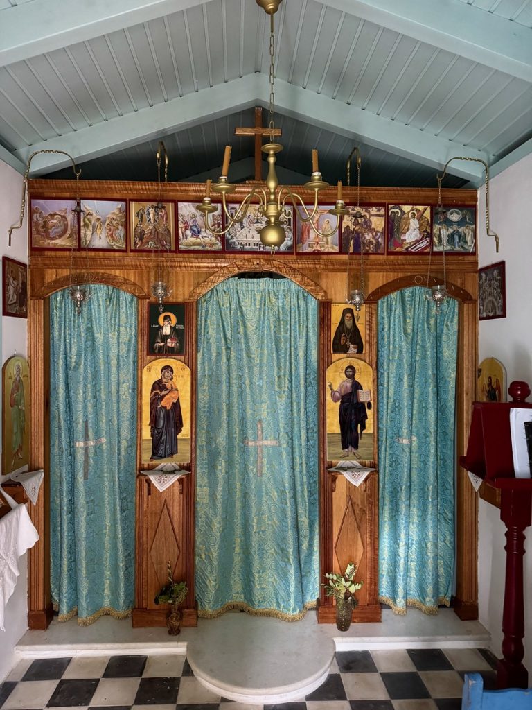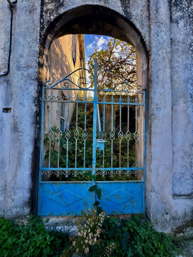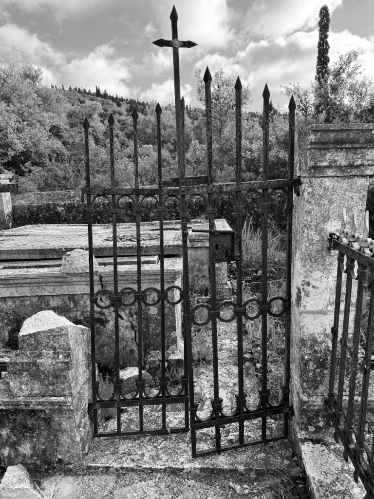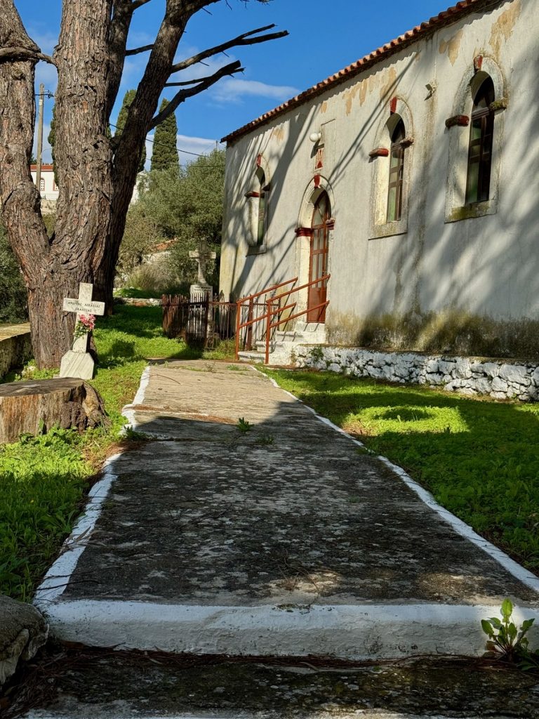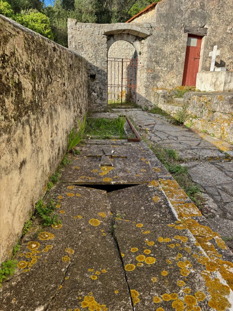 Um die Zeit bis zum Ende der Videokonferenz zu nutzen, macht sie einen Abstecher vom Weg zur Kirche Agios Spyridon und in den Ort Germenata. Beides befindet sich in griechisch-morbidem Zustand. Vermutlich wegen einer Leckage im Dach, wurde die Kirche mit einer Plane überzogen, die unterdessen allerdings in Fetzen an den Seiten herunterhängt. Betreten kann man sie nicht – abgeschlossen. Aber durch das Fenster der Eingangstür sind die bunten Scheiben der Fenster zu erkennen, die auch bei genauer Betrachtung von außen sichtbar sind. Der Friedhof rundherum besteht aus zum Teil sehr alten Familiengräbern, die mit Gusseisernen Zäunen abgetrennt wurden. Einige der alten Grabdeckel sind eingebrochen. Über einen weiteren Eselsweg ist die allein liegende Kirche mit dem kleinen Ort „Germenata“ verbunden. Offensichtlich wird dieser Weg jedoch wenig benutzt, denn er ist teilweise von umgestürzten Bäumen und herabgefallenen Ästen versperrt. Mit etwas Kletterei, sind aber auch diese Hindernisse zu überwinden. In dem kleinen Ort ist das eine oder andere Haus sogar noch bewohnt, aber es ist offensichtlich, dass die meisten Fenster und Türen seit vielen Jahren nicht geöffnet wurden.
