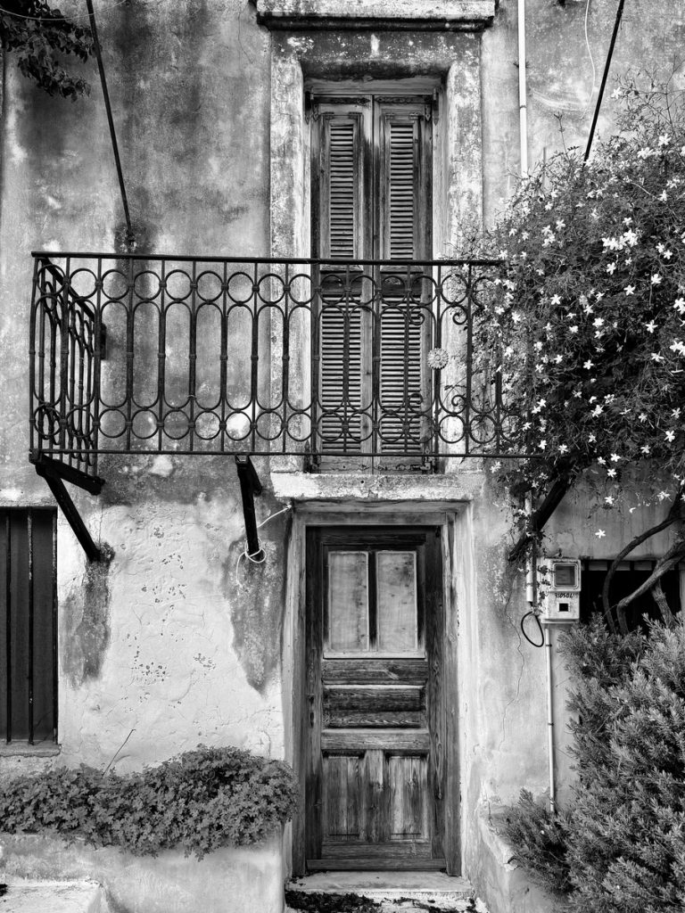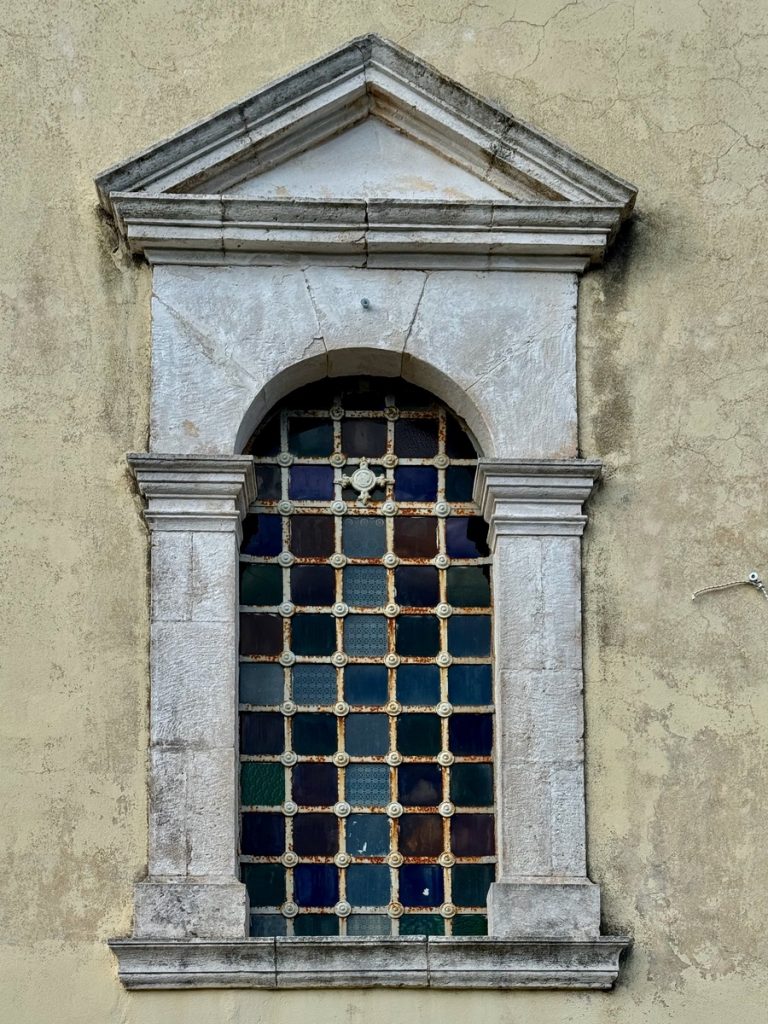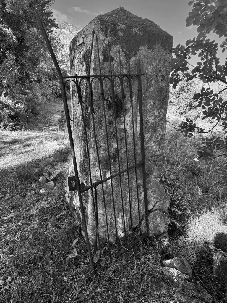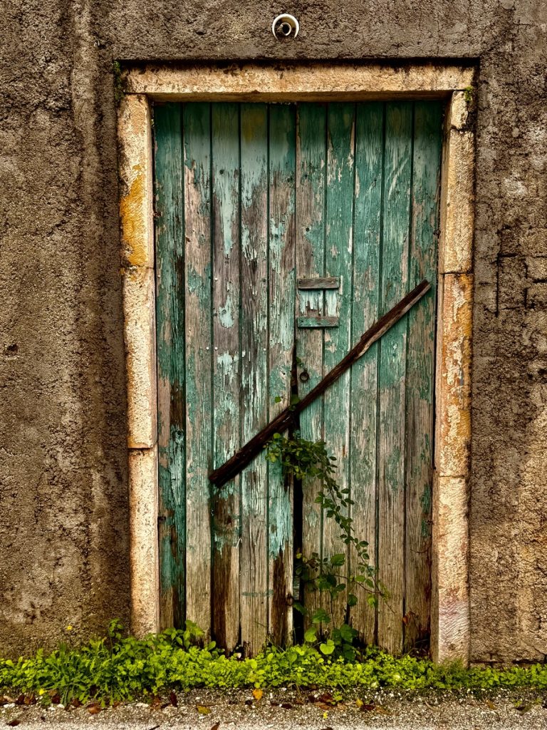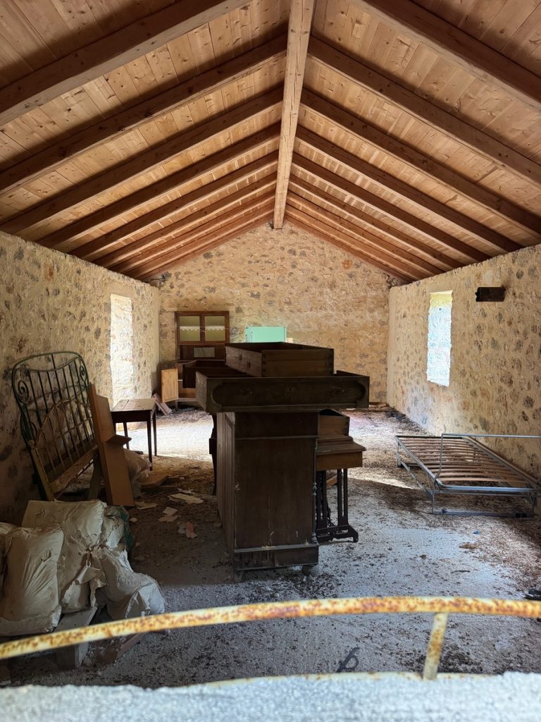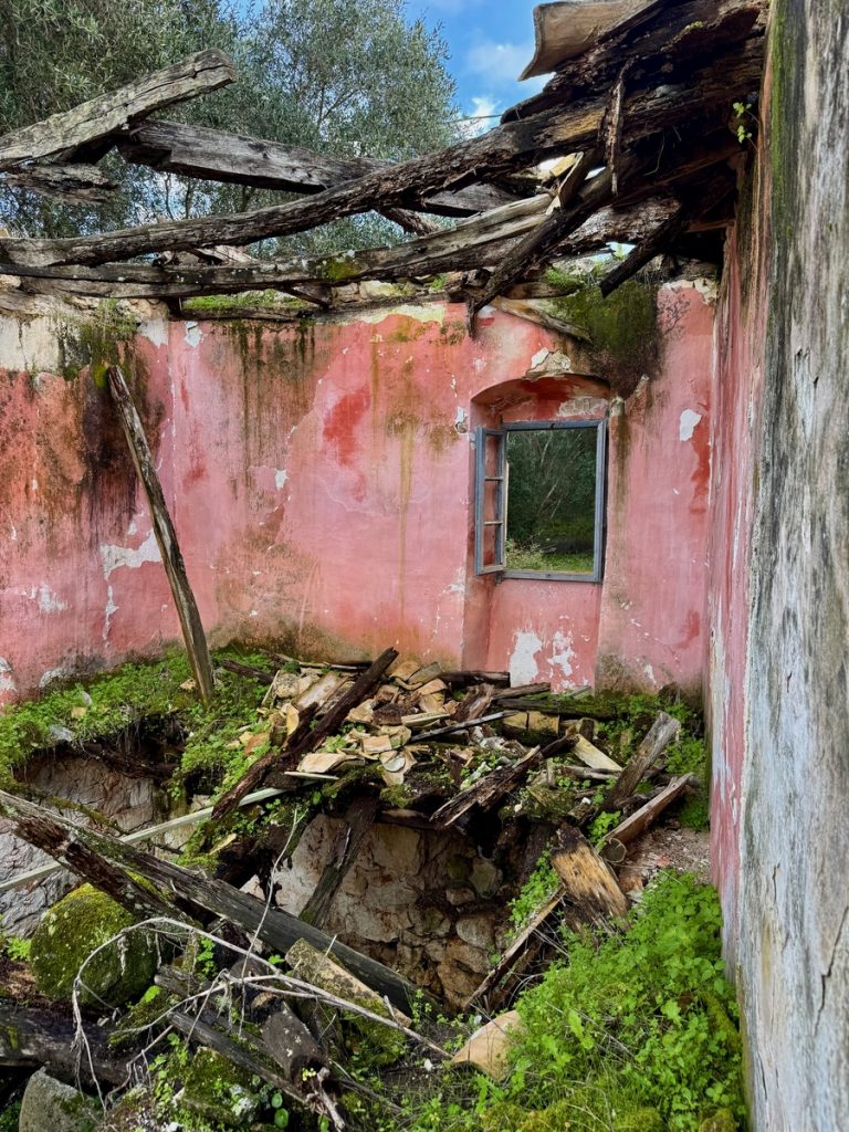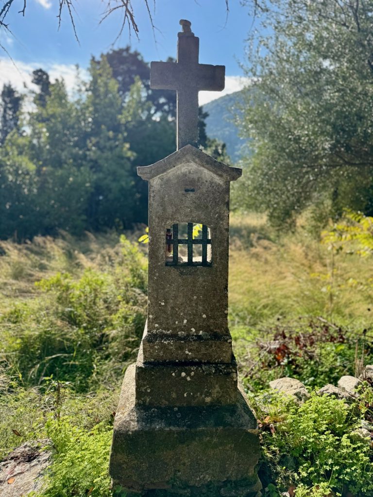 Um die Zeit bis zum Ende der Videokonferenz zu nutzen, macht sie einen Abstecher vom Weg zur Kirche Agios Spyridon und in den Ort Germenata. Beides befindet sich in griechisch-morbidem Zustand. Vermutlich wegen einer Leckage im Dach, wurde die Kirche mit einer Plane überzogen, die unterdessen allerdings in Fetzen an den Seiten herunterhängt. Betreten kann man sie nicht – abgeschlossen. Aber durch das Fenster der Eingangstür sind die bunten Scheiben der Fenster zu erkennen, die auch bei genauer Betrachtung von außen sichtbar sind. Der Friedhof rundherum besteht aus zum Teil sehr alten Familiengräbern, die mit Gusseisernen Zäunen abgetrennt wurden. Einige der alten Grabdeckel sind eingebrochen. Über einen weiteren Eselsweg ist die allein liegende Kirche mit dem kleinen Ort „Germenata“ verbunden. Offensichtlich wird dieser Weg jedoch wenig benutzt, denn er ist teilweise von umgestürzten Bäumen und herabgefallenen Ästen versperrt. Mit etwas Kletterei, sind aber auch diese Hindernisse zu überwinden. In dem kleinen Ort ist das eine oder andere Haus sogar noch bewohnt, aber es ist offensichtlich, dass die meisten Fenster und Türen seit vielen Jahren nicht geöffnet wurden.