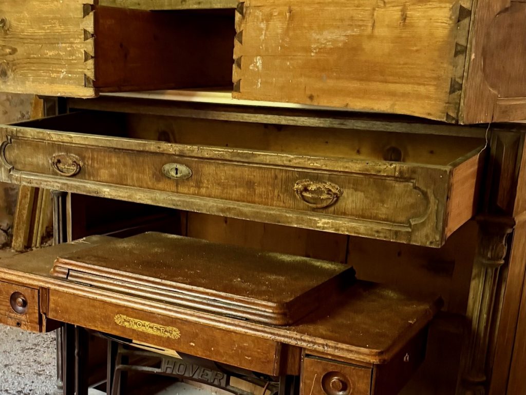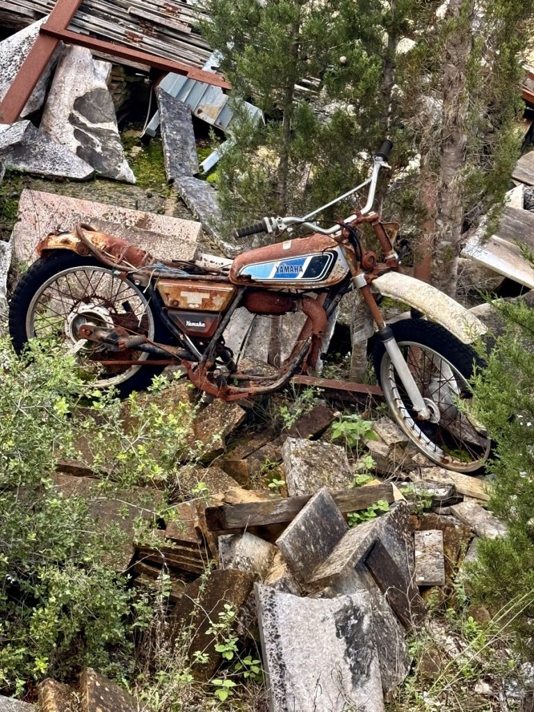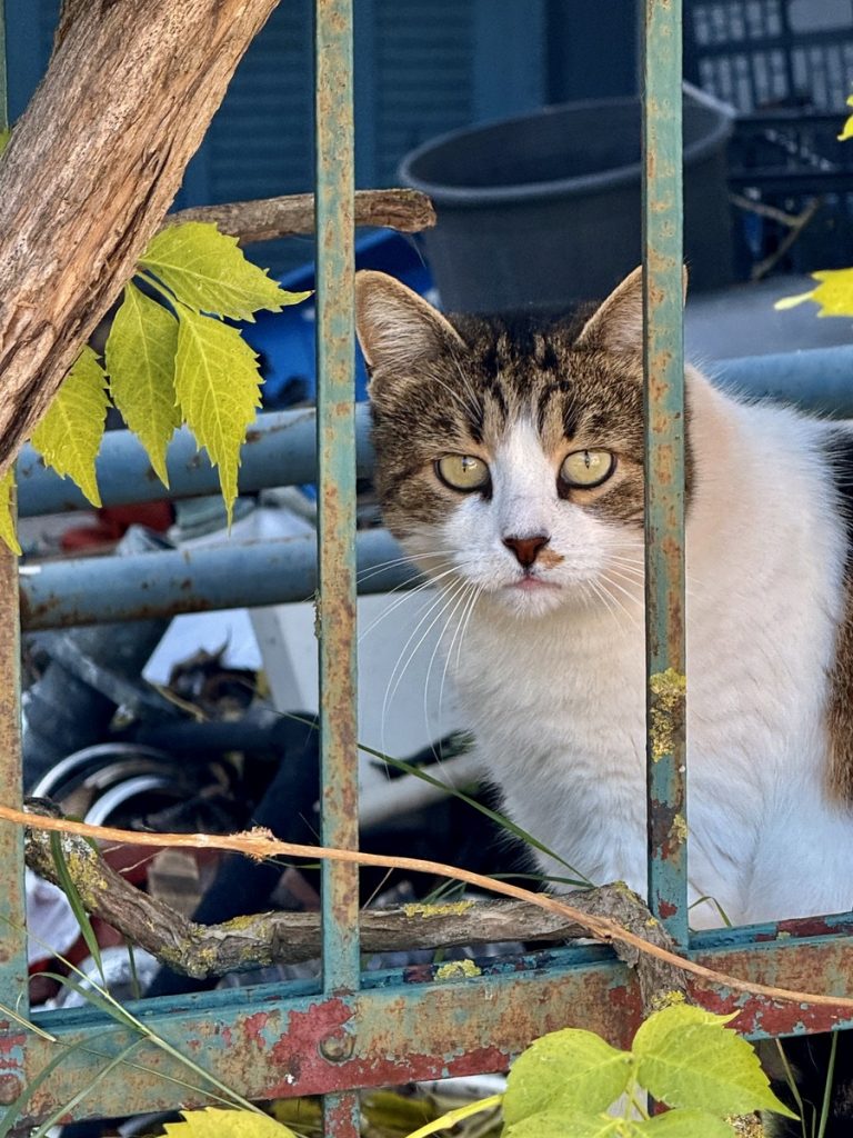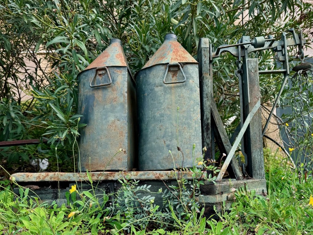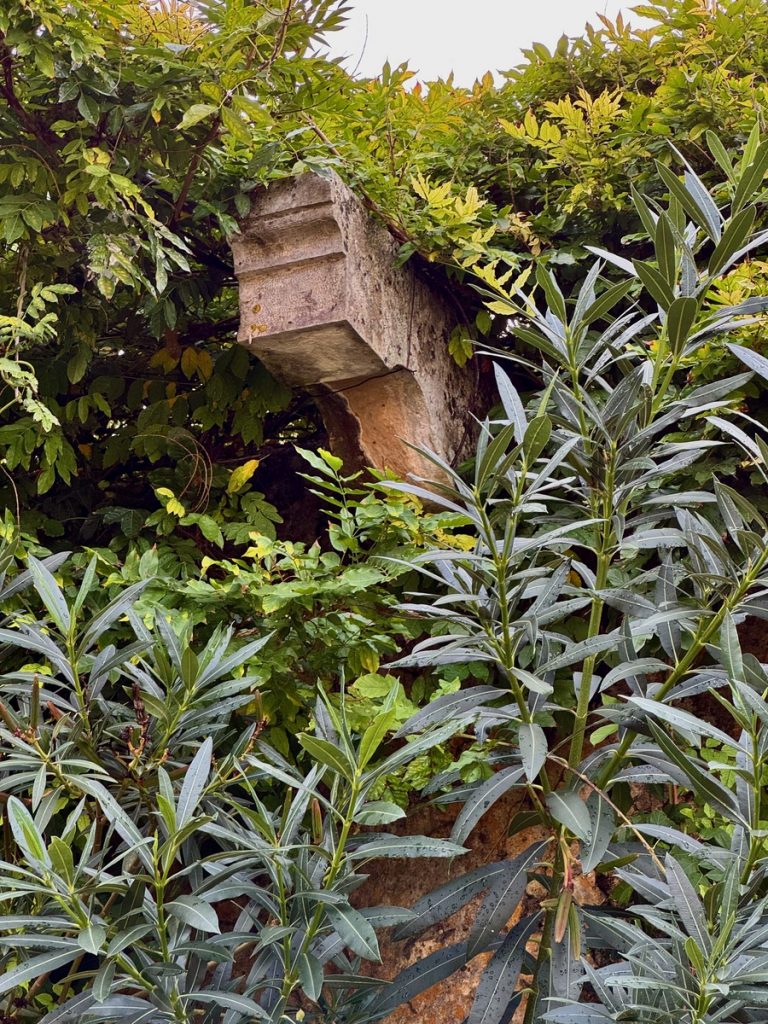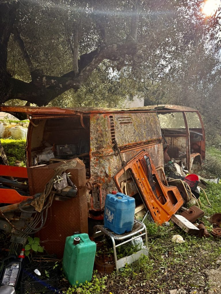 Um die Zeit bis zum Ende der Videokonferenz zu nutzen, macht sie einen Abstecher vom Weg zur Kirche Agios Spyridon und in den Ort Germenata. Beides befindet sich in griechisch-morbidem Zustand. Vermutlich wegen einer Leckage im Dach, wurde die Kirche mit einer Plane überzogen, die unterdessen allerdings in Fetzen an den Seiten herunterhängt. Betreten kann man sie nicht – abgeschlossen. Aber durch das Fenster der Eingangstür sind die bunten Scheiben der Fenster zu erkennen, die auch bei genauer Betrachtung von außen sichtbar sind. Der Friedhof rundherum besteht aus zum Teil sehr alten Familiengräbern, die mit Gusseisernen Zäunen abgetrennt wurden. Einige der alten Grabdeckel sind eingebrochen. Über einen weiteren Eselsweg ist die allein liegende Kirche mit dem kleinen Ort „Germenata“ verbunden. Offensichtlich wird dieser Weg jedoch wenig benutzt, denn er ist teilweise von umgestürzten Bäumen und herabgefallenen Ästen versperrt. Mit etwas Kletterei, sind aber auch diese Hindernisse zu überwinden. In dem kleinen Ort ist das eine oder andere Haus sogar noch bewohnt, aber es ist offensichtlich, dass die meisten Fenster und Türen seit vielen Jahren nicht geöffnet wurden.