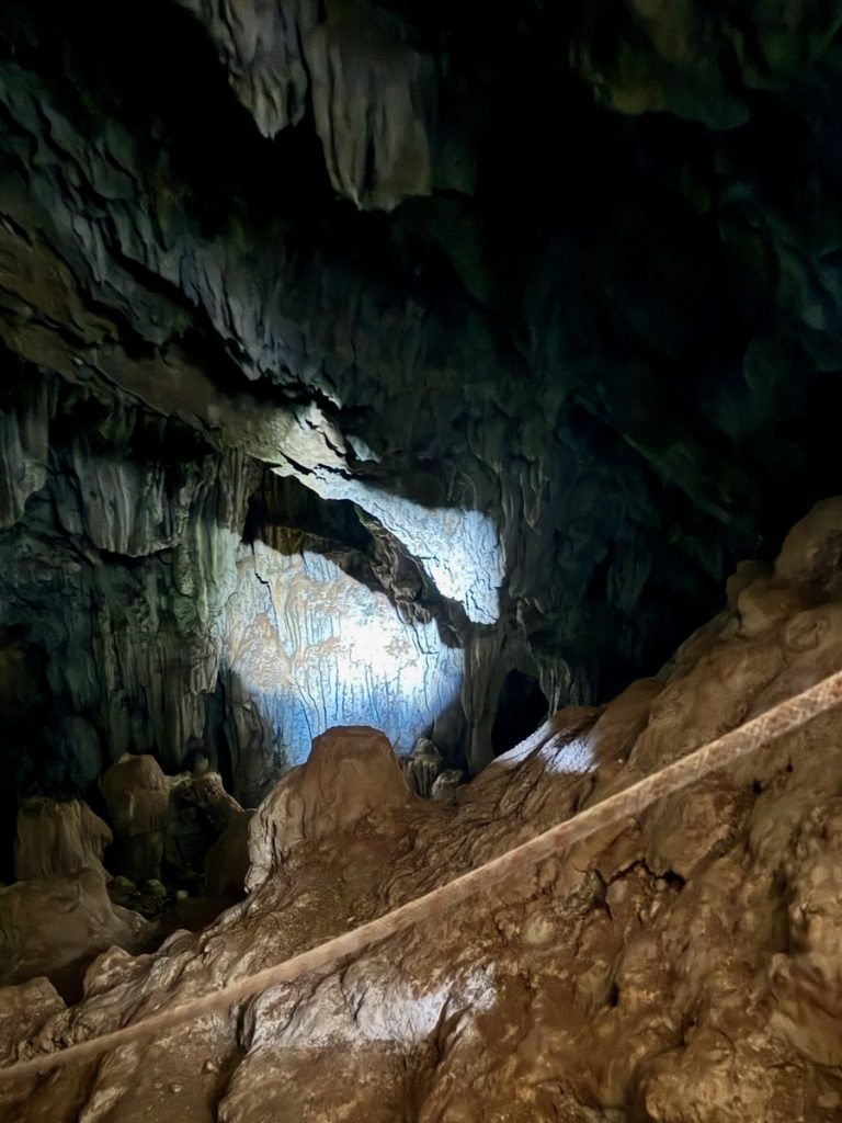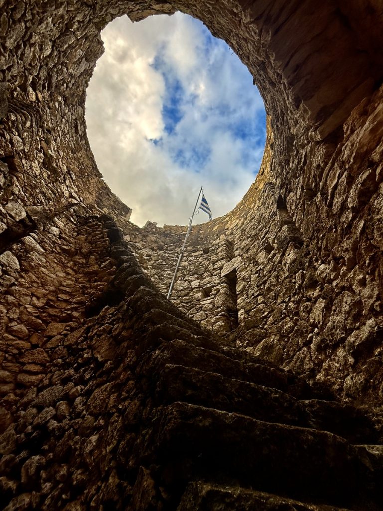 Eine Tür mit Vorhängeschloss scheint den Eingang für Besucher zu versperren. Aber bei genauerem Hinsehen, stellen wir fest, dass der Riegel nirgends hineingreift. Die Tür ist nur angelehnt. Wir krabbeln hinein. Ein fester Tampen ermöglicht den tieferen Abstieg in die Höhle, in der es allerdings stockfinster ist. Daher belassen wir es bei einem kurzen Blick hinab mit der Handykamera. Später lesen wir im Internet, dass man hier mal über eine Leiter zehn Meter in die Tiefe steigen und die mit Stalaktiten übersäte „eigentliche“ Höhle der Nymphen erreichen konnte. Archäologische Untersuchungen hatten sich der zweiten Ebene der Höhle (die auch von Homer erwähnt wird) genähert, wurden jedoch vor einigen Jahren plötzlich abgebrochen, sodass heute nur noch der Eingang zur Höhle der Nymphen für Besucher zugänglich ist.