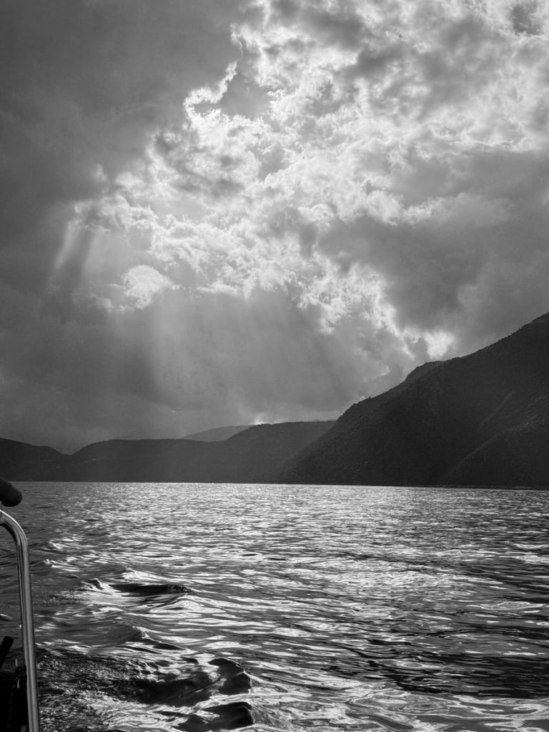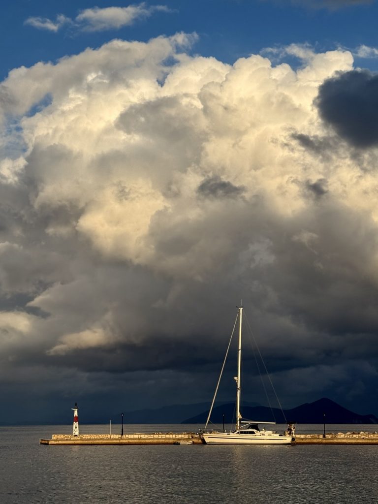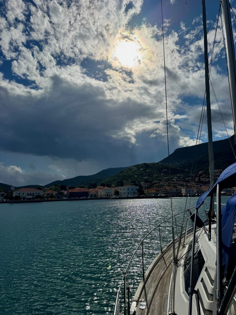 Aufgrund der angesagten Schlechtwetterfront hatten wir Schutz in der Bucht von Vathy auf Ithaka gesucht – ein weiser Entschluss. Zum einen bekommen wir hier deutlich weniger von den Gewittern ab, da sie meist nördlich oder südlich an uns vorbeiziehen. Zum anderen bietet der Ankergrund in der Bucht ausgezeichneten Halt, sodass wir auch bei Böen bis zu 25 Knoten sicher liegen.