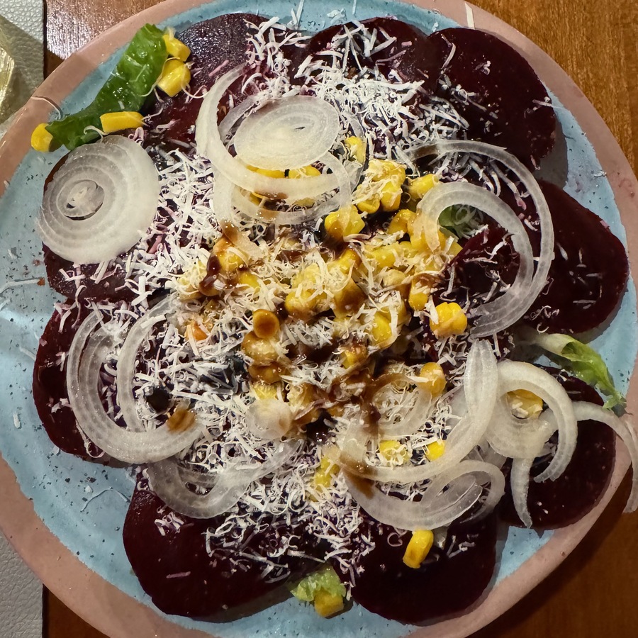 Da wir das Boot heute nicht verlassen mögen, zaubert Werner aus den Resten, die der Kühlschrank so hergibt ein Carpaccio aus Rote Bete, Zwiebeln, Mais und Parmesan. Dazu gibt es die aufgebratenen Reste des Kartoffelbreis von gestern mit einem pikanten Topping aus Paprika, Zwiebeln, Tomaten und Schafkäse. Ein kreativer Smutje ist an Bord Gold wert!