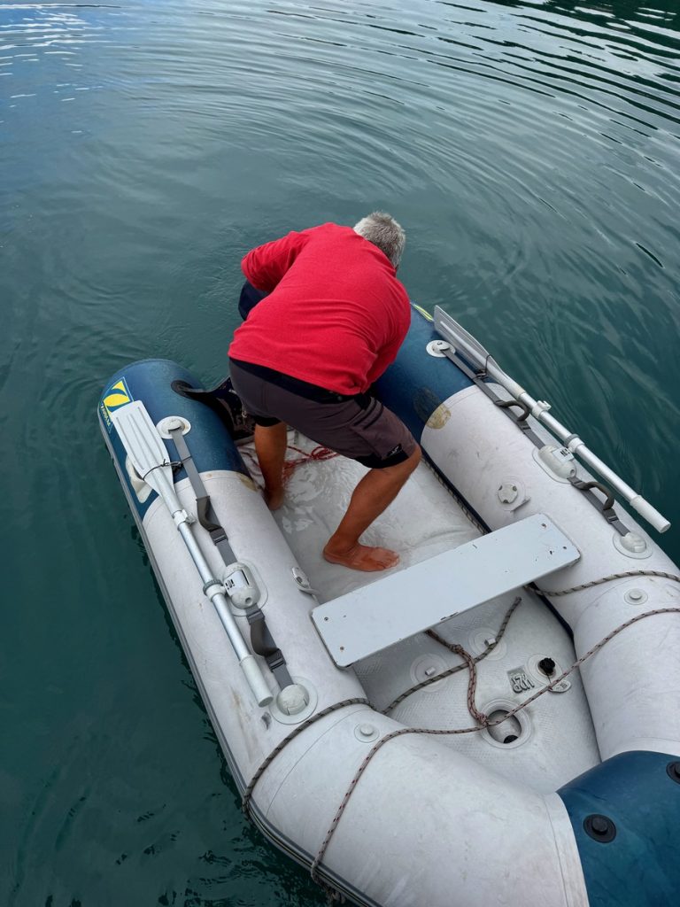 Währenddessen schüttet es draußen zur Abwechslung mal wieder wie aus Kübeln. Unser Dinghi verwandelt sich langsam aber sicher in eine Badewanne. In einer Regenpause holen wir den Außenborder wieder an Bord und kippen das Regenwasser aus, damit wir anschließend zum Einkaufen an Land fahren können. An der nahegelegenen Tankstelle besorgen wir Benzin für den Außenborder, der, seit wir mit der Anschaffung eines E-Außenborders gedroht haben, wieder recht zuverlässig funktioniert. Dann folgt ein Abstecher in den Supermarkt zur Aufstockung der Frischvorräte.