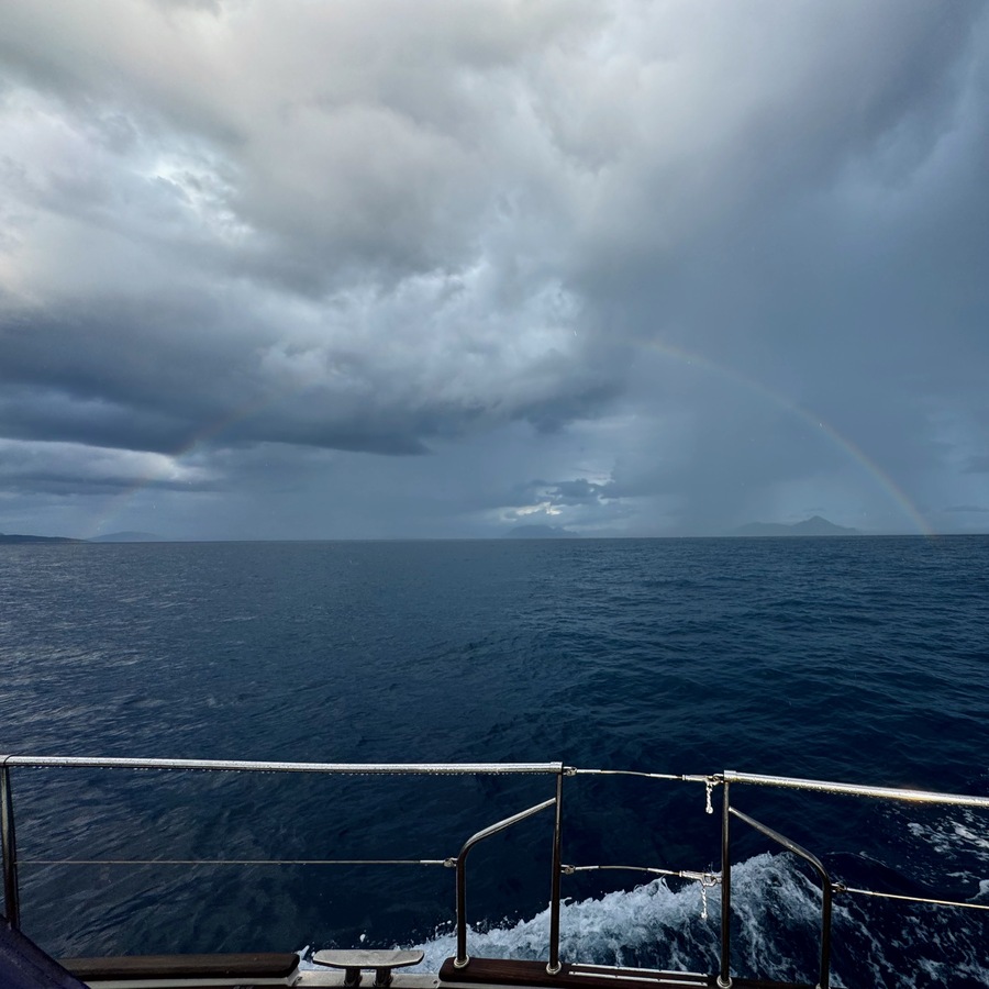Wieder an Bord entscheiden wir kurzfristig doch noch auszulaufen. Der Wind ist zwar fast vollständig eingeschlafen, aber die Batterien freuen sich über Motorfahrt und auch warmes Wasser wird so produziert. Unterwegs holen uns dann doch noch die Regenwolken ein und es gibt einen kurzen aber heftigen Regenguss. Danach schaut die Sonne zwischen den Wolken heraus und zaubert einen schönen Regenbogen. Es steht noch eine stattliche Welle von gestern, die Venga! ordentlich rollen lässt. Sie kommt aus Süden und wir hoffen, dass sie an unserer Zielbucht vorbeiläuft. Unser Ziel heißt Frikes und befindet sich nur acht Seemeilen nördlich.