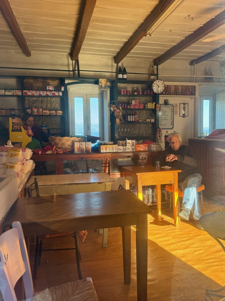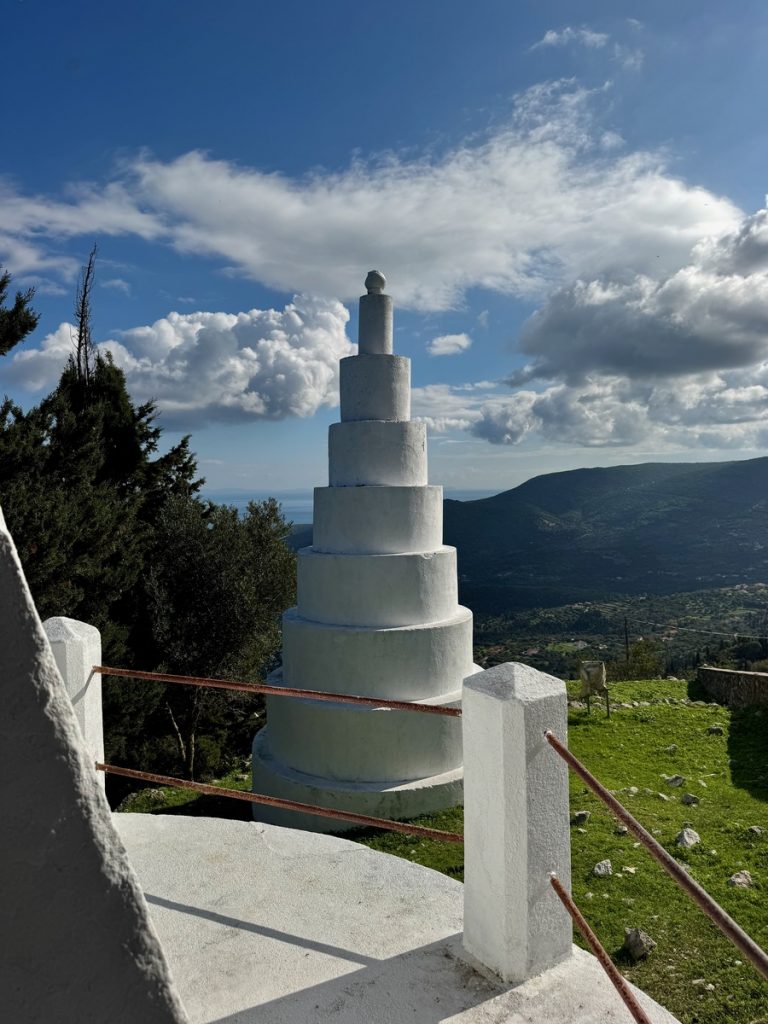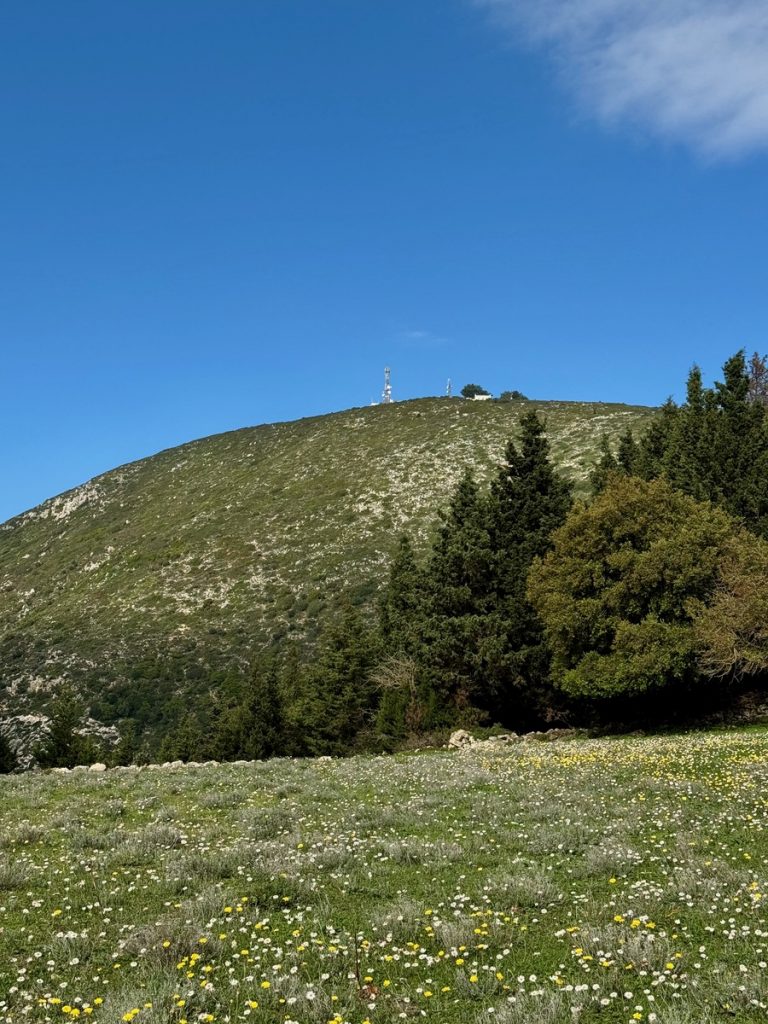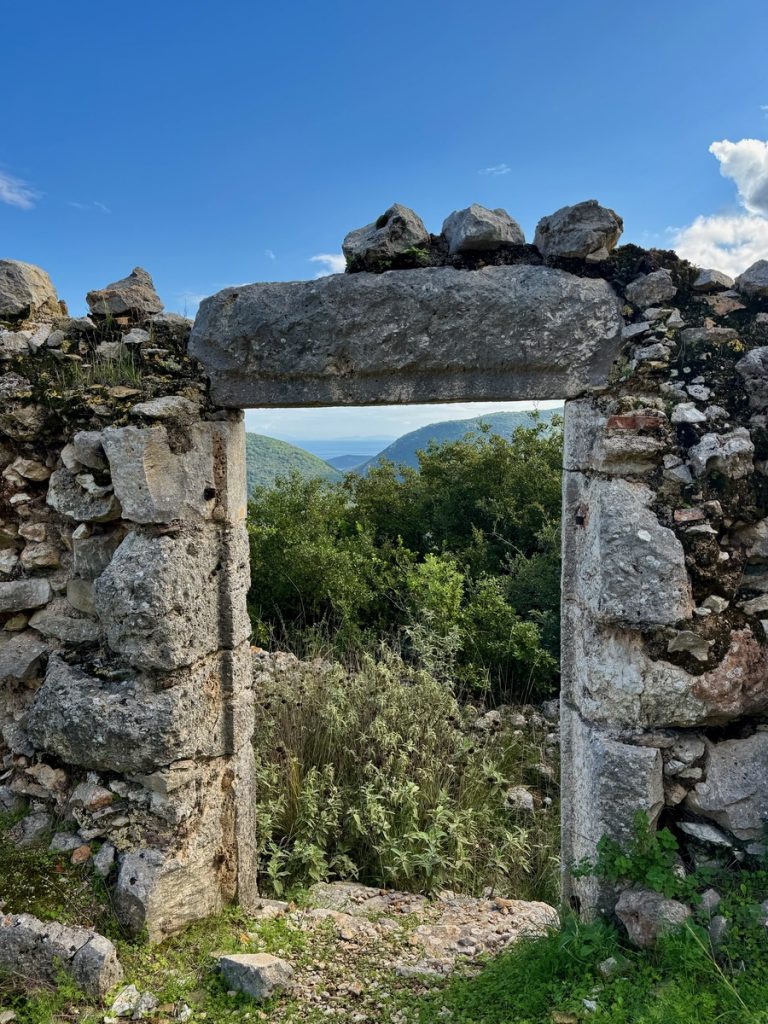 Unsere Wanderung ist aber noch lange nicht beendet. Der Weg führt uns weiter hinauf. Erst in den malerisch auf einem Bergrücken gelegenen Ort „Exogi“, der zum einen mit reichlich Kirchen (wir haben 4 gezählt) und deutlich zahlreicheren, zum Verkauf stehenden Ruinen gekennzeichnet ist. Die Gebäude mit den schönsten Lagen und Weitblick in drei Himmelsrichtungen sind bereits weitgehend in neuen Händen und liebevoll restauriert. An der am höchsten Punkt gelegenen Kirche legen wir unsere Mittagsrast ein, bevor wir den letzten Anstieg bis zu den Sendeanlagen auf dem Gipfel in Angriff nehmen.