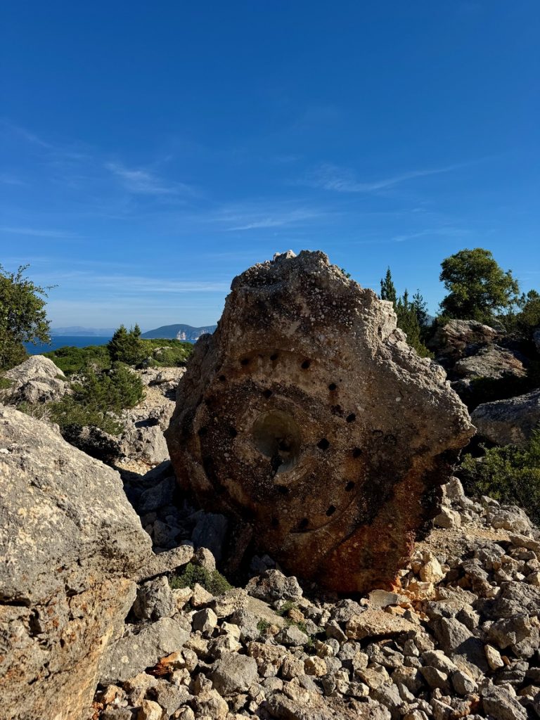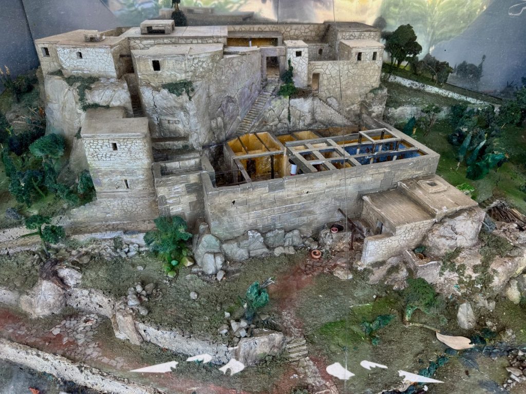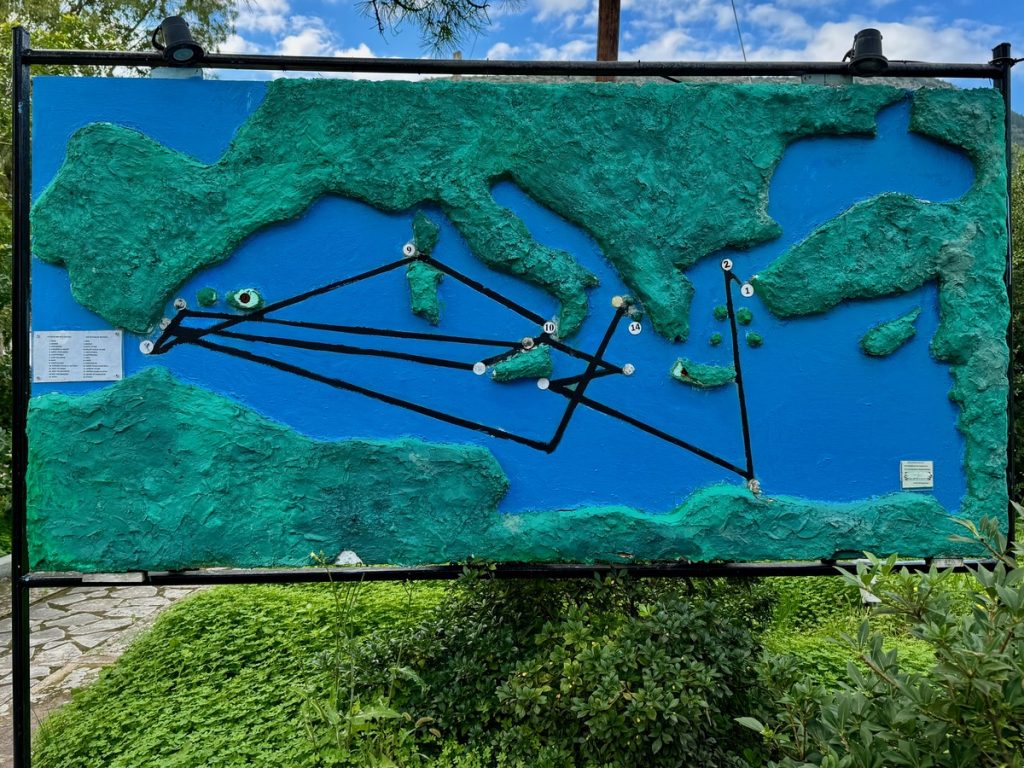 Barbara hat eine Wanderung ab Hafen zu Homers Schule und dem Odysseus Palast geplant. Nach dem Morgenkaffee machen wir uns auf den Weg. Nach zwei (fast) bewegungslosen Tagen tut es richtig gut, wieder zu laufen. Der Weg führt anfangs mit wenig Steigung durch das Tal, das sich im Norden der Insel von Frikes an der Ostküste bis zur Polis Beach an der Westküste zieht. Nach zwei Kilometern biegt der Weg nach Norden ab und die Steigung beginnt. Die Ruinen von Homers Schule und dem Odysseus Palast liegen auf knapp 200m über dem Meer unterhalb des Bergdorfes Exogi. Was es mit diesen Ruinen genau auf sich hat und worum es sich wirklich handelt, ist unter den Wissenschaftlern strittig. Hier auf Ithaka folgt man verständlicherweise der Idee, dass es sich um die Ruinen von Odysseus‘ Palast handelt. Dass es sich um eine Kultstätte für die Verehrung Odysseus‘ handeln könnte, ist das Mindeste. Im benachbarten Dorf „Stavio“ findet man in der Dorfmitte in einem kleinen Park ein Modell des Palastes mit Bezügen zu dem, was man noch heute vor Ort sehen kann, wie ein rundes Loch im Boden, das ein mykenischer Brunnen gewesen sein könnte und den verschiedenen in den Fels eingeschlagenen Treppen. Auch die Irrfahrt des Odysseus durch das Mittelmeer und wichtige Orte zur Odysseus-Mythologie auf Ithaka sind auf großen, kindlich wirkenden Karten dargestellt und eine Büste fehlt natürlich auch nicht. Das Modell ist zumindest sehr hilfreich, sich den Palast vorzustellen, was auch immer er beherbergte. In diesem Jahr wurden noch Fliesen entdeckt, die den Namen Odysseus tragen und zumindest die Verehrung für ihn hier auf der Insel bekräftigen. Die ältesten Fundstücke der Ausgrabungsstelle datieren auf die mykenische Zeit und damit auf das 13. Jahrhundert v.Chr. Deshalb brachte ihr Entdecker Tanasis Papadopoulos den Bau mit dem bei Homer beschriebenen Palast des mythischen Odysseus in Verbindung. Das Modell des rekonstruierten Palastes ist in jedem Fall hilfreich, aus den vorhandenen Resten dieses Gebäude in der Fantasie in den Himmel wachsen zu lassen. Schade, dass die Infotafeln nicht in der Ausgrabung aufgestellt wurden.
